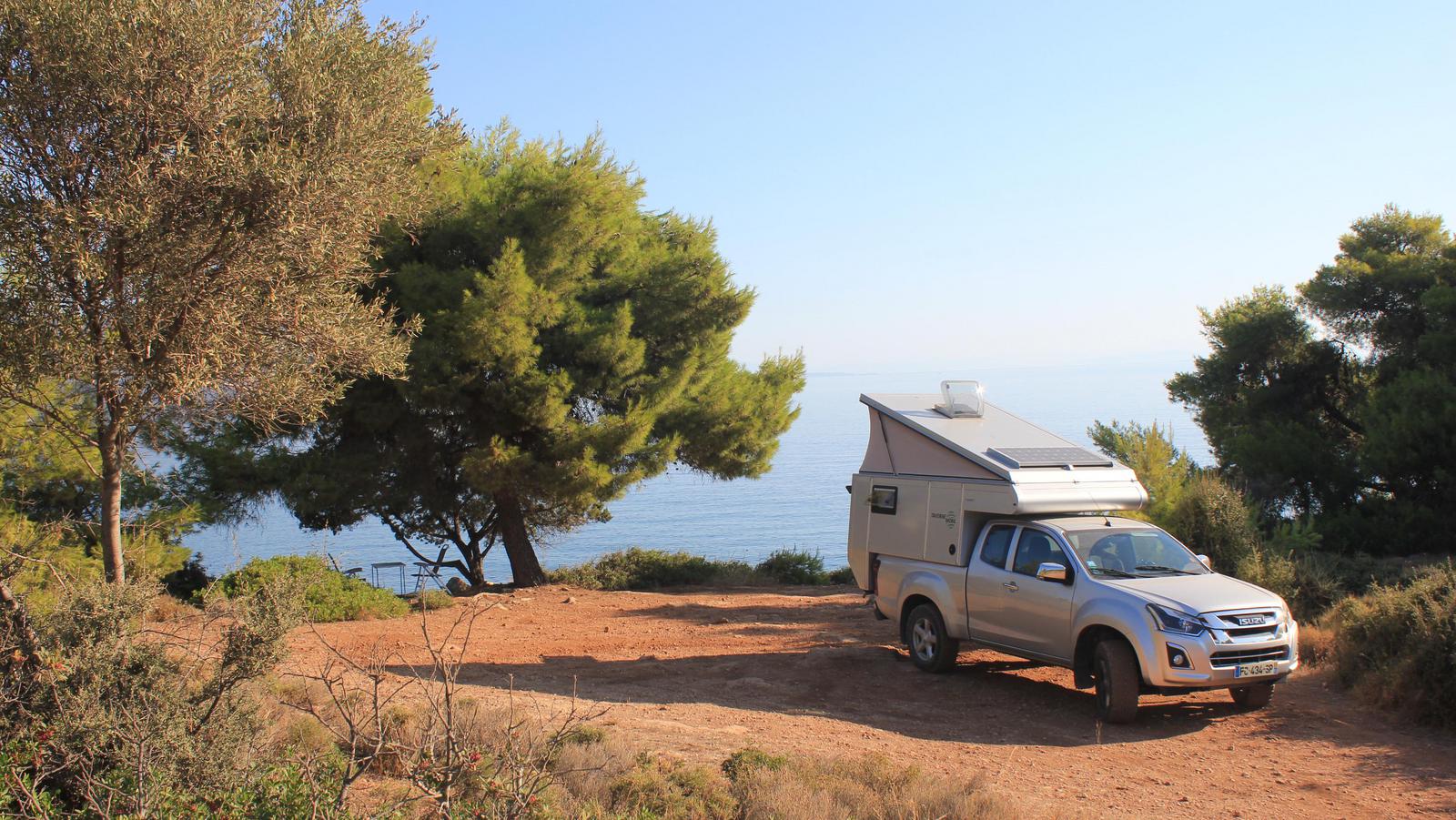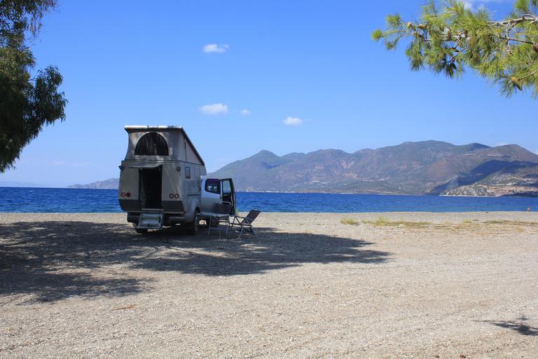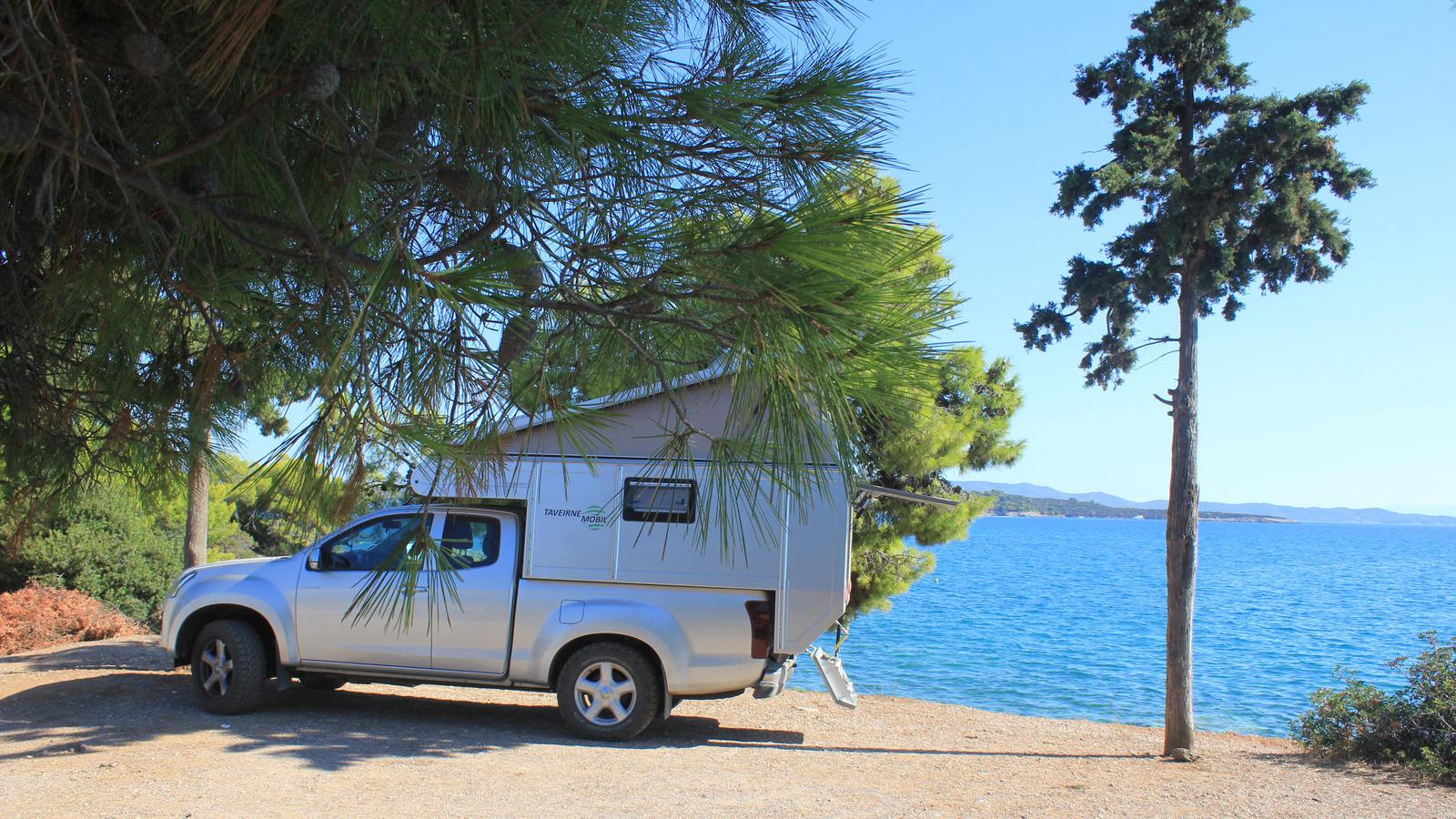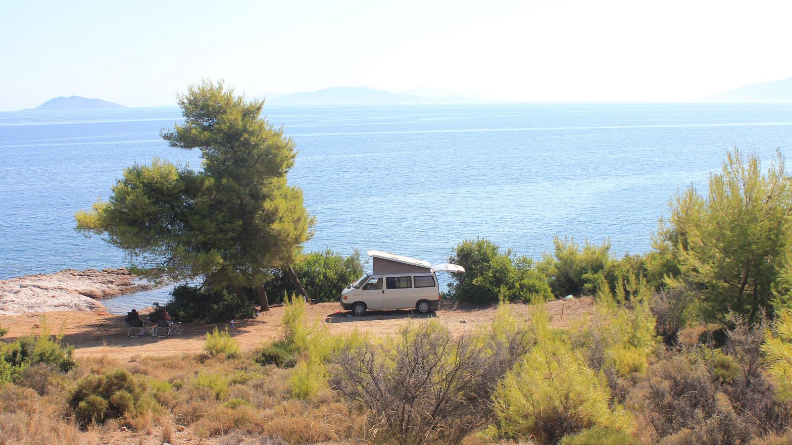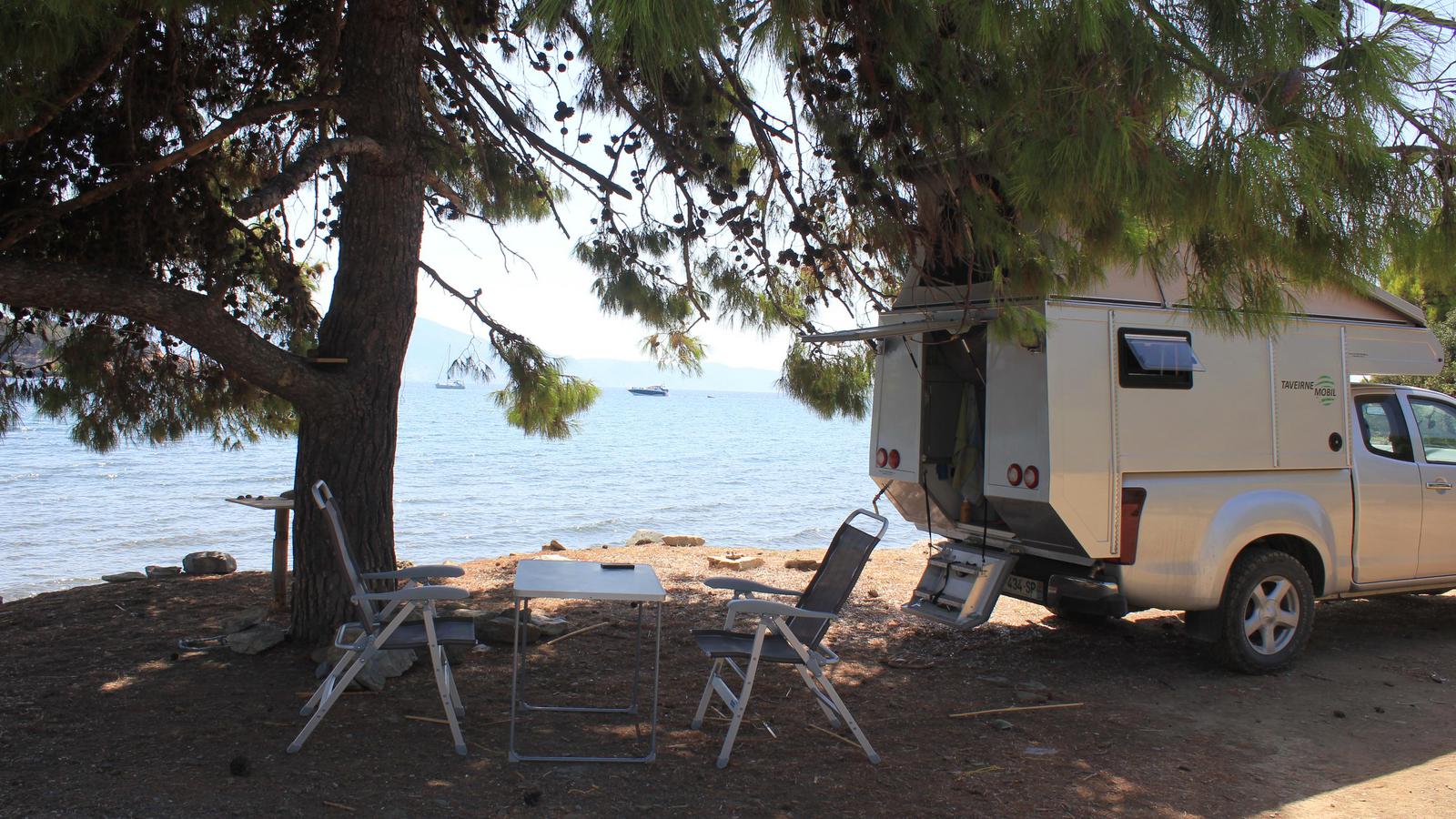 Nous retrouvons notre cellule et continuons de suivre la côte en direction de Galatas. Nous nous arrêtons à mi-chemin sur un spot P4N. Un voyageur indique qu'il y est resté 48 jours en période de confinement.