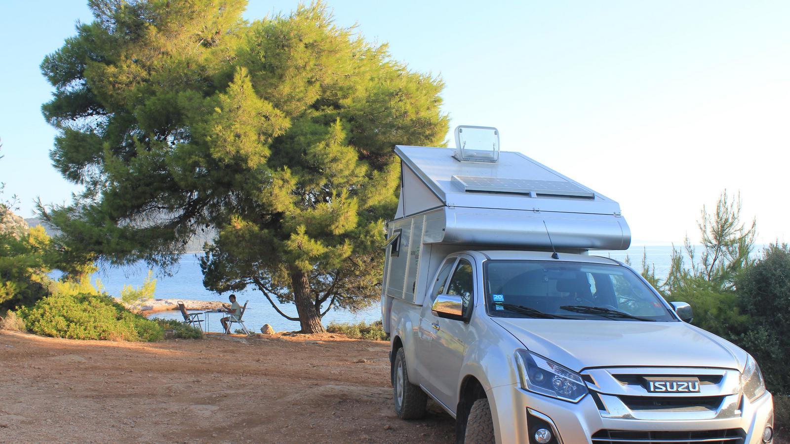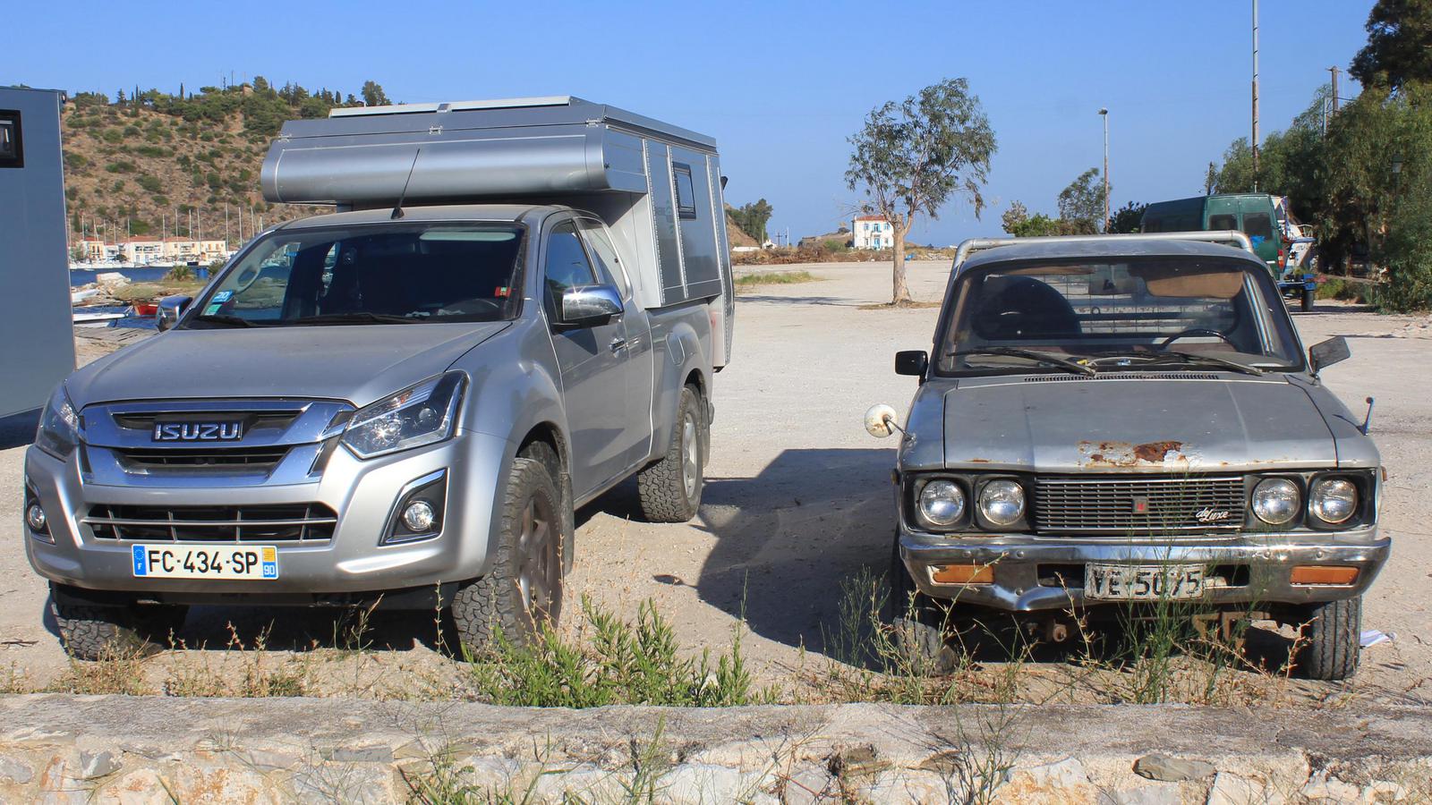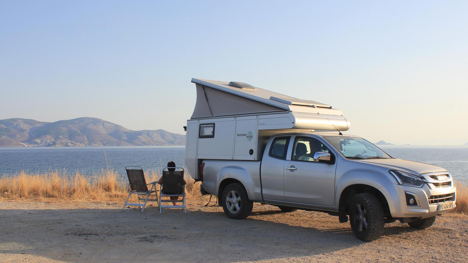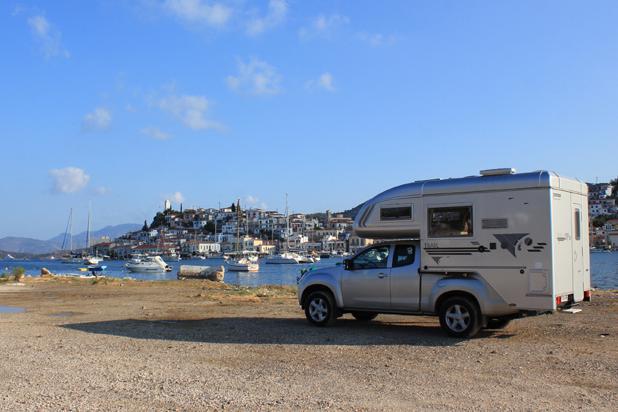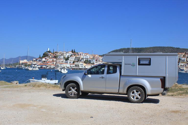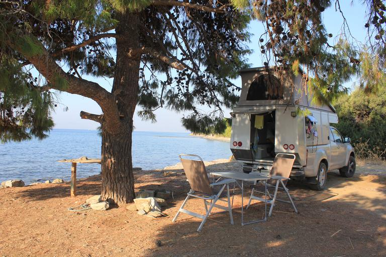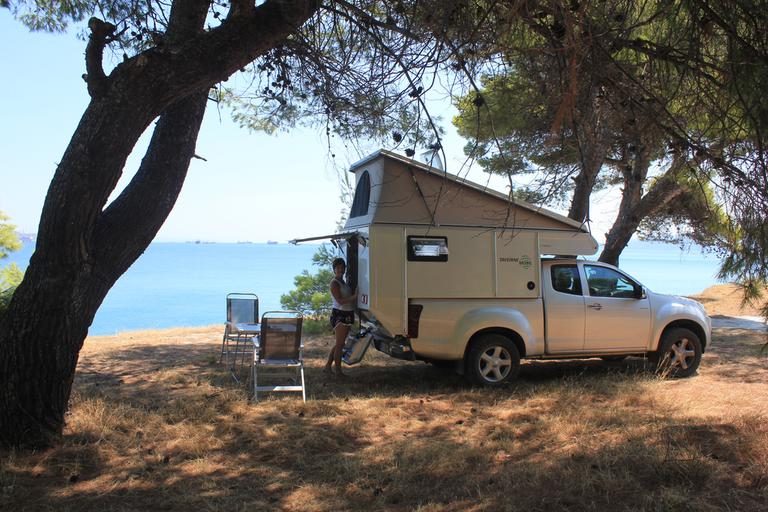 Nous retrouvons notre cellule et continuons de suivre la côte en direction de Galatas. Nous nous arrêtons à mi-chemin sur un spot P4N. Un voyageur indique qu'il y est resté 48 jours en période de confinement.