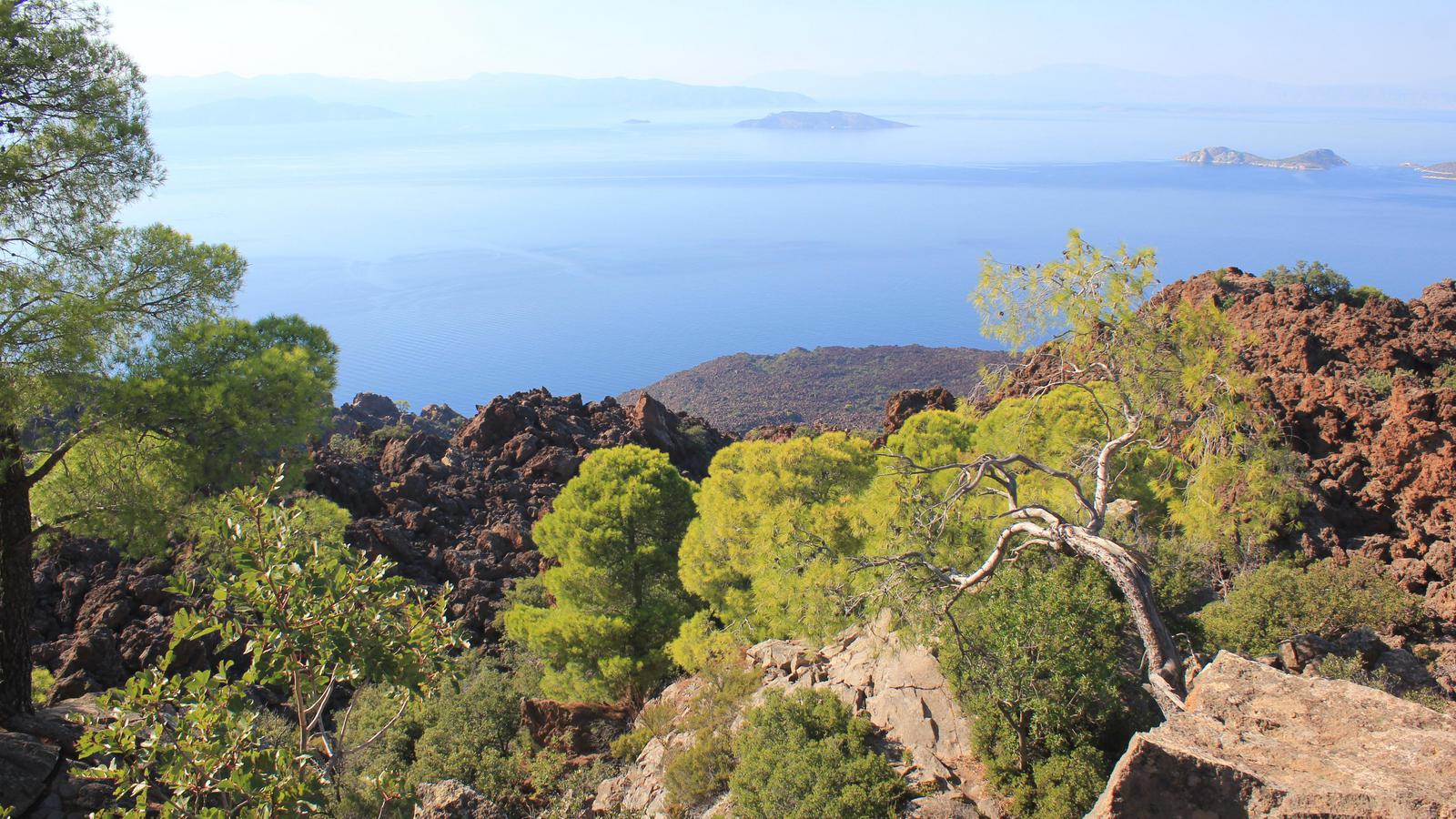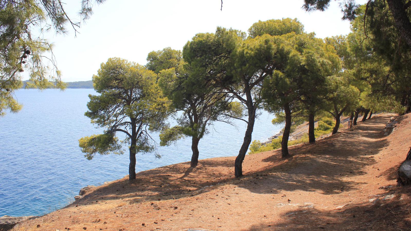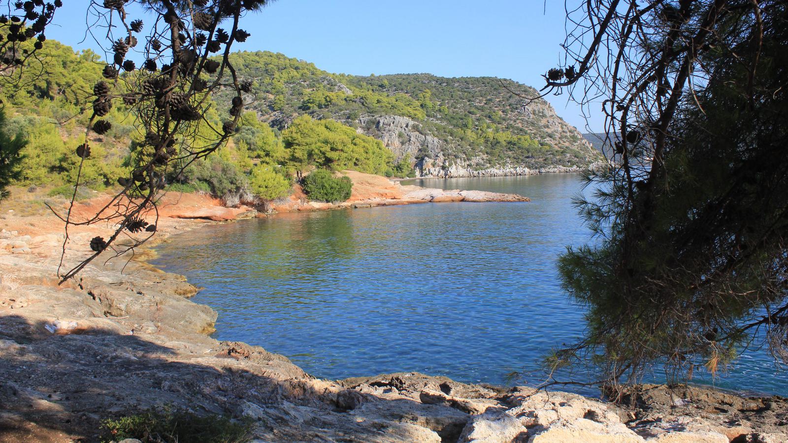 Nous atteignons tout de même l'endroit indiqué. Nous sommes sous une pinède, au bord d'une petite falaise au-dessus de la mer Egée, juste au débouché du canal. Endroit parfait pour un pique-nique.