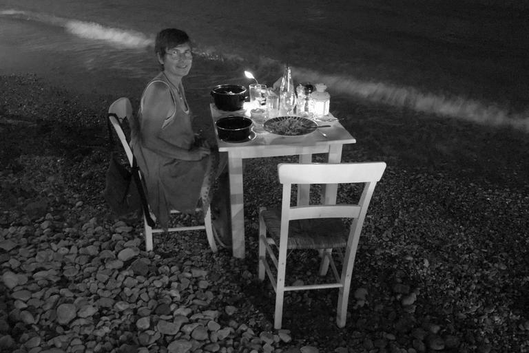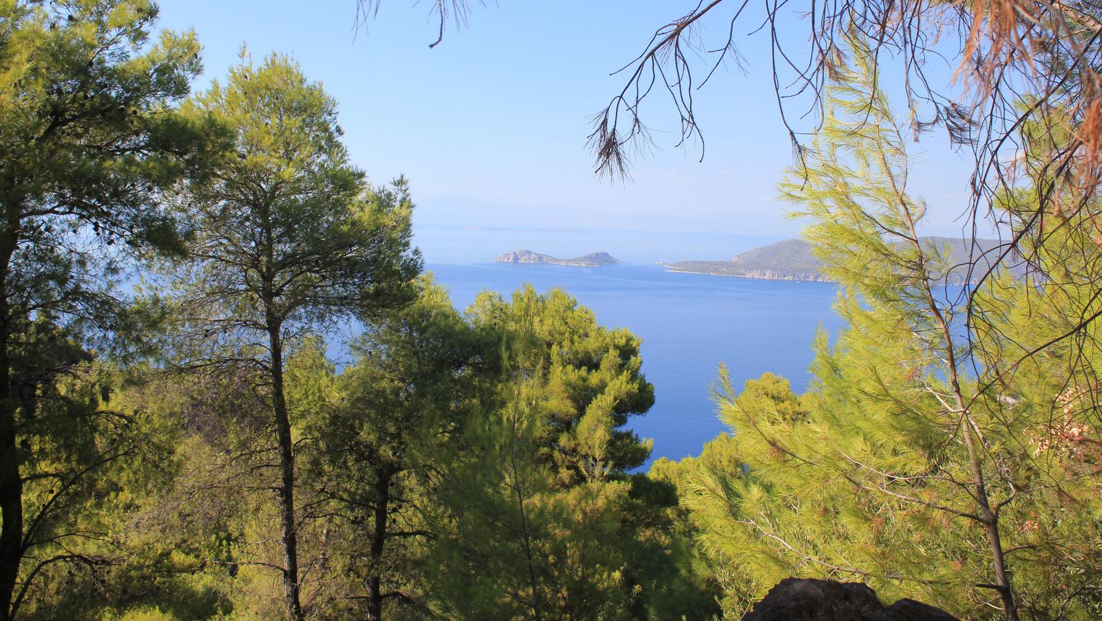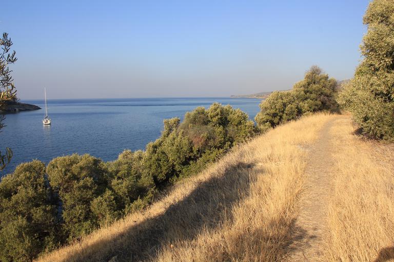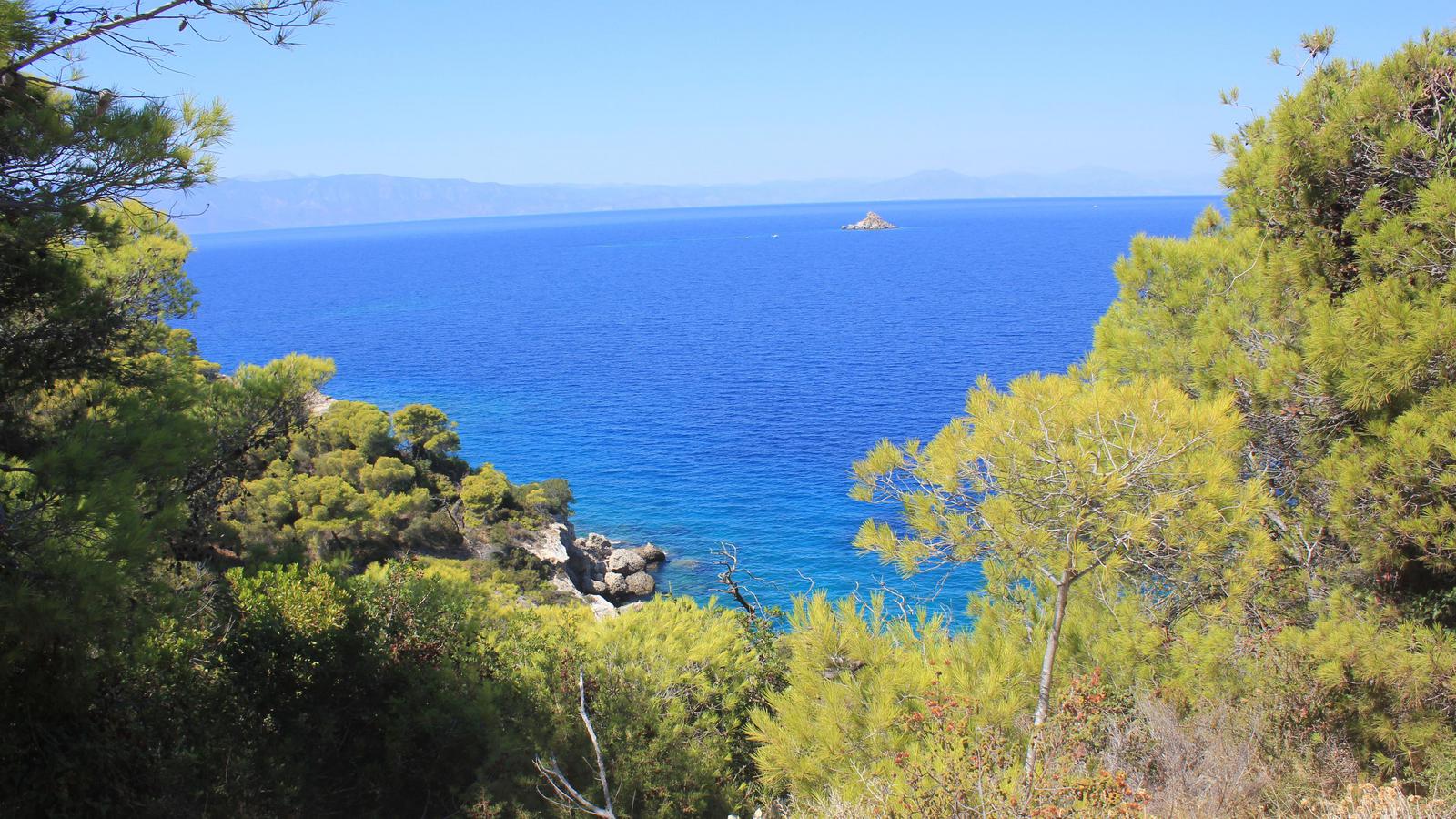 Nous atteignons tout de même l'endroit indiqué. Nous sommes sous une pinède, au bord d'une petite falaise au-dessus de la mer Egée, juste au débouché du canal. Endroit parfait pour un pique-nique.