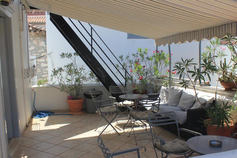 Nous partons à la recherche de l'hôtel Filenia. Google Maps n'a pas la bonne localisation de celui-ci, nous n'avons aucune adresse et isa finit par demander notre chemin "à l'ancienne" dans une pâtisserie. Une fois sur place, nous entrons dans le patio, il n'y a personne. Je téléphone, une dame arrive aussitôt et nous donne notre chambre. Elle est à l'étage avec un joli salon extérieur ombragé.