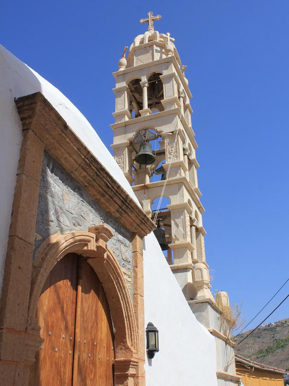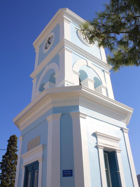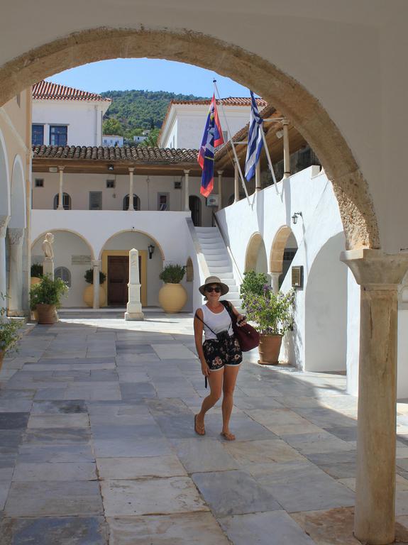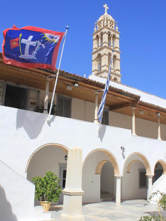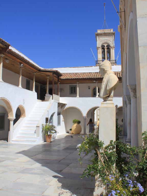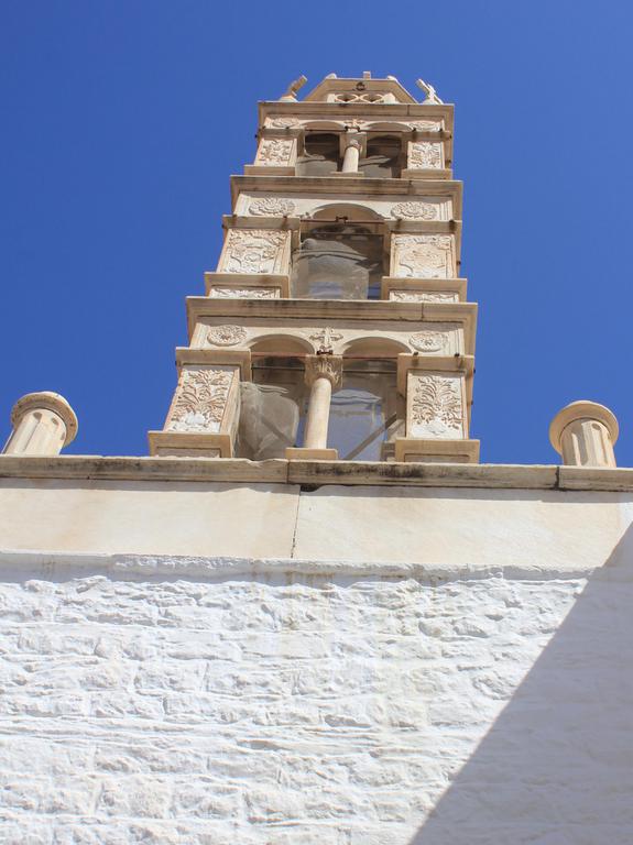 Nous avons choisi de prendre la navette de 13h00. En chemin vers l'embarcadère, nous poussons la porte de l'église Kimisi Theotokou. Nous découvrons un joli cloître, au sol recouvert de grandes dalles de marbre, surplombé par deux belles tours dont la fameuse tour de l'horloge bien visible lorsque l'on arrive sur le port.