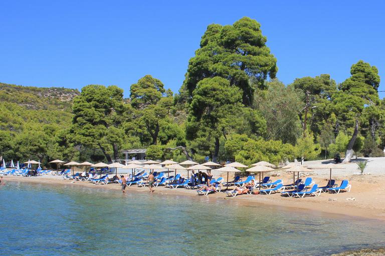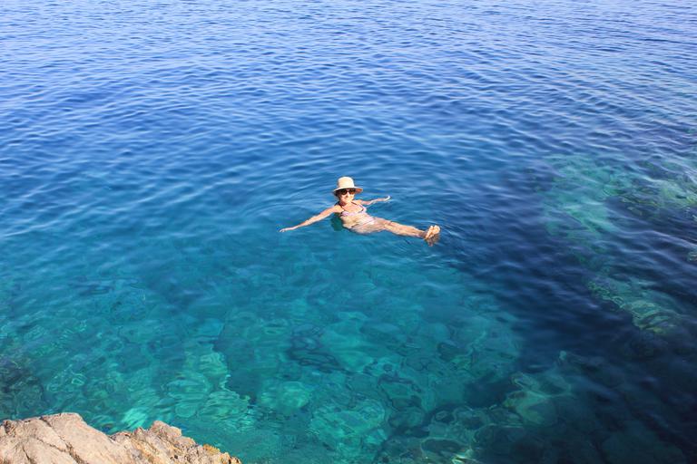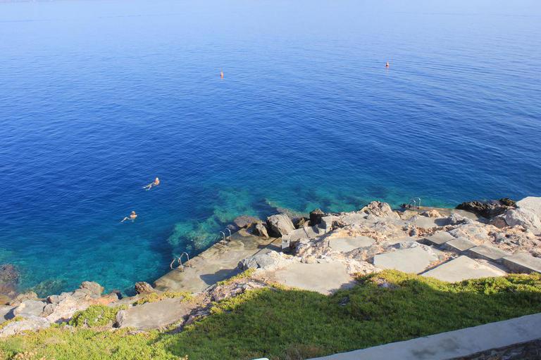Nous reprenons notre promenade, passons Vlychos et son petit port, et marchons jusqu'à la plage de Plakès, une petite crique au pied d'un hôtel de luxe. Nous nous baignons enfin.