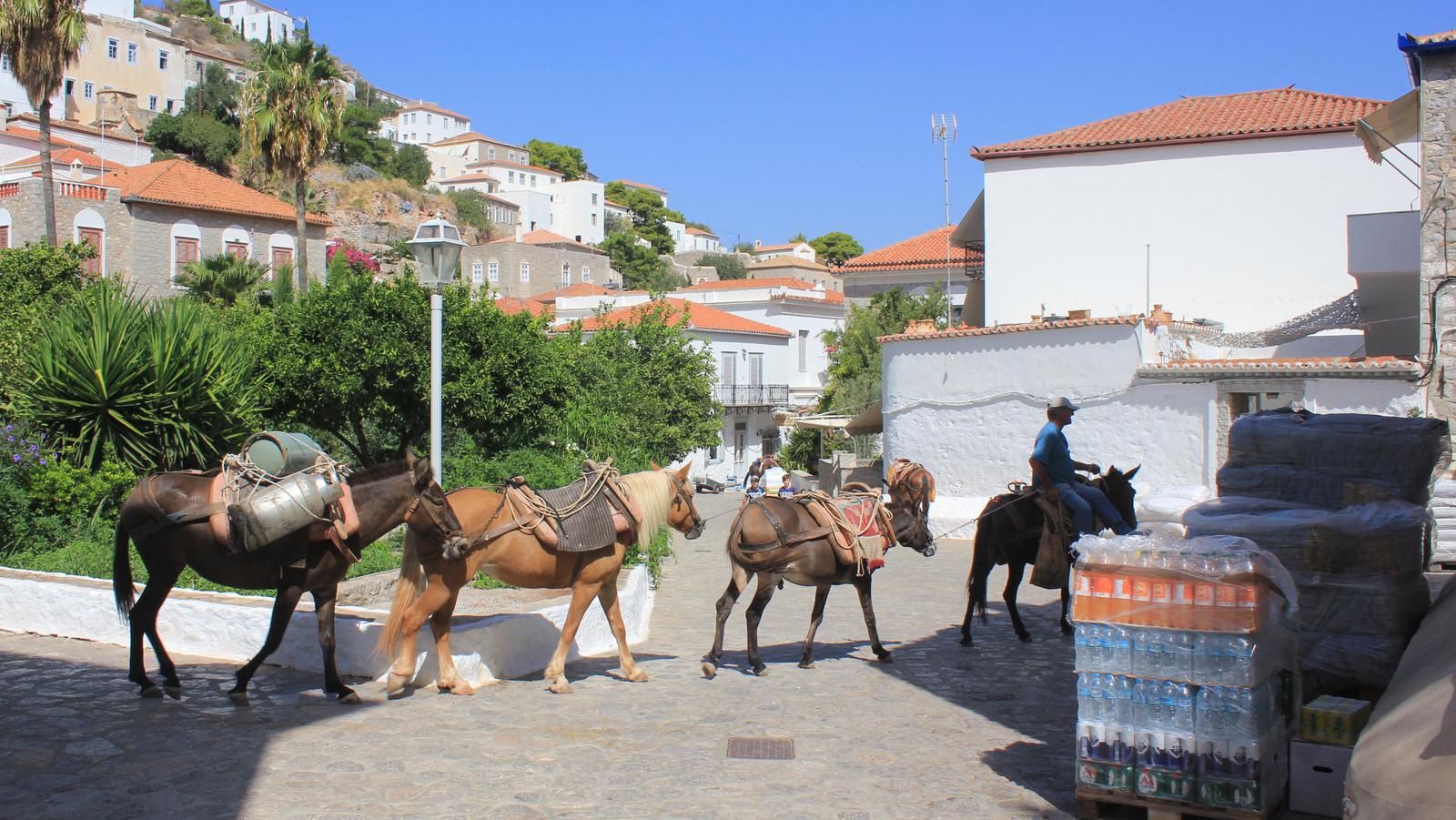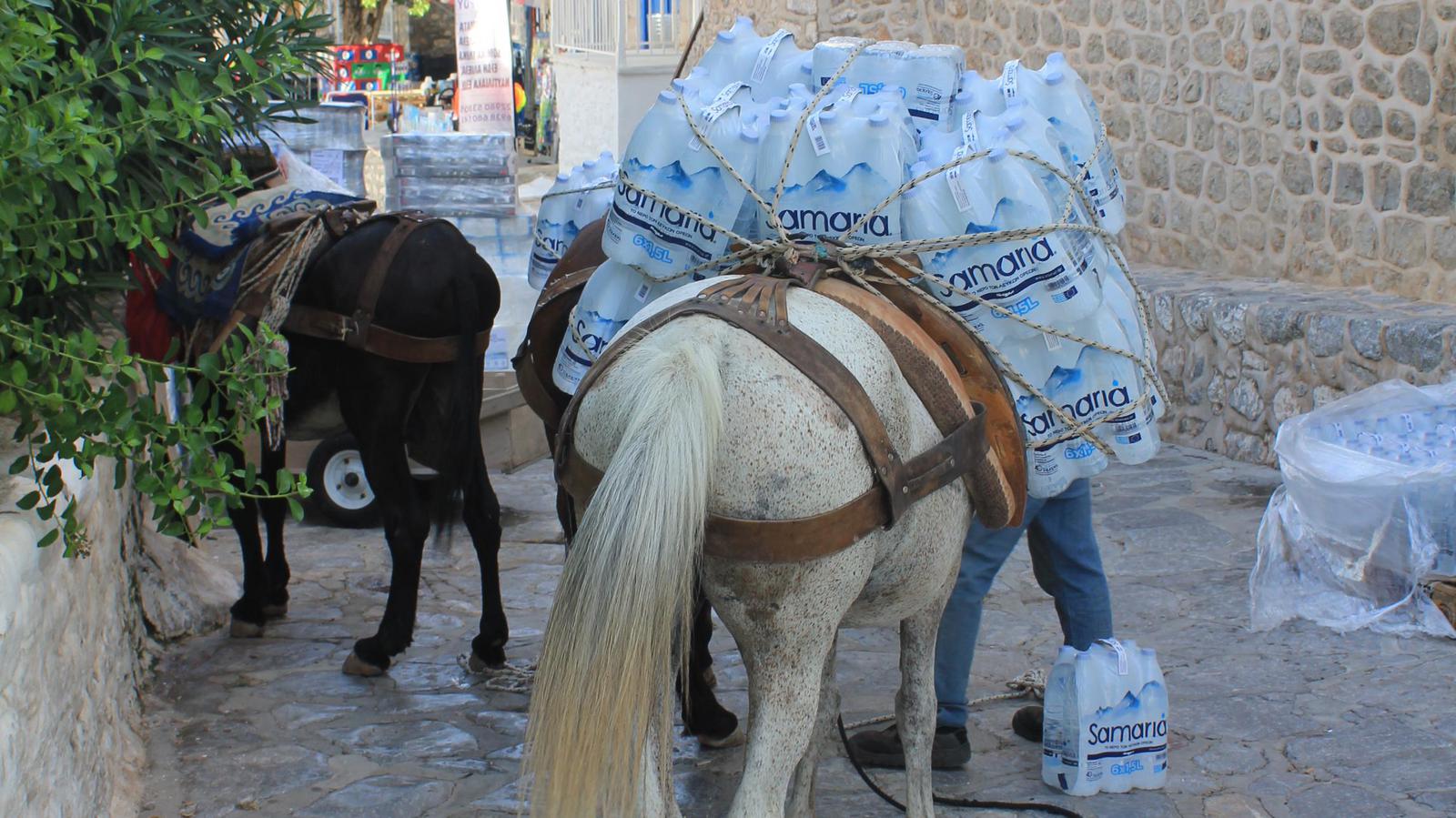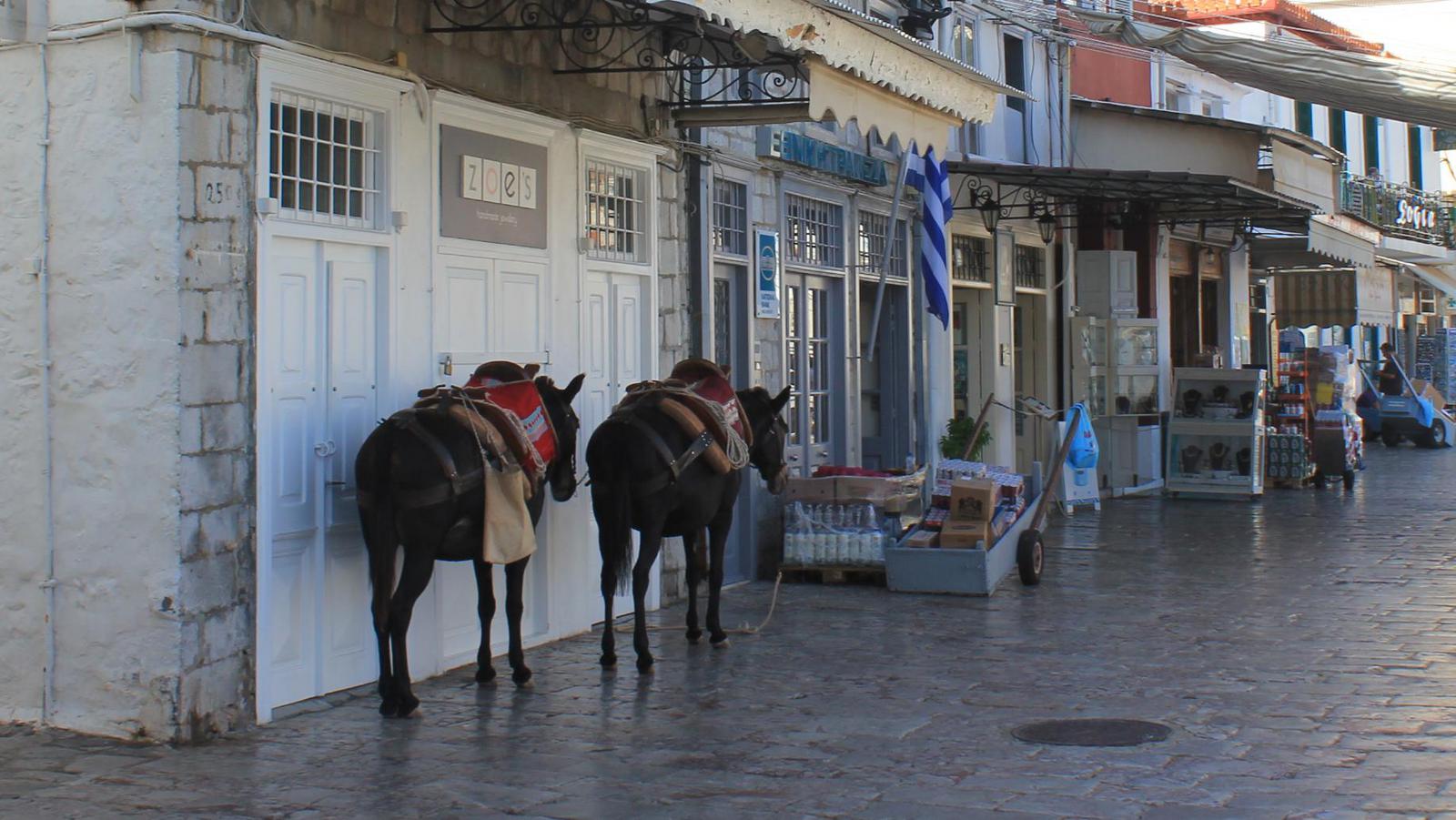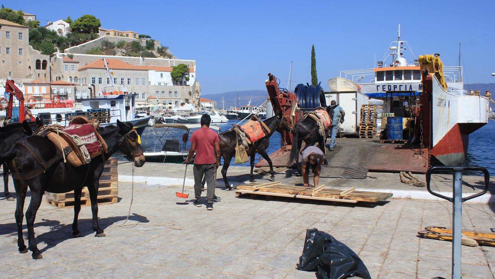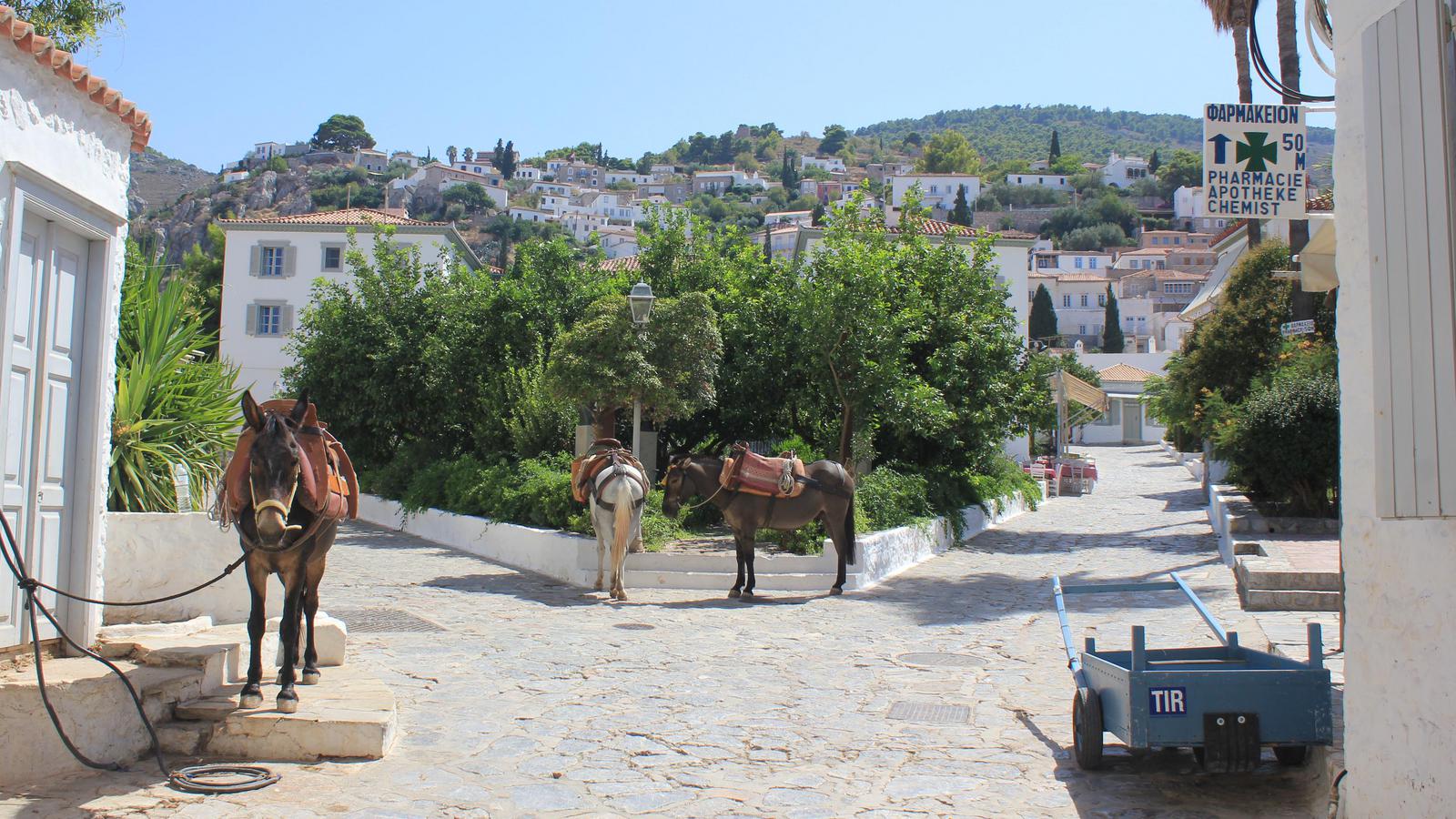 Sur Hydra, il n'y a pas d'eau, pas de route, ni de voiture ni de scooter. Les approvisionnements se font par bateau, puis les marchandises sont acheminées à travers les ruelles du village avec des charrettes à bras ou à dos de mules.