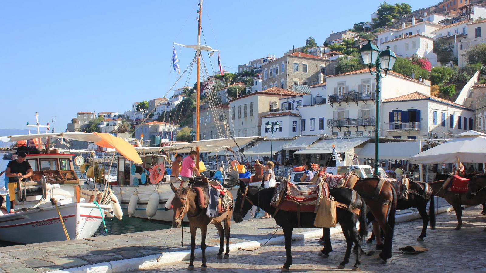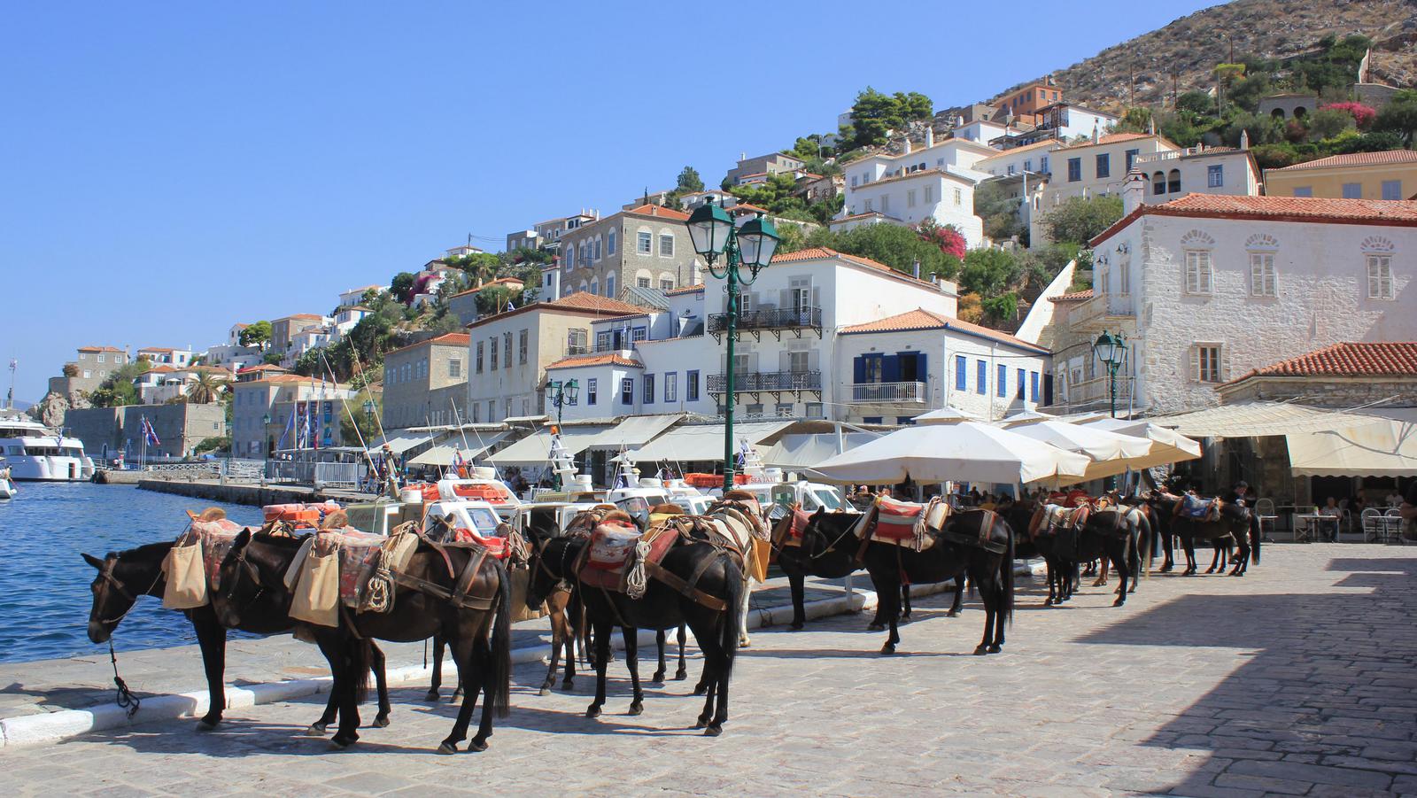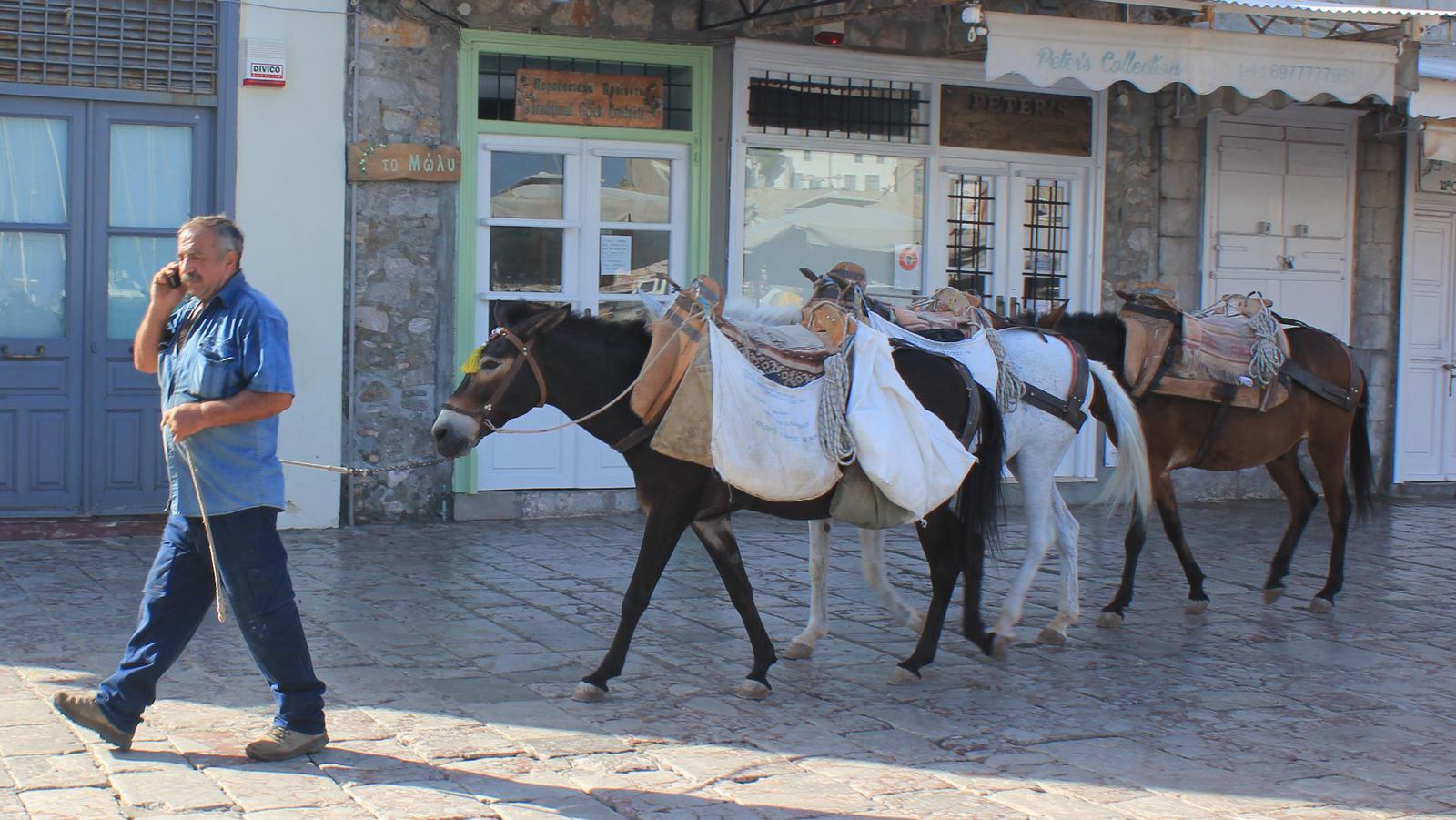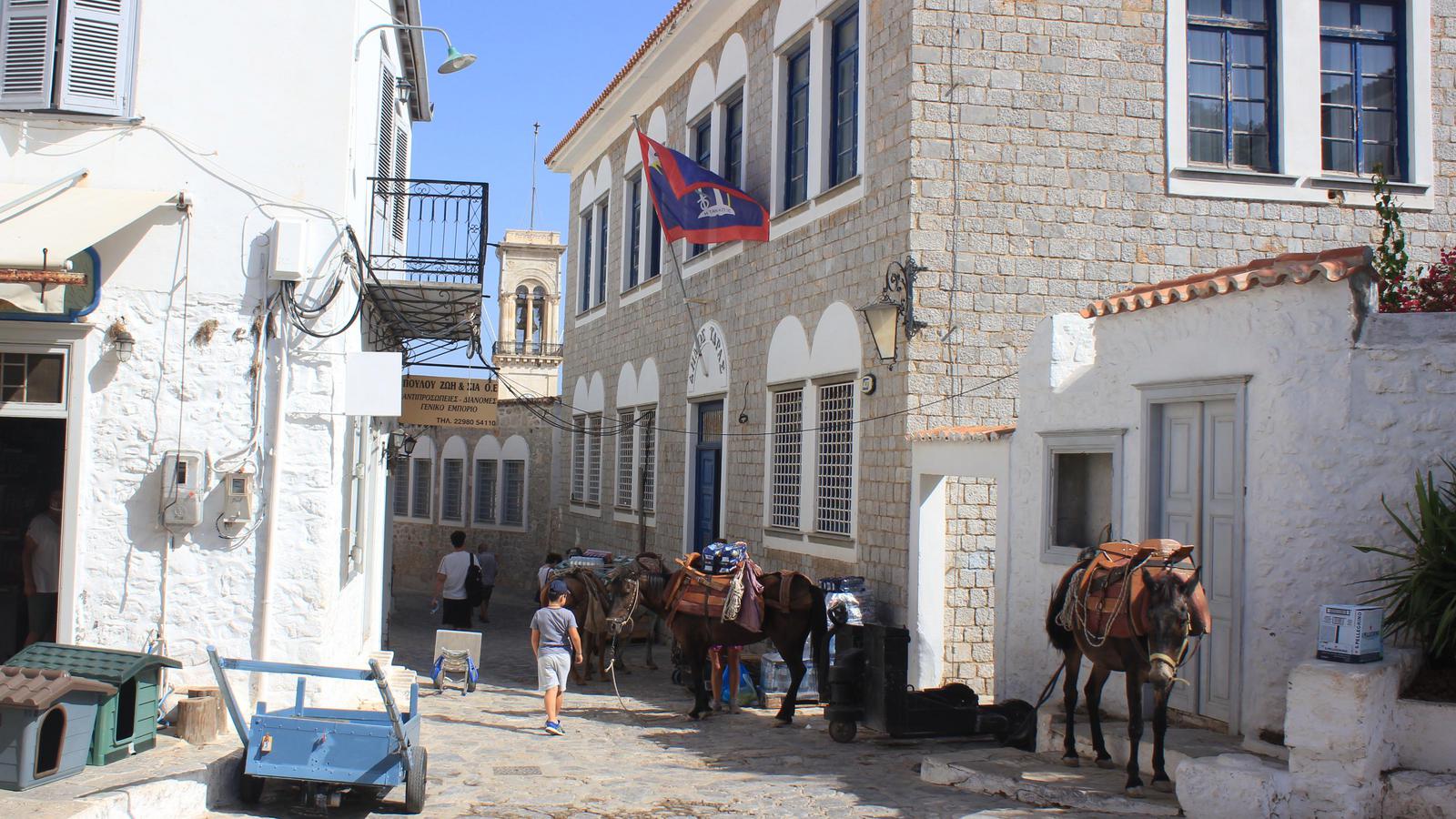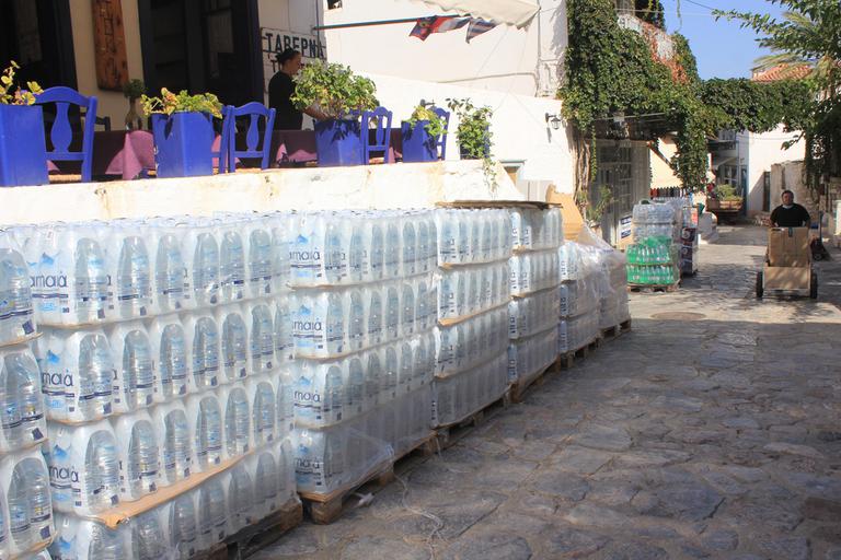 Sur Hydra, il n'y a pas d'eau, pas de route, ni de voiture ni de scooter. Les approvisionnements se font par bateau, puis les marchandises sont acheminées à travers les ruelles du village avec des charrettes à bras ou à dos de mules.
