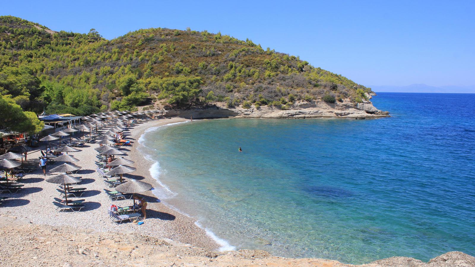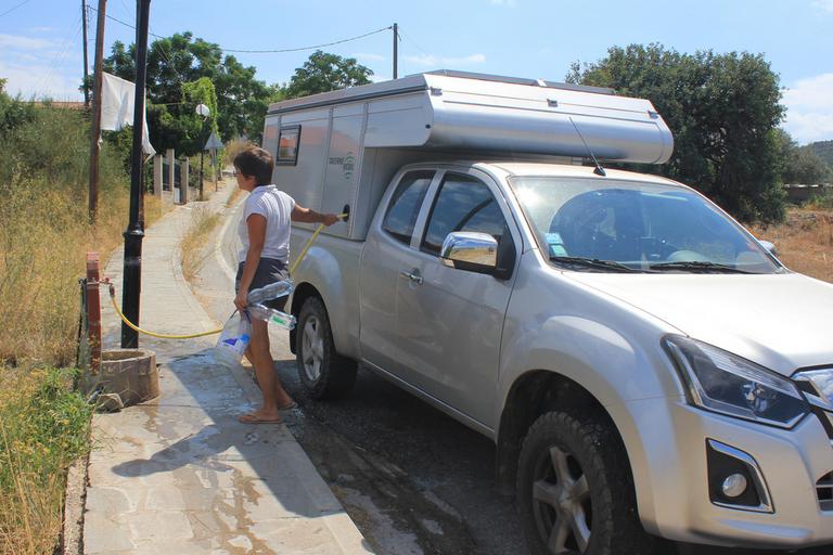Avant de rejoindre la presqu'île, nous faisons un petit crochet pour compléter notre plein d'eau à un robinet indiqué sur P4N, à la sortie de Taktikoupoli, puis descendons pique-niquer sur la grande plage en contrebas du village.