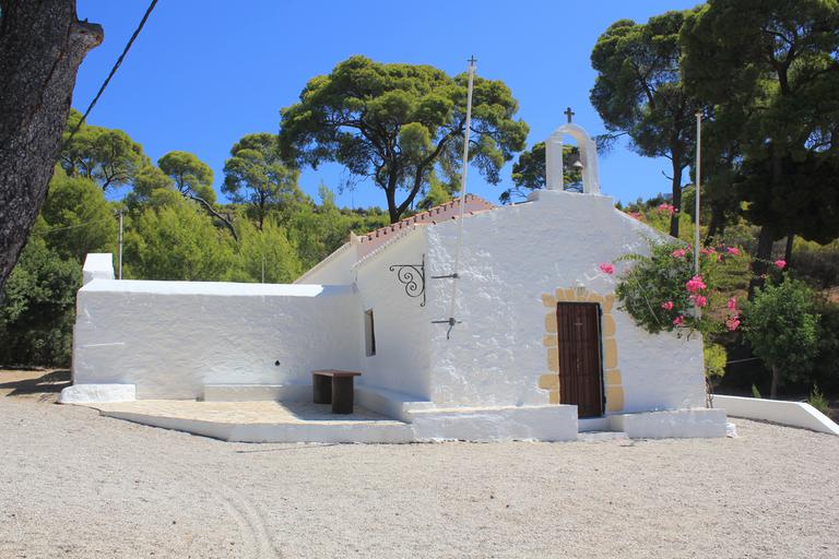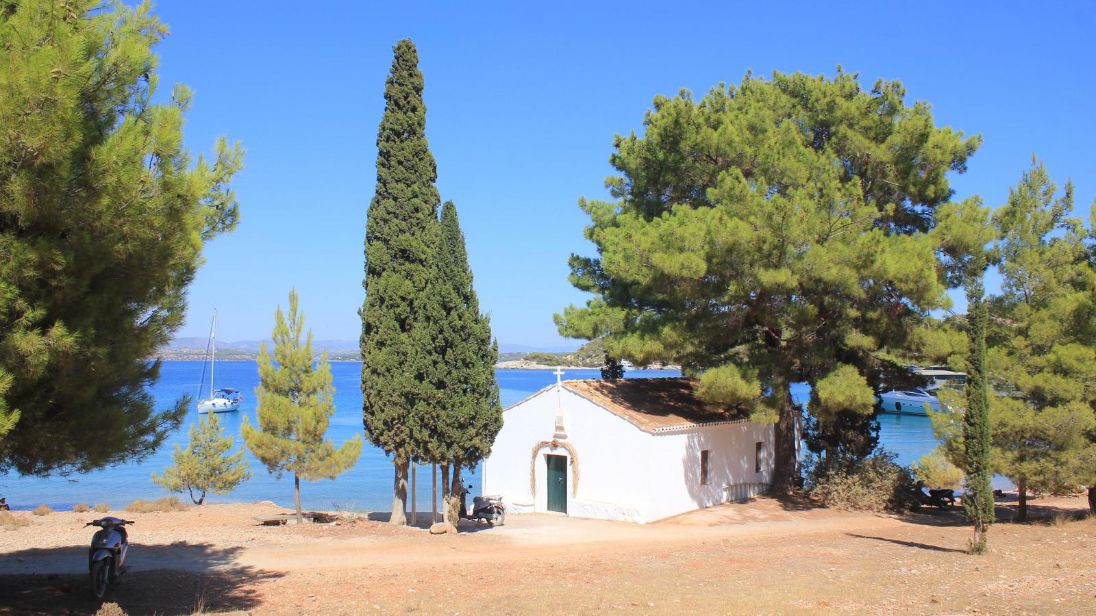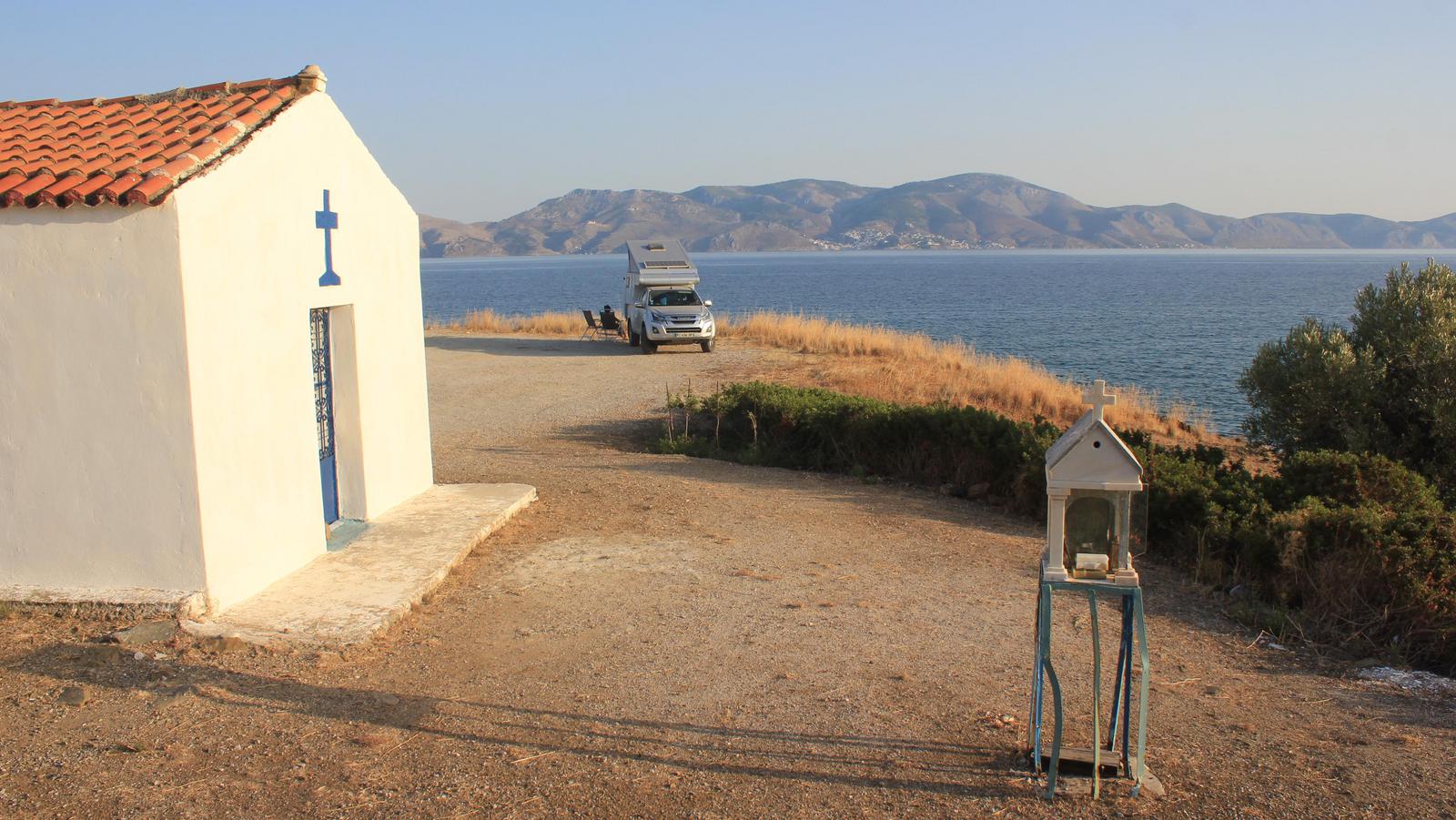 Le bateau part à 10h00 demain matin, il nous faut maintenant touver un lieu de bivouac. Comme à l'habitude, nous consultons notre appli et trouvons un parking près d'une chapelle en suivant la côte en direction de Galatas. Les voyageurs indiquent d'ailleurs que les gens qui viennent sur ce spot sont ceux qui veulent aller à Hydra depuis le port de Metochi, un minuscule port d'où part une navette utilisée essentiellement par les locaux qui travaillent sur l'île. Cette option nous éviterait de refaire la douzaine de kilomètres pour revenir à Ermioni, nous décidons d'aller nous renseigner là-bas.