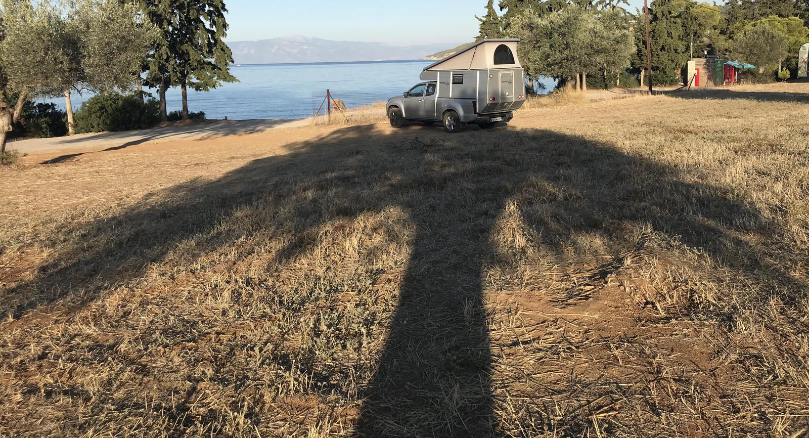 Nous laissons Poros à sa sieste et revenons sur le continent. Il fait très chaud, nous faisons au plus simple et décidons de retourner sur notre bivouac de la vieille.