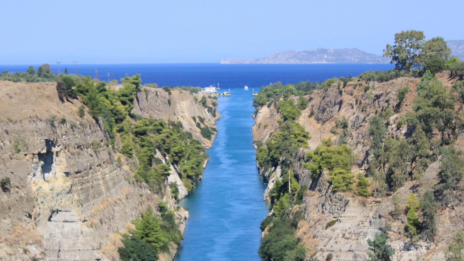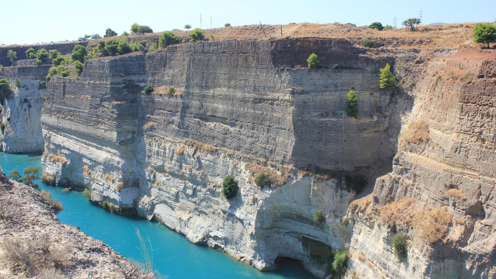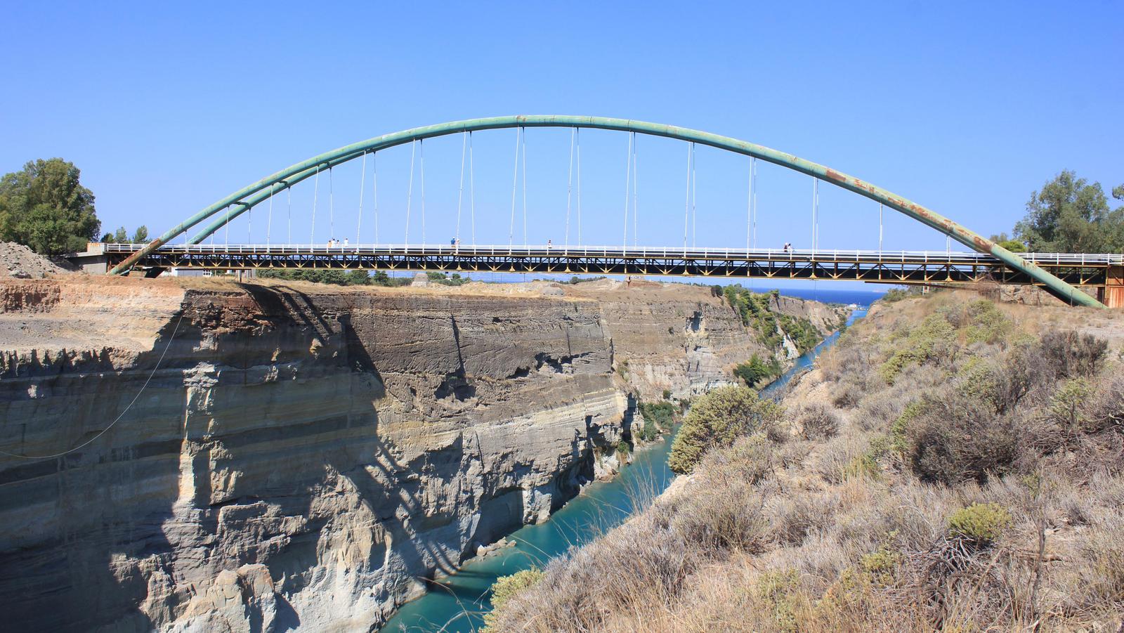 Nous quittons définitivement notre belle forêt et roulons vers le Péloponnèse. Nous arrivons à Loutraki, pour changer de nos itinéraires précédents, nous quittons le bord de mer afin de ne pas franchir une nouvelle fois le canal de Corinthe par le pont immergeable de l'entrée ouest. Nous nous arrêtons à mi-longueur de celui-ci, devant une passerelle piétonne servant également d'aqueduc. L'endroit n'a rien de touristique, les abords sont sales avec de nombreux dépôts sauvages...