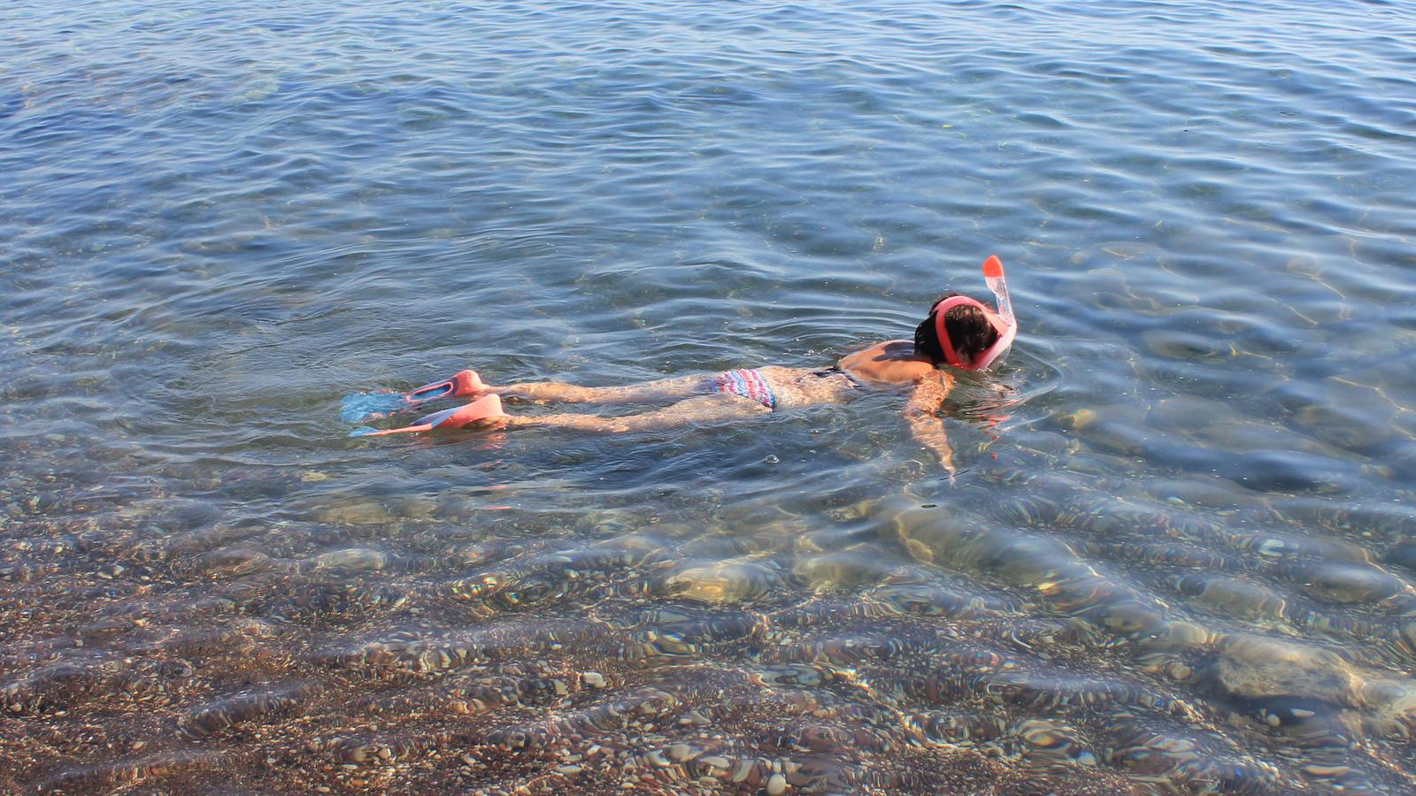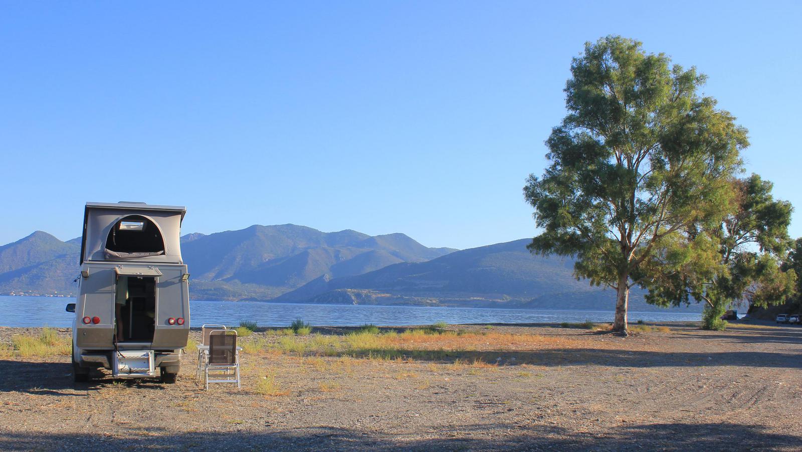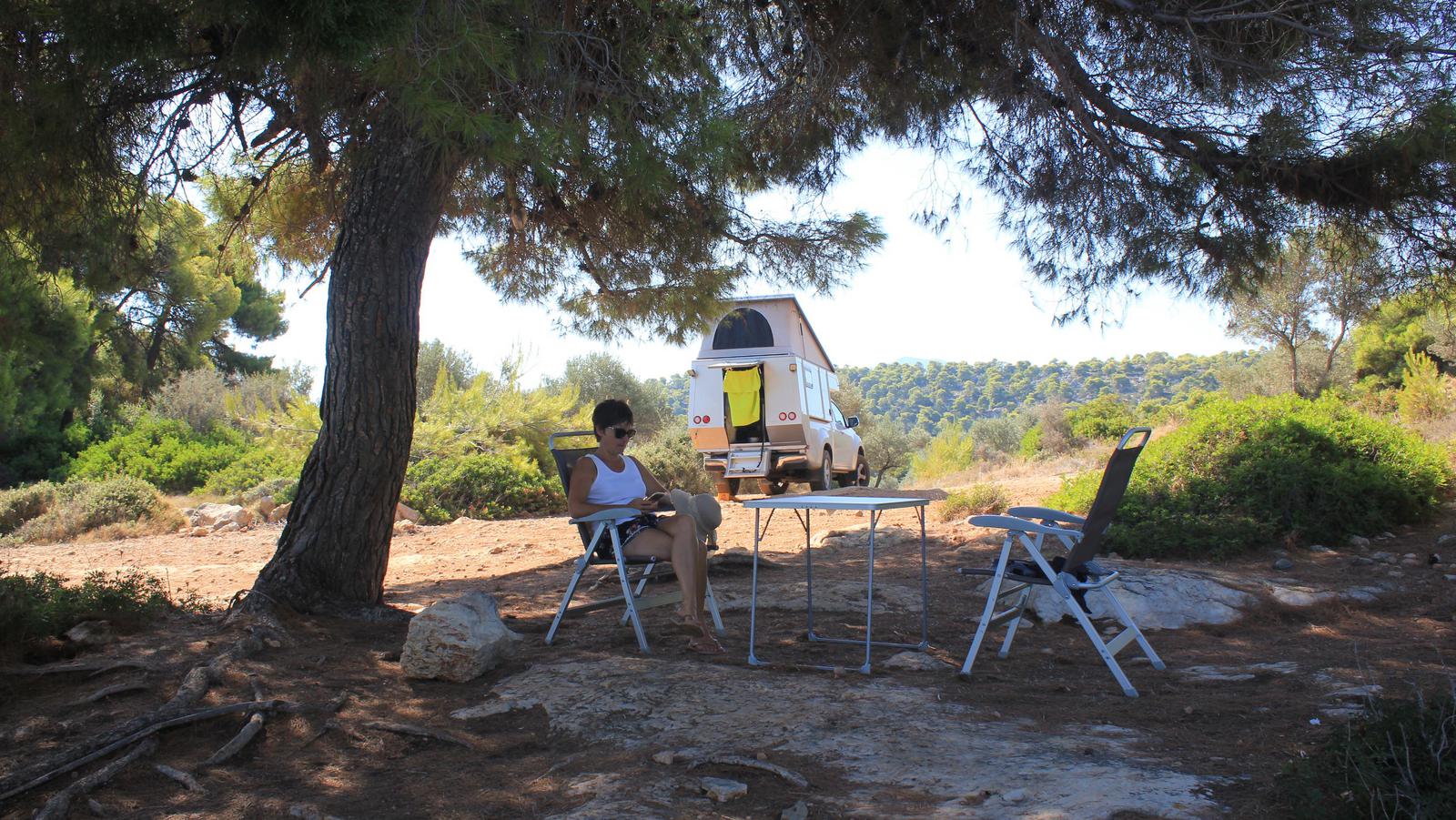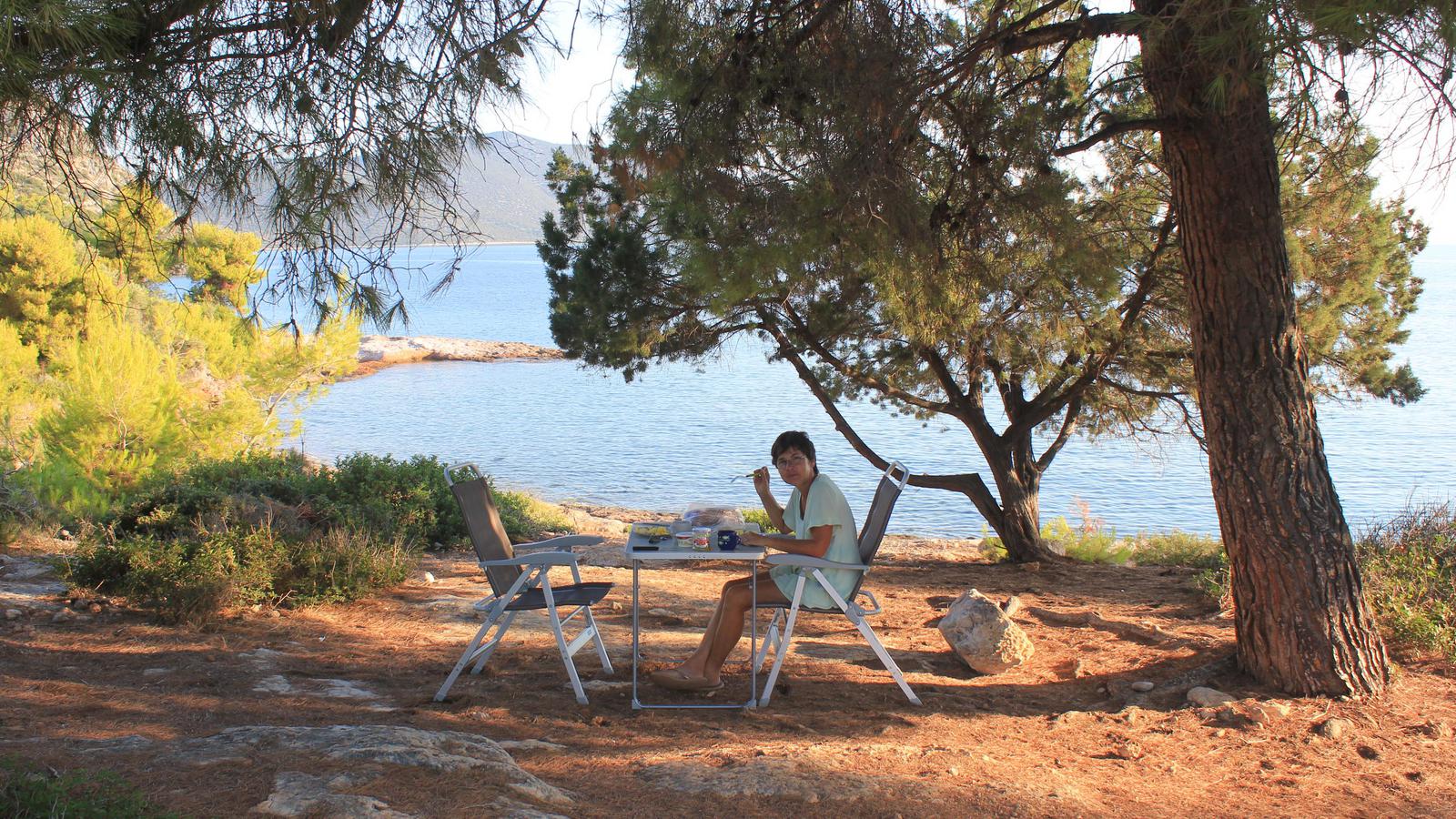Nous restons sur ce beau bivouac jusqu'en début d'après-midi. Nous marchons jusqu'à la plage de gravier toute proche pour faire un peu de snorkeling puis déjeunons à l'ombre de notre grand pin. Un couple allemand avec un combi est arrivé hier soir de nuit et s'est installé entre la plage et nous. Si cela était encore nécessaire, la photo de son installation serait une belle publicité pour Volkswagen.