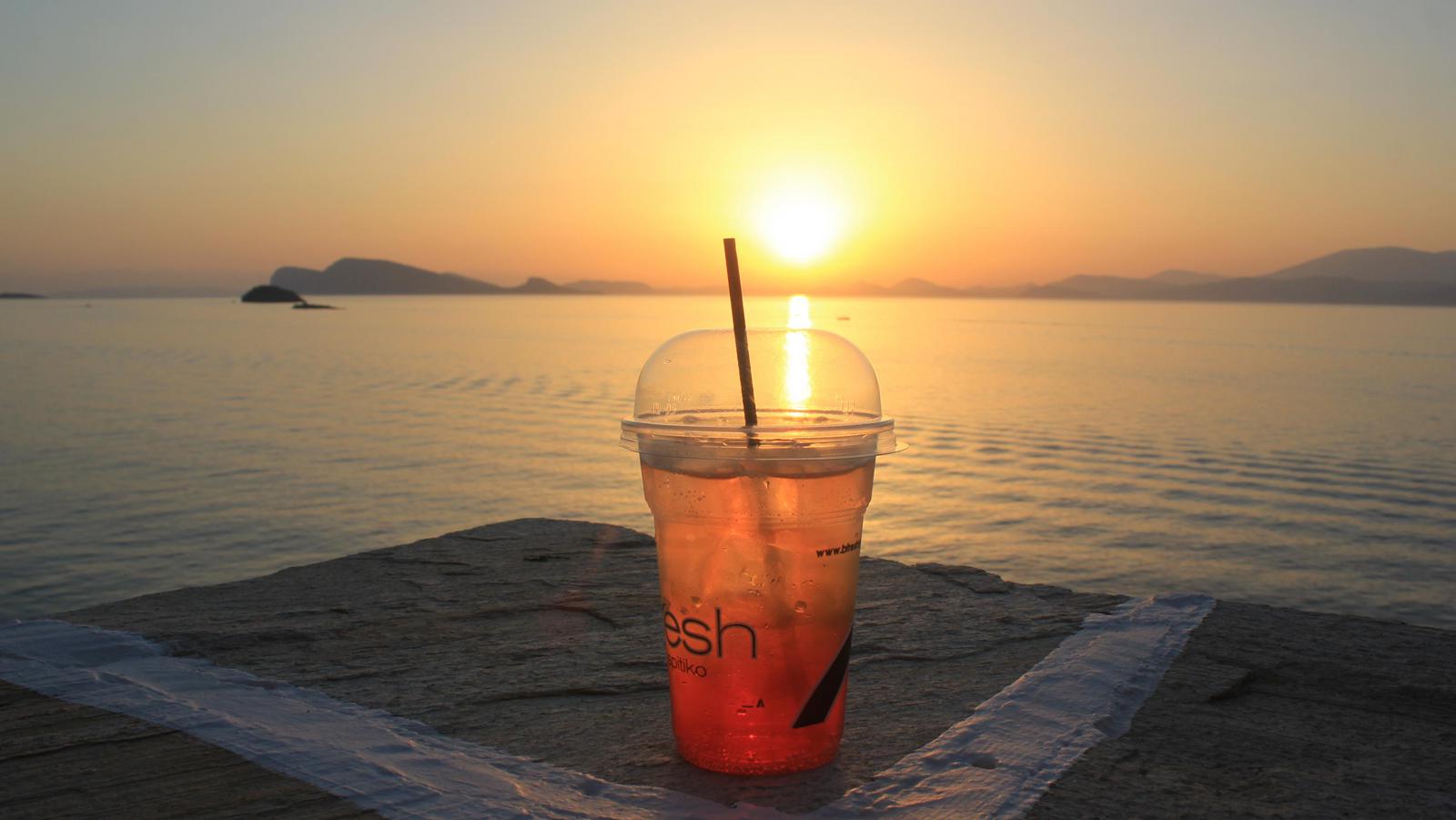 Une seule terrasse est encore au soleil, celle du Sunset Bar. Comme son nom le laisse supposer, cette dernière fait vraiment le plein maintenant. Toutes les tables sont occupées, nous prenons notre cocktail au bar et allons nous assoir sur les rochers. Le soleil descend doucement vers l'horizon, je découvre brusquement la vraie recette de l'Aperol Spritz...