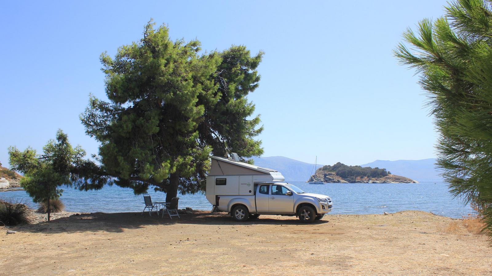 Nous trouvons notre bonheur quelques kilomètres plus loin, en suivant une piste menant à la mer. L'endroit est simplement idyllique, la vue est grandiose et quelques grands pins sont là pour offrir l'ombre indispensable.