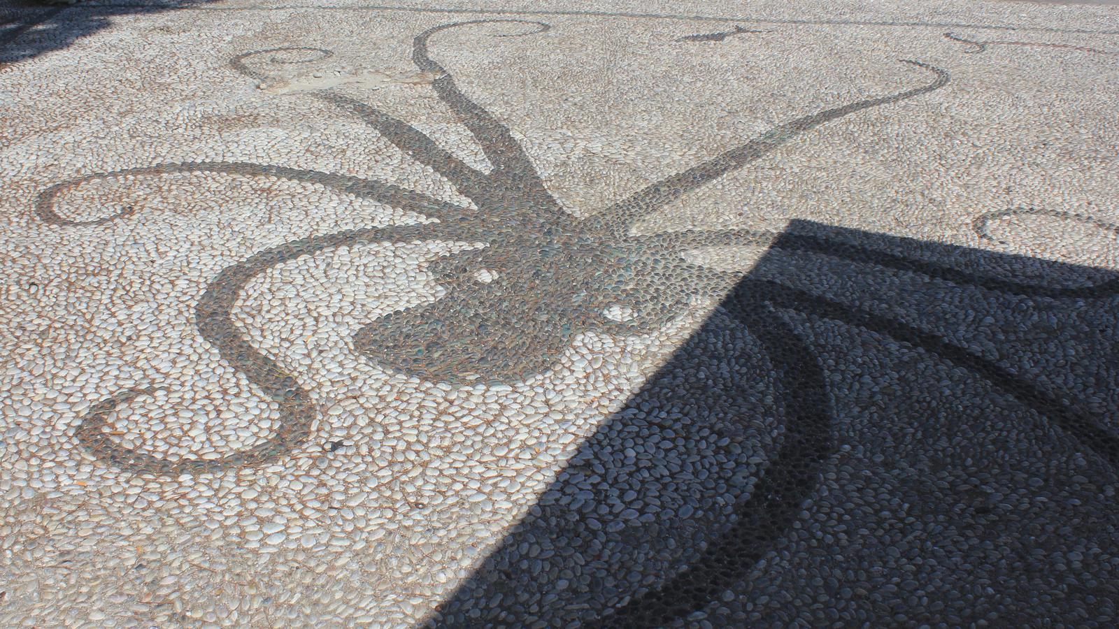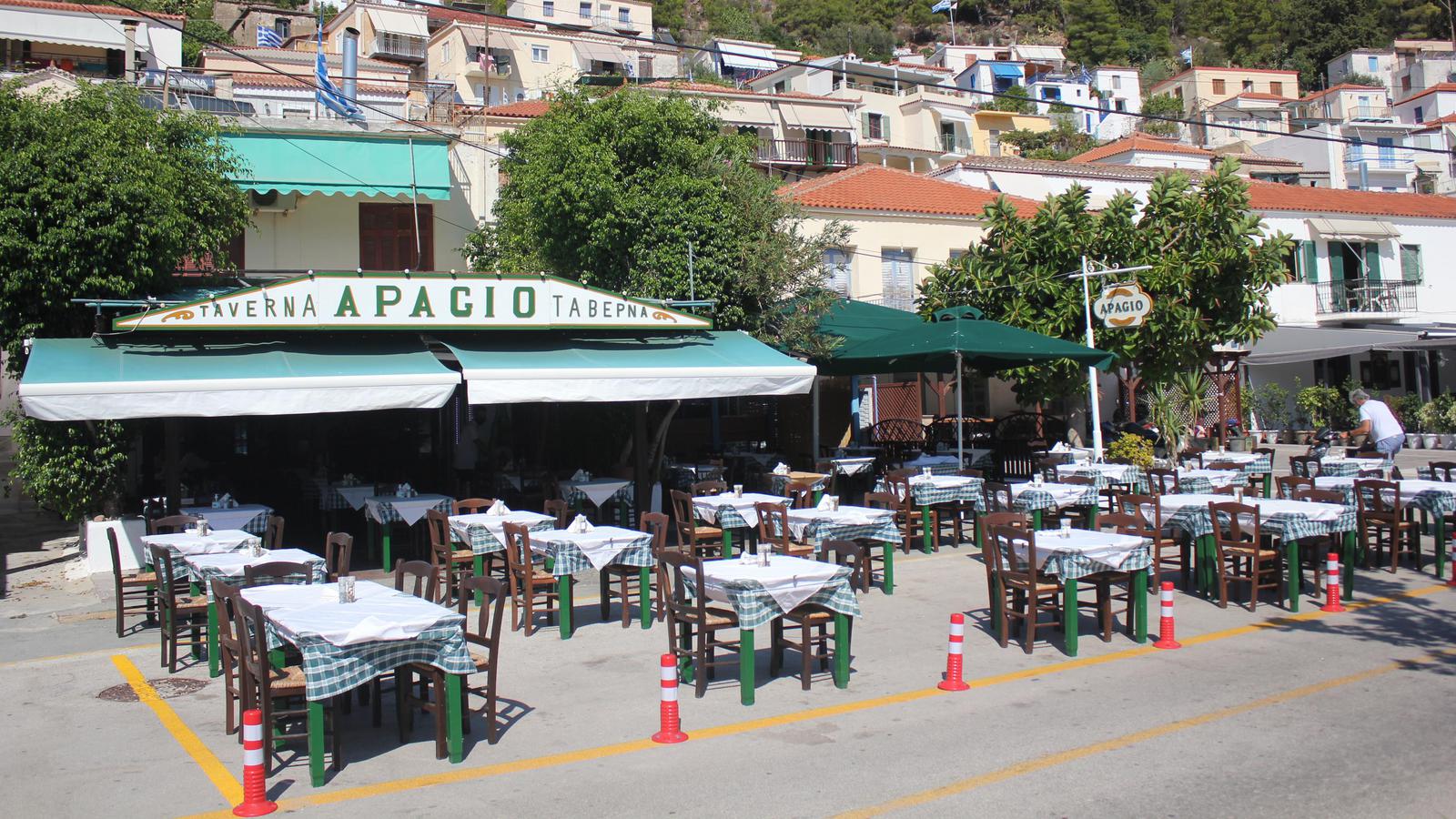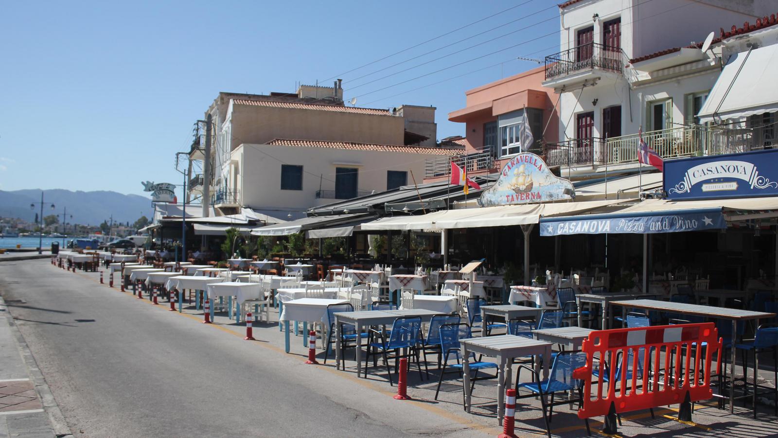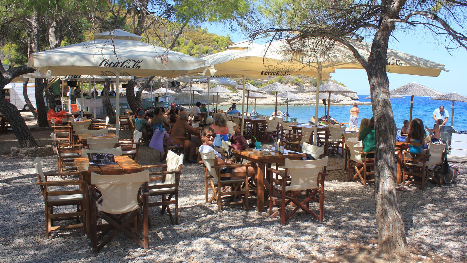 Nous passons le petit pont entre Sphéria et Kalavria, et la première plage nous offre le premier bain de la journée. Nous revenons ensuite sur le port pour déjeuner. Les restaurants se succèdent, toutes les tables sont dressées, mais aucune n'est occupée.