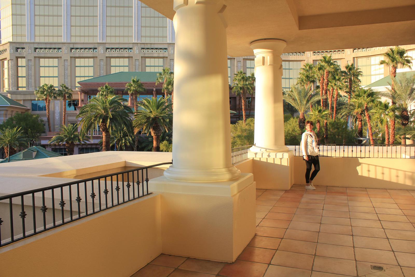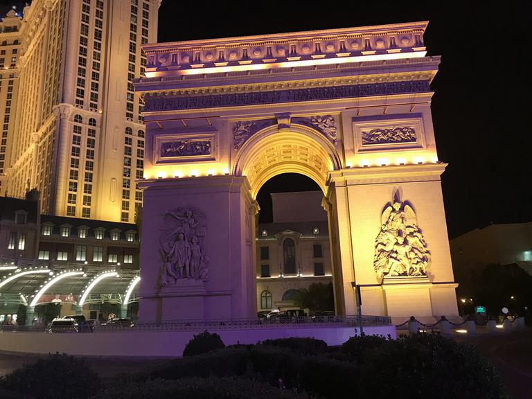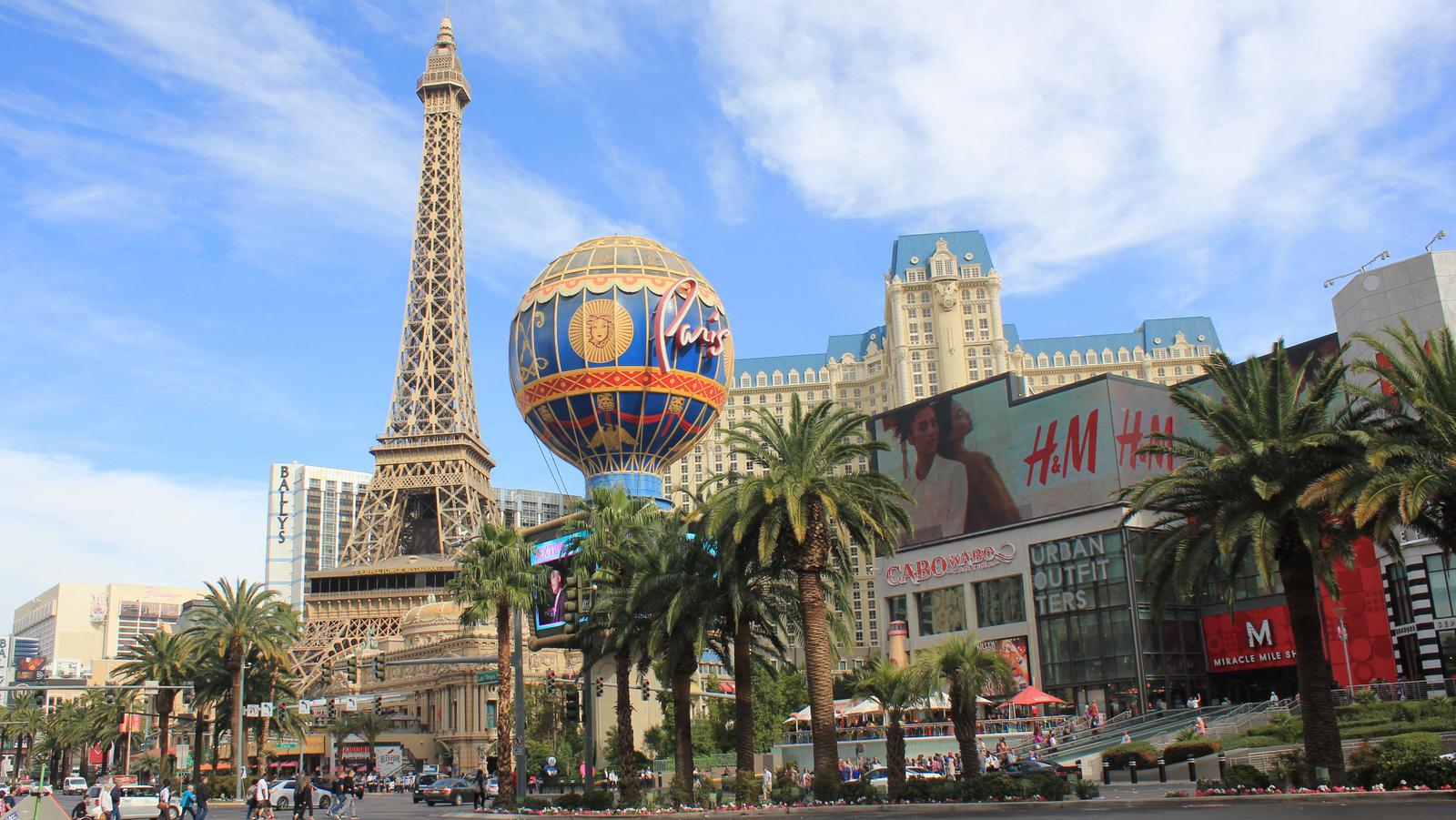 Passage obligé depuis notre parking pour rejoindre le Strip, le casino Paris Las Vegas est notre première étape de la journée. Nous en profitons pour chercher les détails qui nous auraient encore échappés de ce casino qui a fêté ses 20 ans au mois de septembre. Devant l'hôtel de 33 étages au style vaguement Mansart, on retrouve, la Tour Eiffel à échelle 1/2, la place de l'Etoile et son Arc de Triomphe, puis sous les pieds de la tour, un mixte de constructions évoquant l'Opéra-Garnier, la gare d'Orsay, le Louvre et l'Hôtel de Ville... Juste à côté, l'aérostat des frères Mongolfier. La meilleure vue de l'ensemble est offerte depuis la galerie du Bellagio, de l'autre côté du Strip.