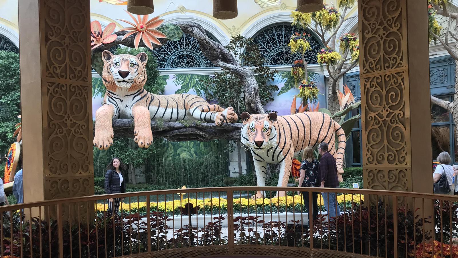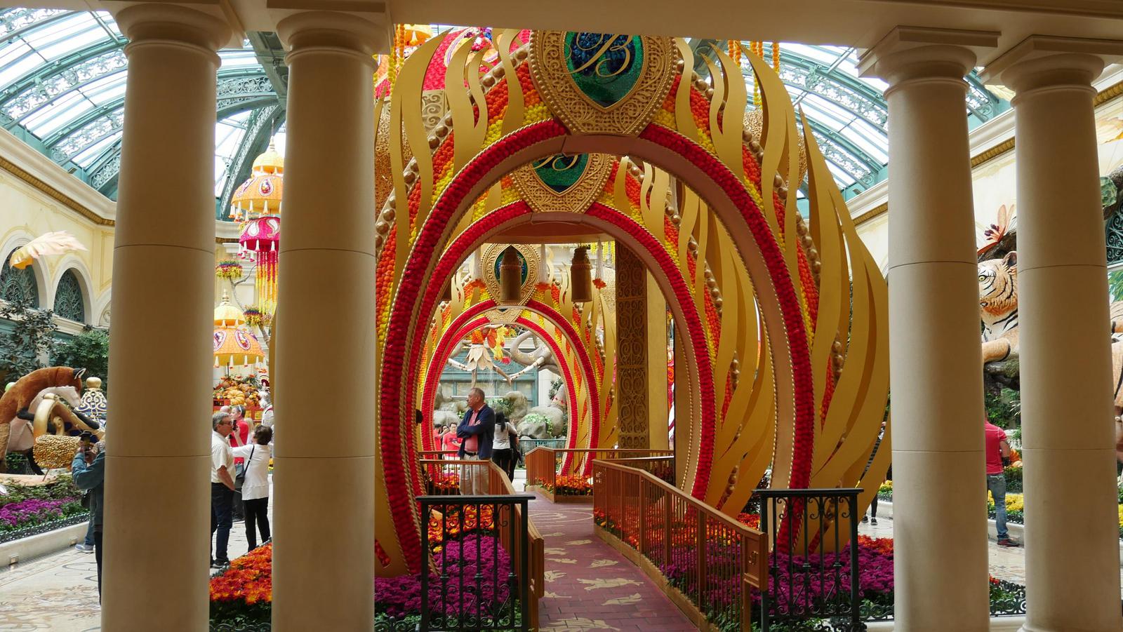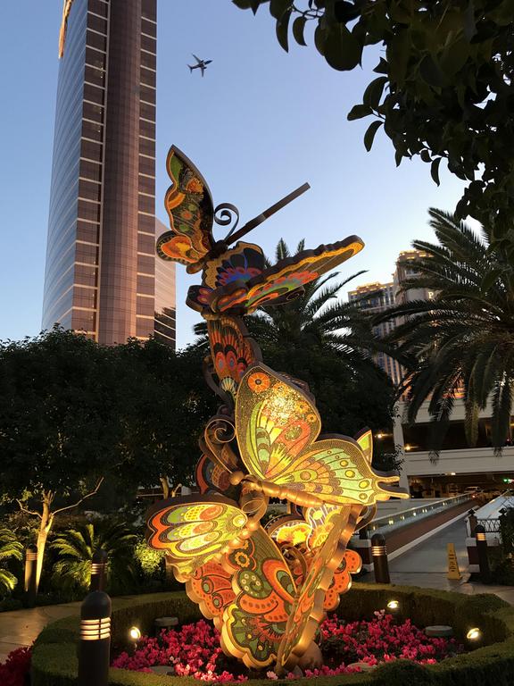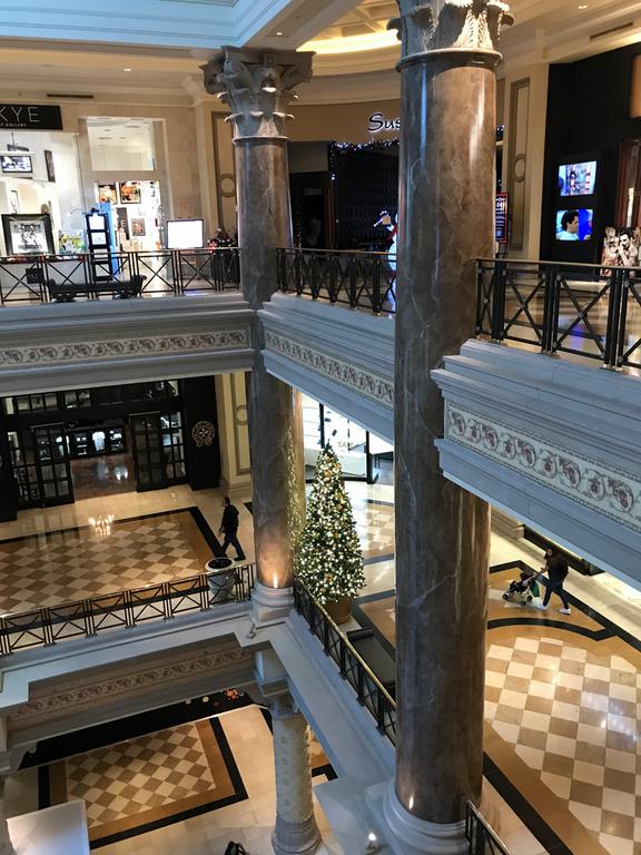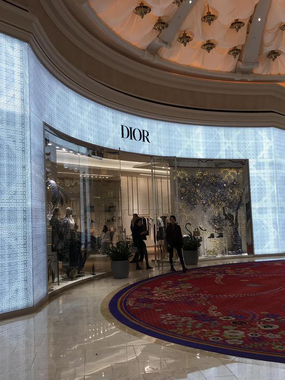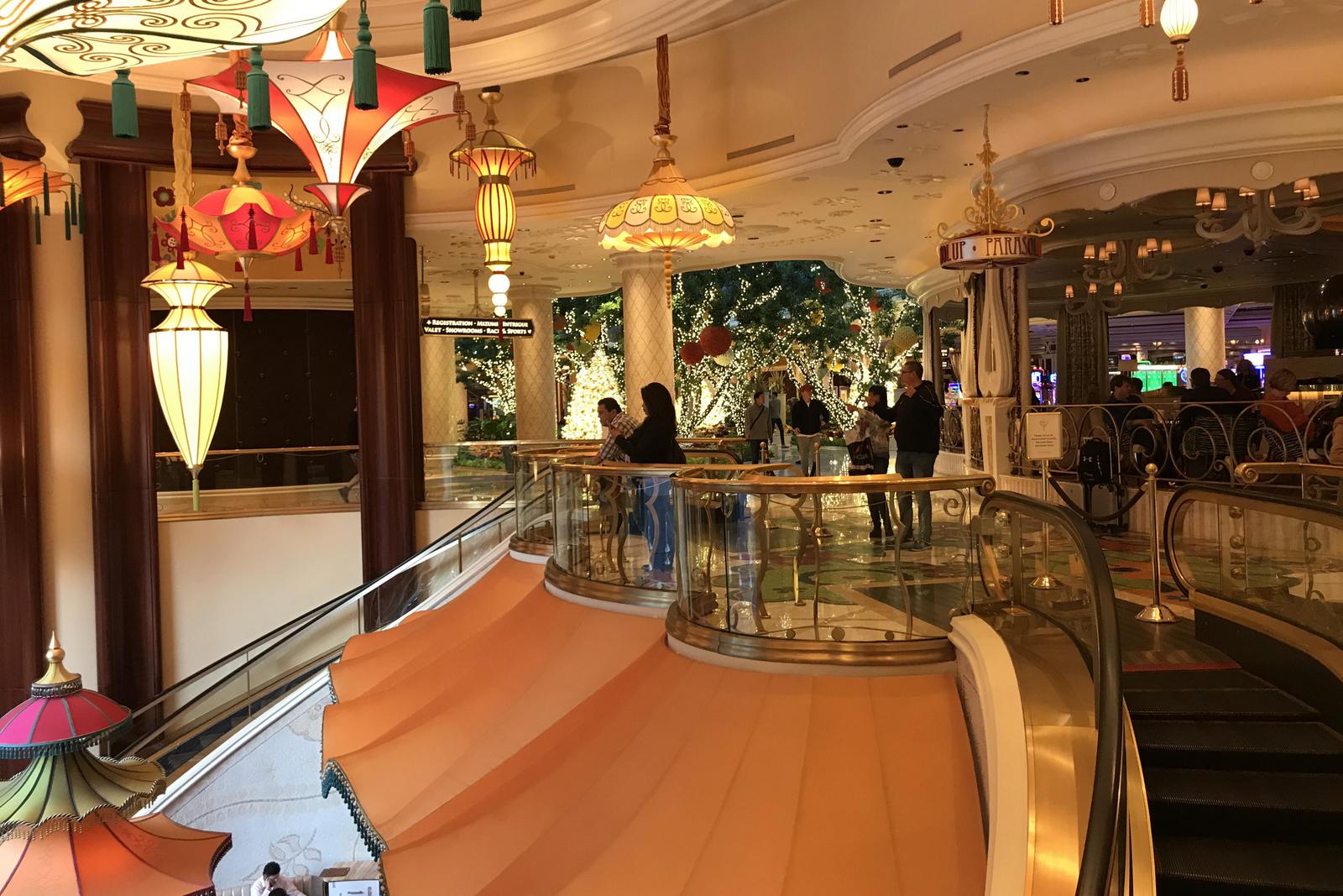 Une fois n'est pas coutume, nous n'entrons pas dans le casino par une salle de jeux, mais par une galerie commerciale ultra luxueuse, où se cotoient les enseignes prestigieuses Rolex, Prada, Louis Vuitton, Dior, Certier, Chanel. Puis cette galerie débouche sur un jardin artificiel beaucoup plus kitch, à l'image de celui que nous avons vu au Bellagio, orné d'objets et de personnages constitués de fleurs artificielles aux couleurs vives.