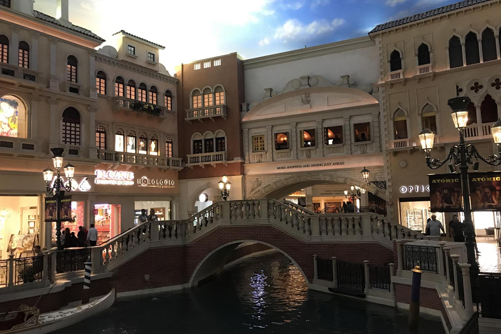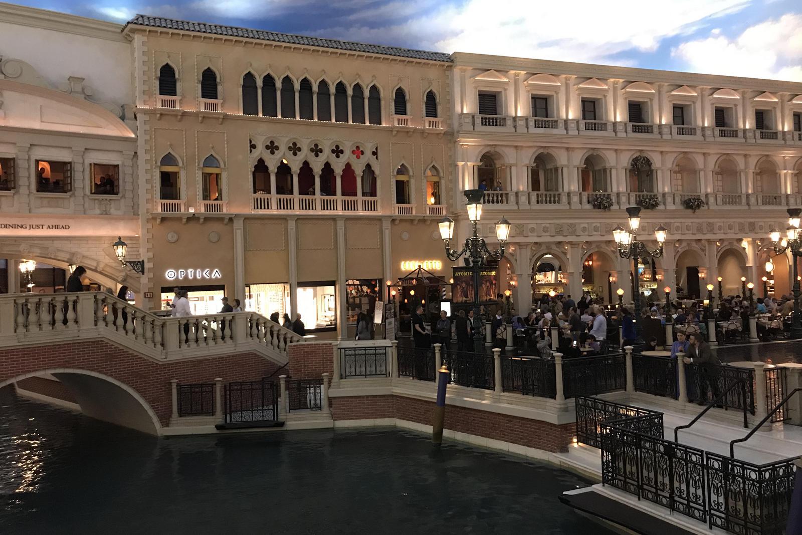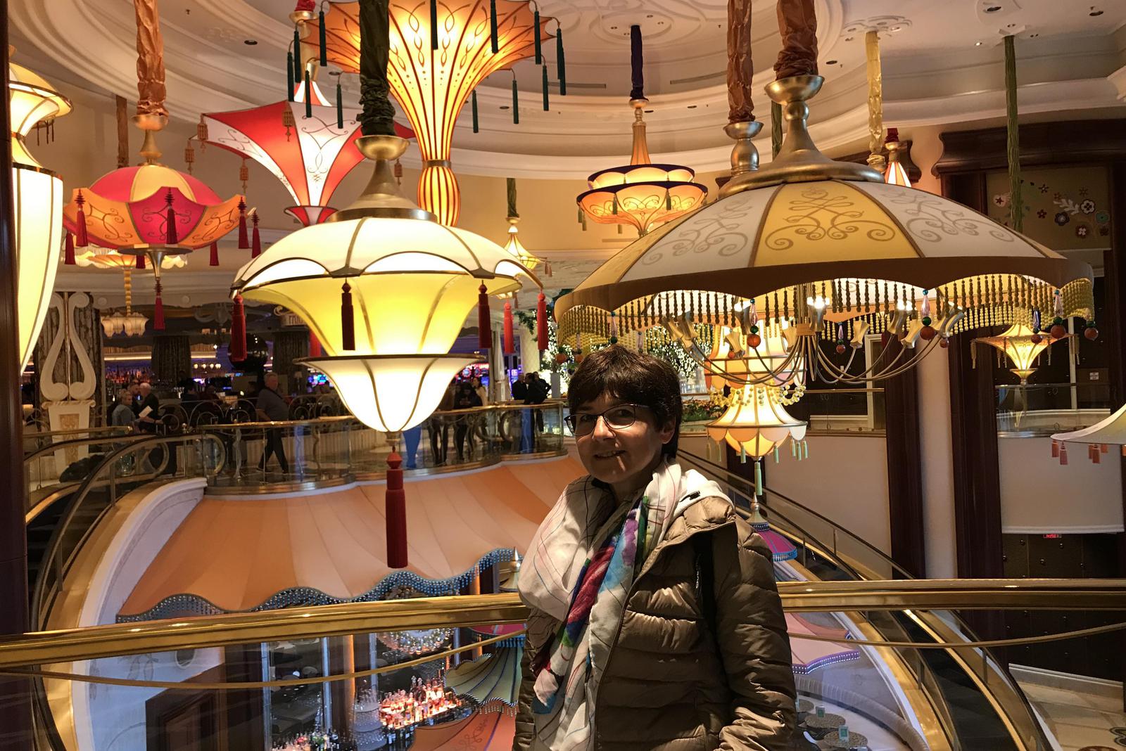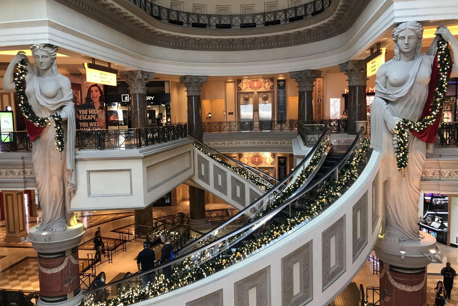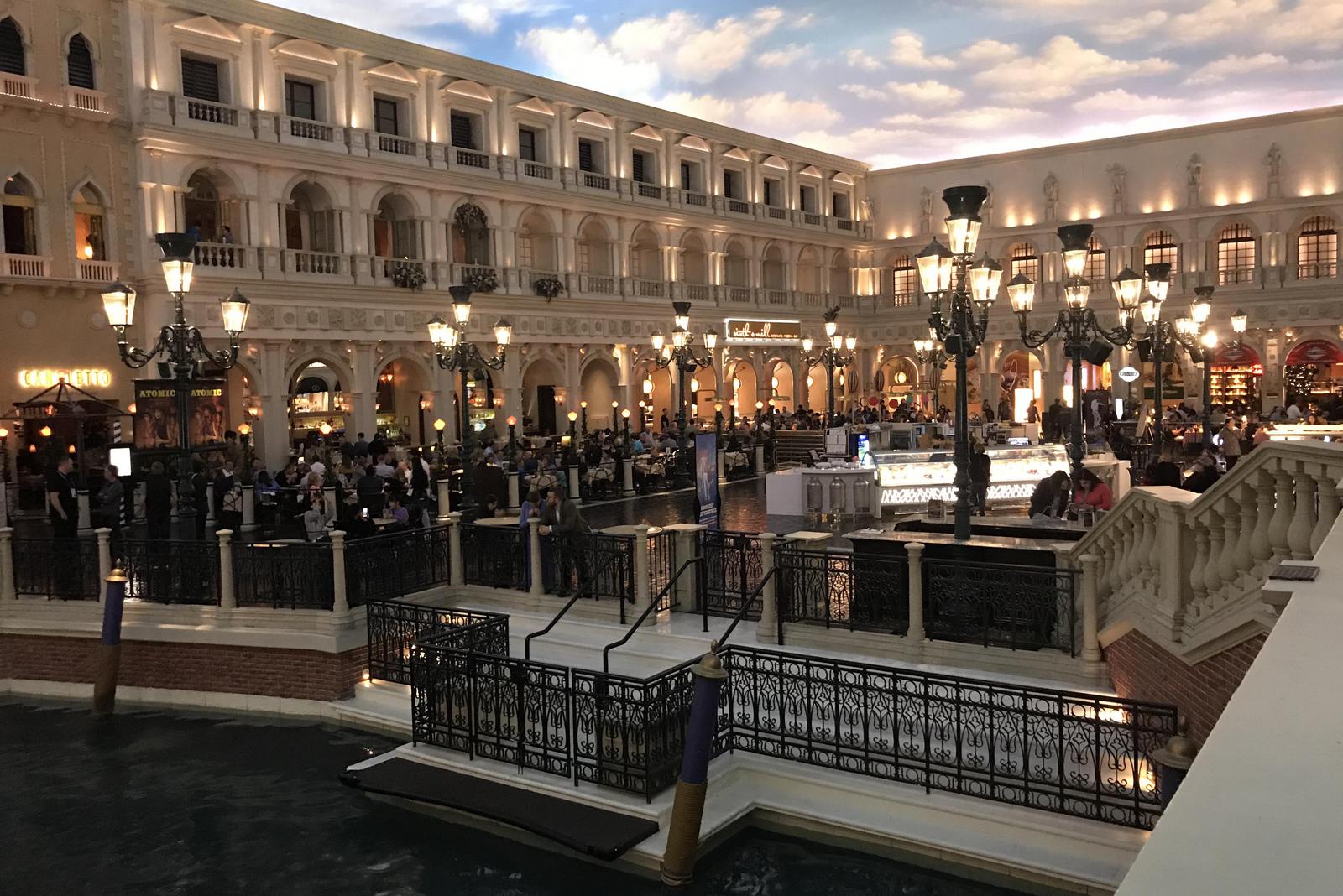 Une fois n'est pas coutume, nous n'entrons pas dans le casino par une salle de jeux, mais par une galerie commerciale ultra luxueuse, où se cotoient les enseignes prestigieuses Rolex, Prada, Louis Vuitton, Dior, Certier, Chanel. Puis cette galerie débouche sur un jardin artificiel beaucoup plus kitch, à l'image de celui que nous avons vu au Bellagio, orné d'objets et de personnages constitués de fleurs artificielles aux couleurs vives.