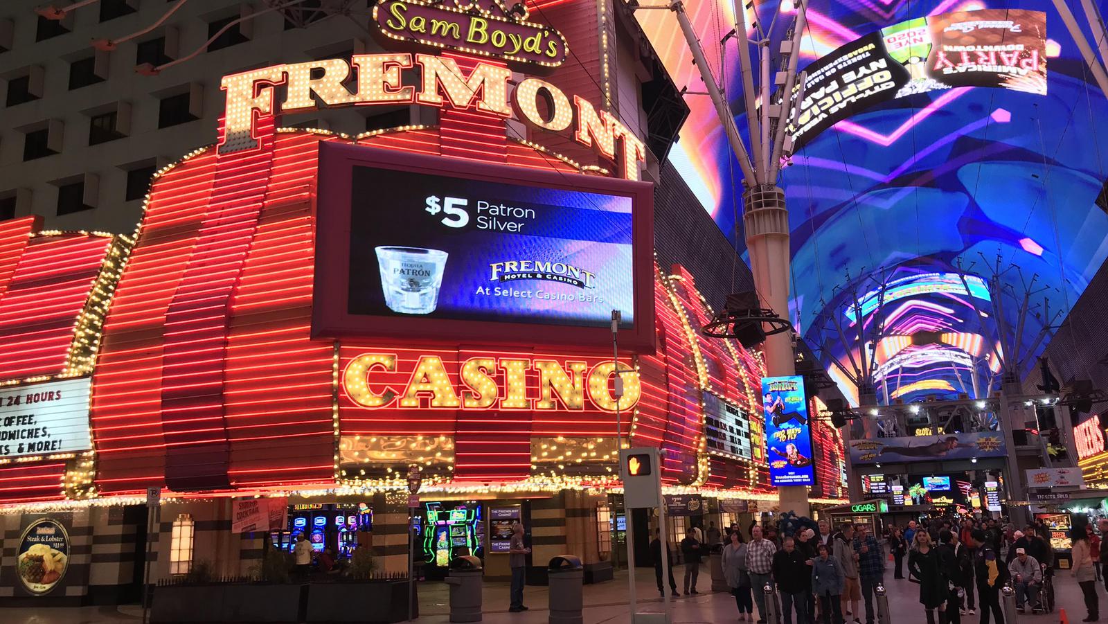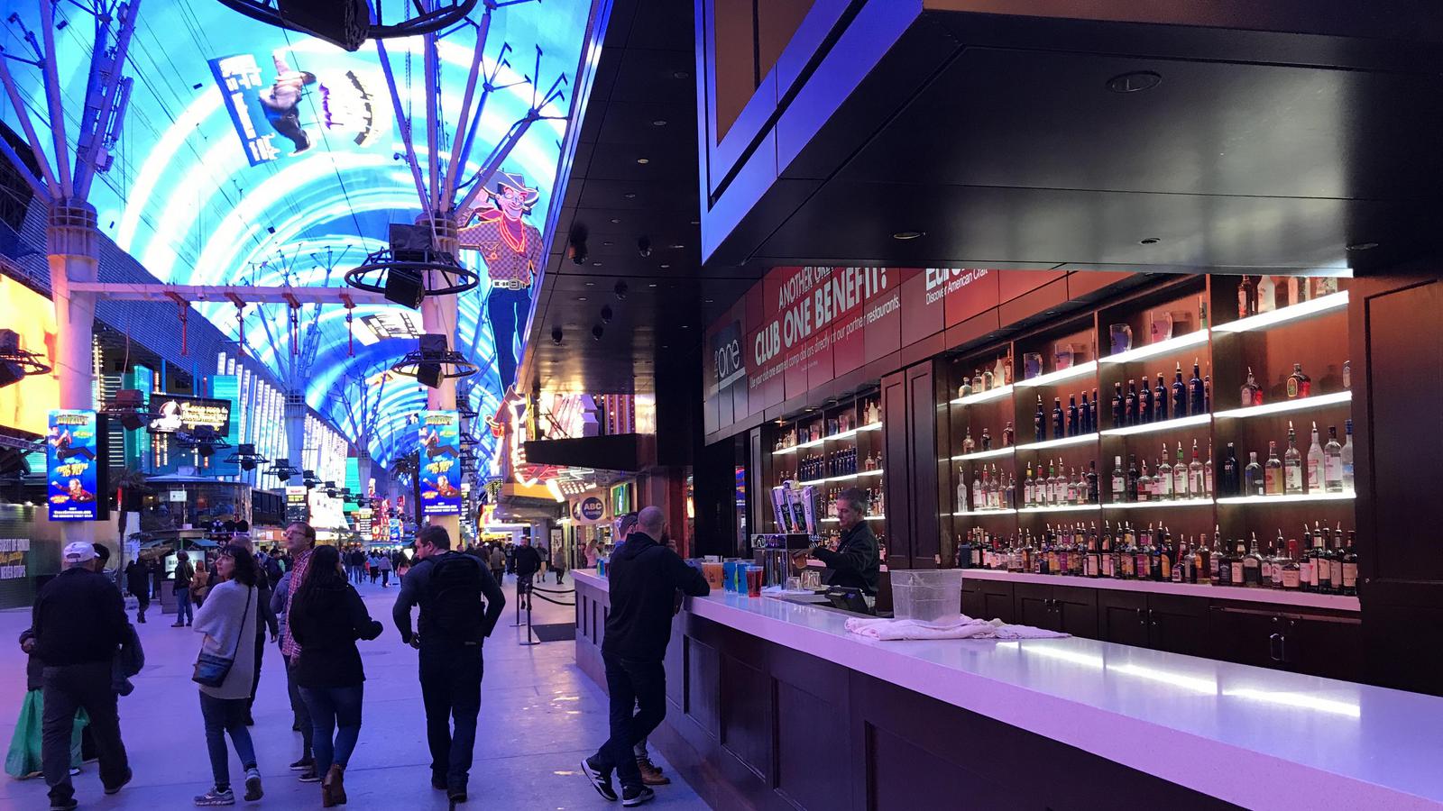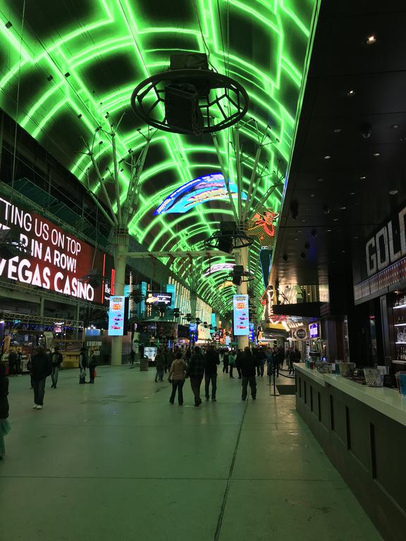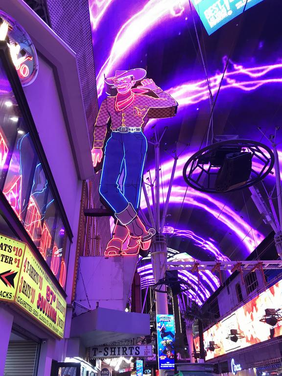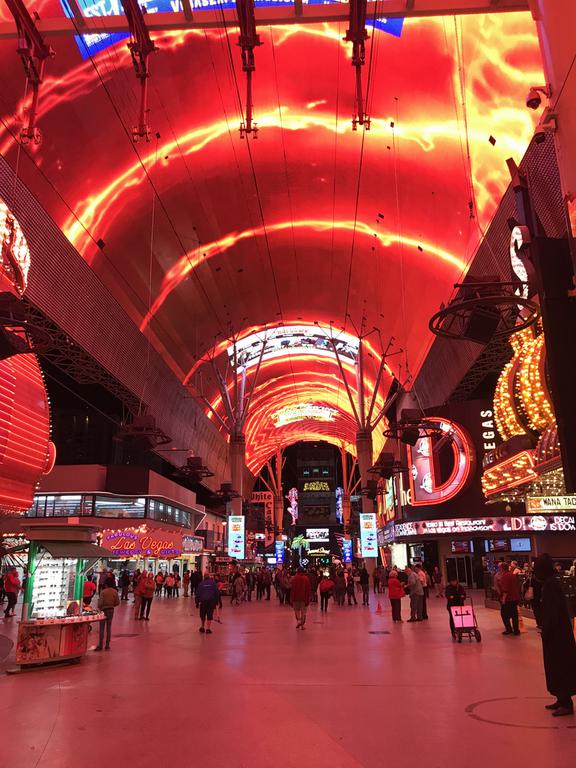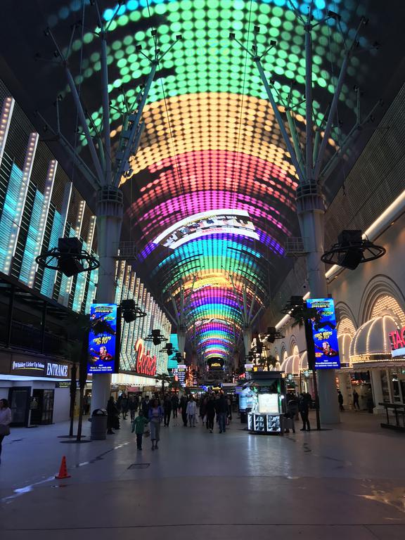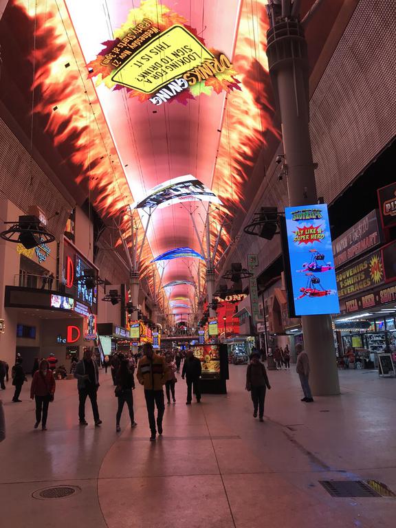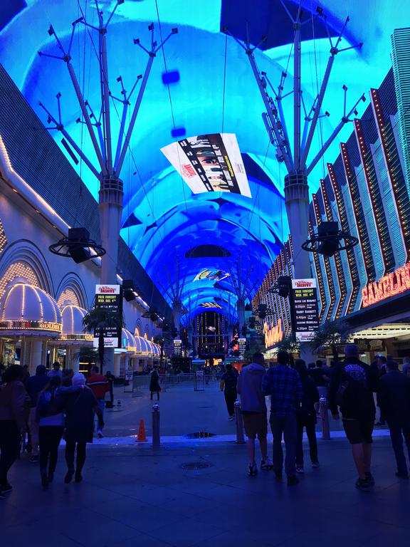 Sur cette rue du centre de Downtown, longue de 416m, une immense voûte lumineuse a été installée en 2004 pour redynamiser le quartier hitorique des premiers casinos de Las Vegas. Celle-ci est allumée dès la tombée de la nuit, les motifs et figures changent à chaque instant selon la musique et les encarts publicitaires. En 2009, nous avions visité cette rue de jour, c'est plus facile de la voir aujourd'hui avec une nuit qui tombe à 16h30. A l'époque, nous avions apprécié que celle-ci soit climatisée, ce soir il ne fait pas plus de 10 dégrés.