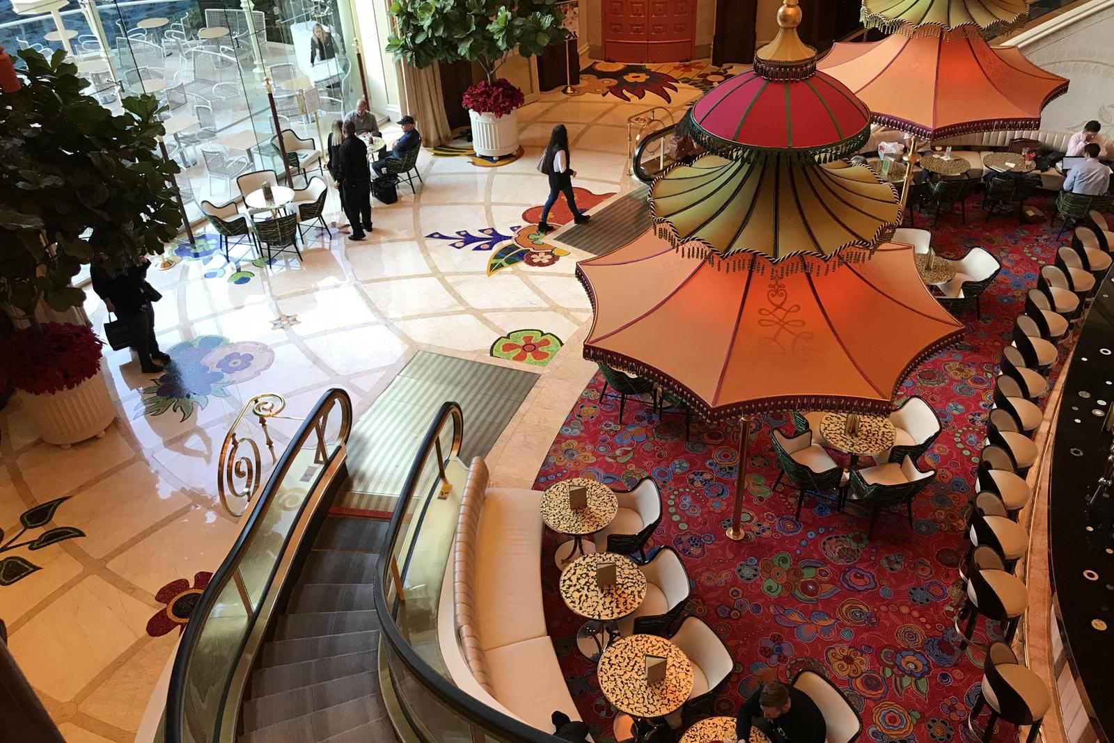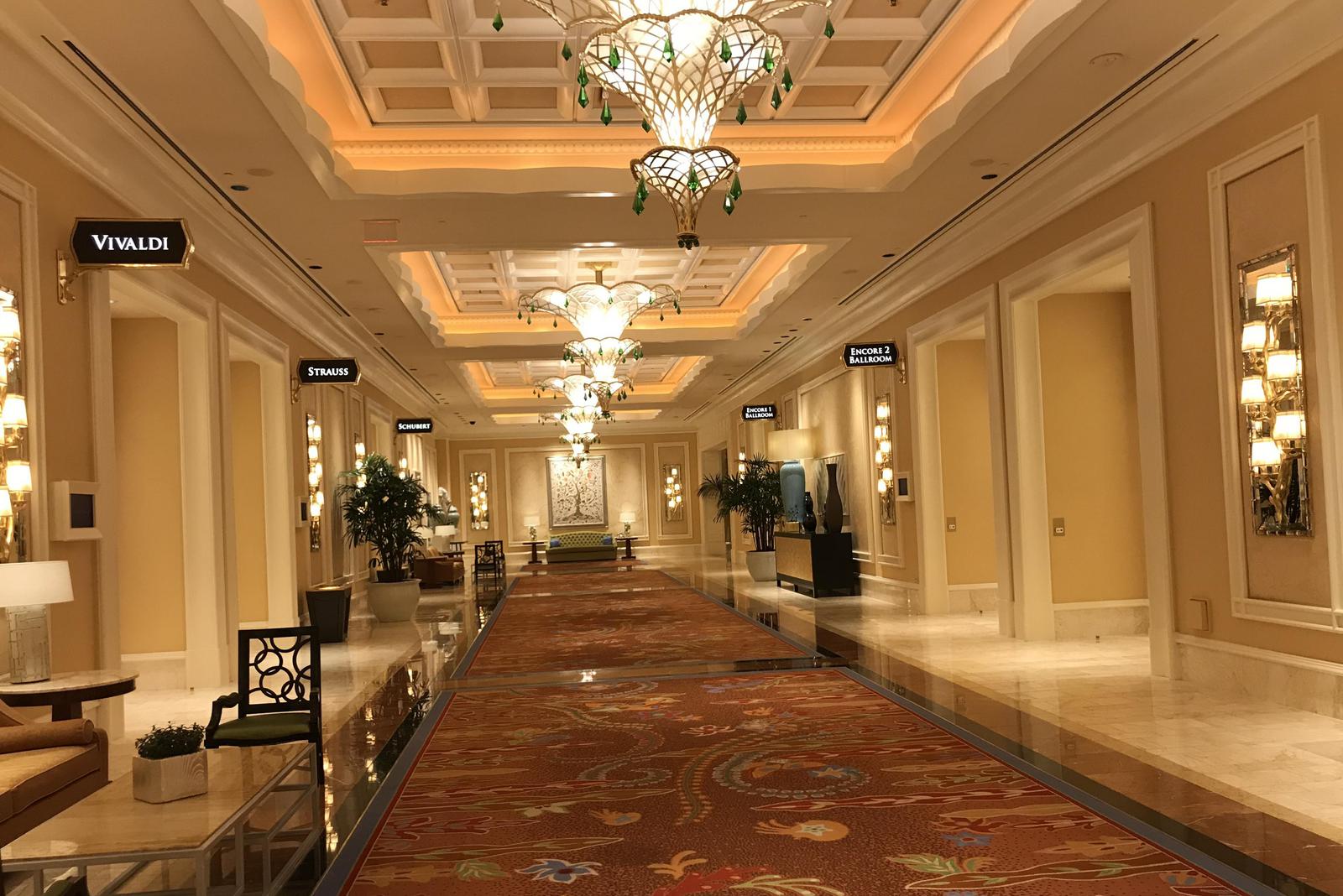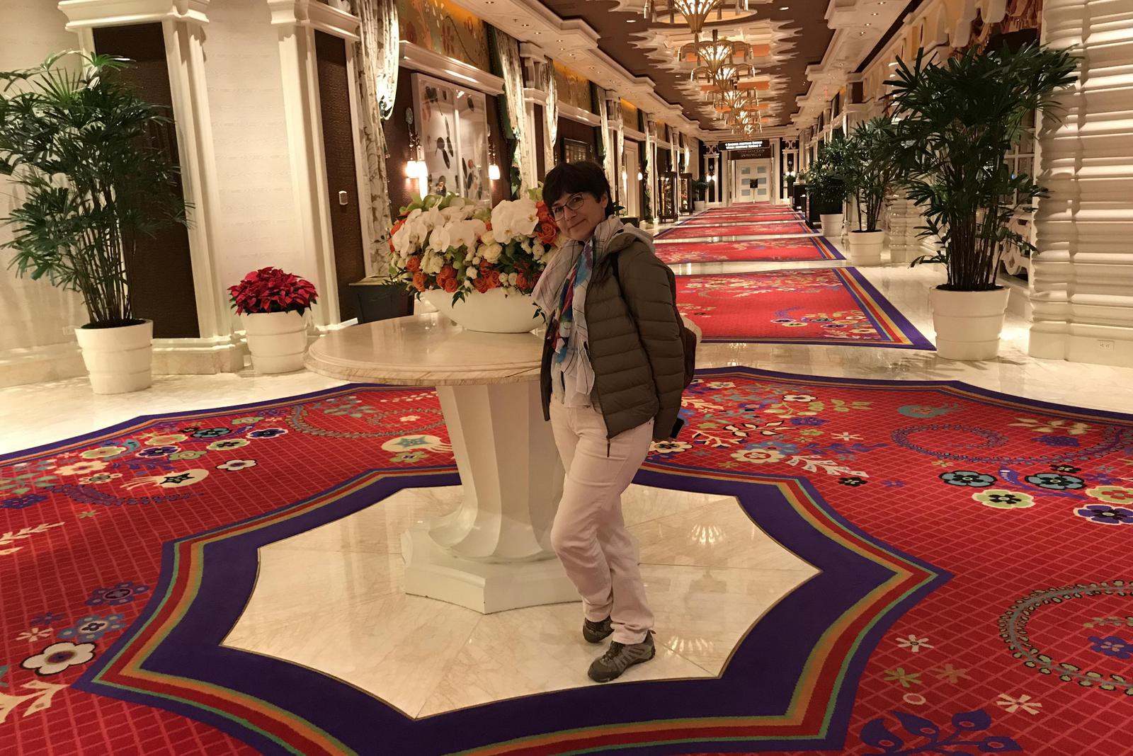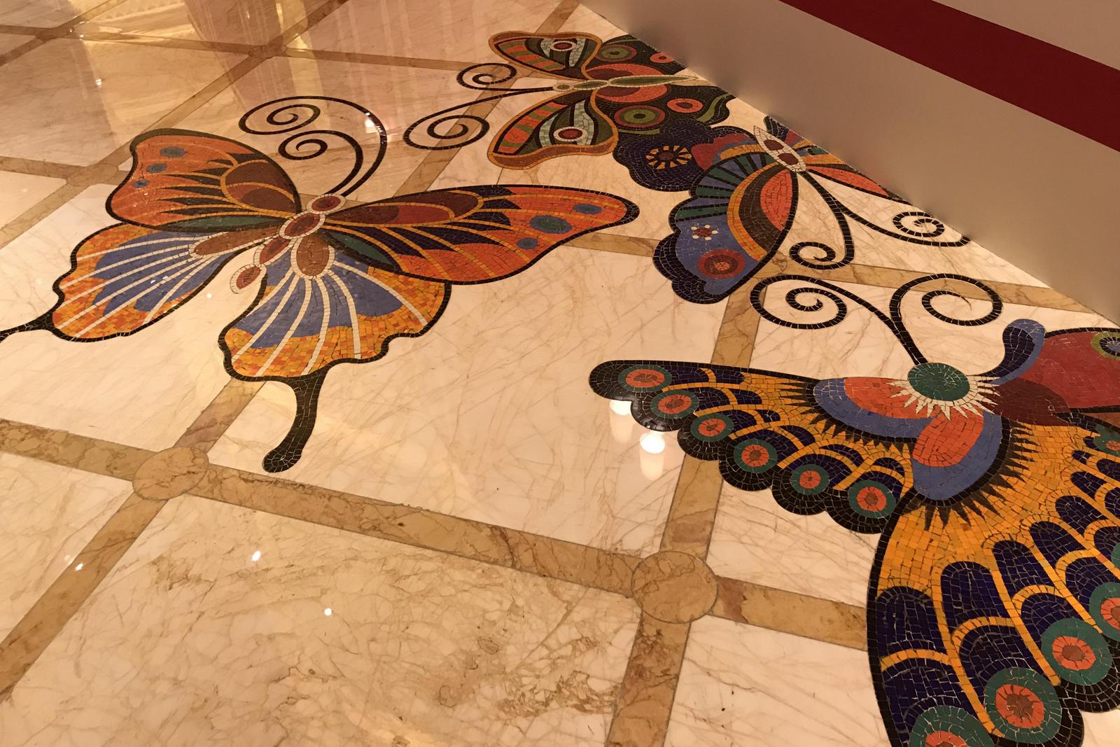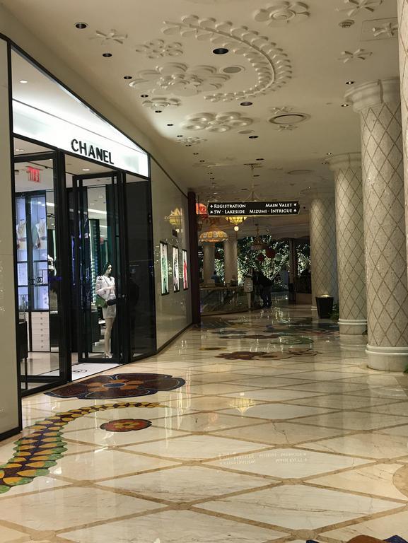 Comme dans les précédents hôtels-casinos, toutes les portes sont ouvertes et personne ne prête attention à notre présence. Nous poursuivons notre visite, traversons d'interminables couloirs jusqu'à rejoindre le rez de chaussée de l'extension Encore. Les sols sont extraordinaires, en marbre, incrustés de mosaïques aux motifs papillon, ou de grands tapis colorés et moelleux.