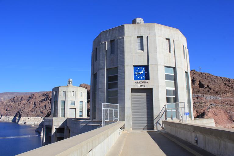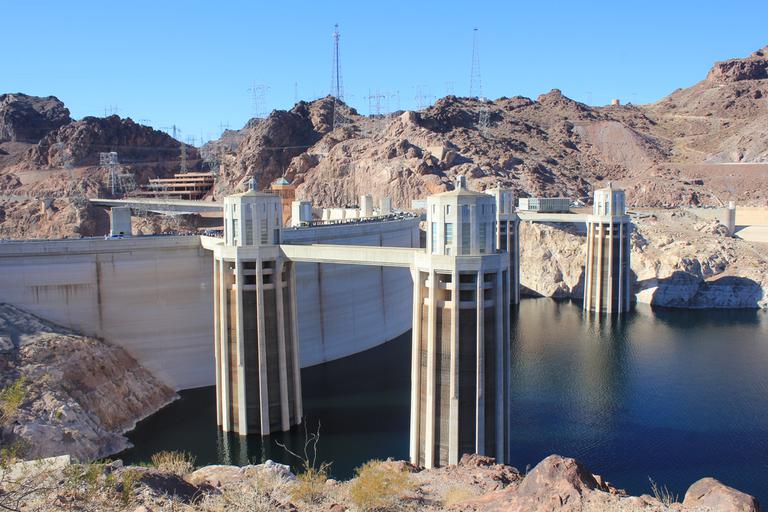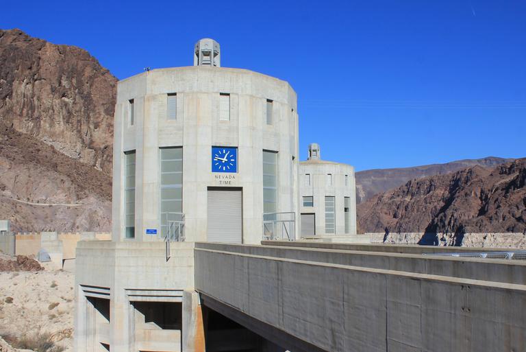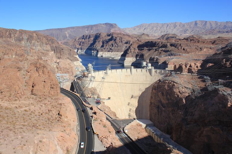 Des reliefs se dessinent à l'horizon. La route serpente enfin entre de grosses roches noires, puis ce sont les eaux du fleuve Colorado que nous apercevons, nous approchons du barrage Hoover.