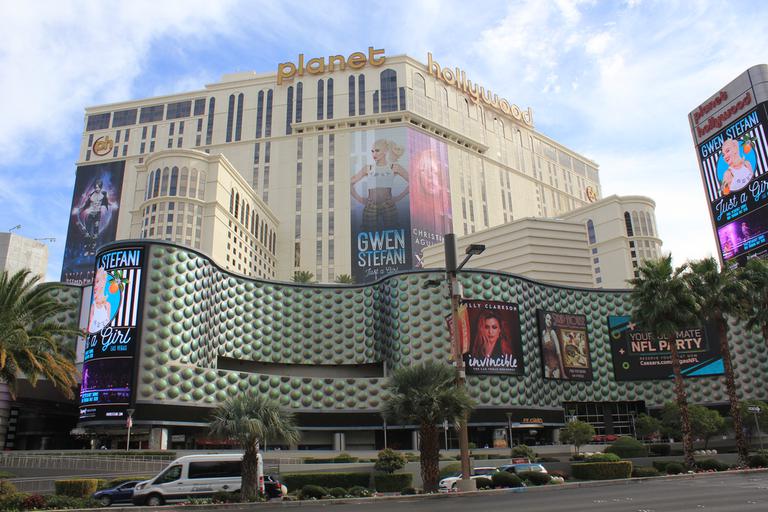 Nous enchaînons avec le Planet Hollywood. Vu de l'extérieur, ce casino n'a pas l'extravagance de son voisin, en revanche c'est sa galerie commerciale qui est à visiter impérativement. D'une manière générale, tous les grands casinos du Strip, le nom donné au Las Vegas Boulevard, sont constitués d'un hôtel avec plusieurs milliers de chambres, d'une immense salle de jeux, d'une galerie commerciale et de plusieurs restaurants. L'accès à ces diverses endroits est libre, en revanche il toujours très difficile d'en trouver la sortie car elle n'est jamais indiquée et souvent bien cachée afin que le joueur reste le plus longtemps possible dans le casino... Nous devons systématiquement traverser toutes les salles de jeux équipées de miliers de bandits-manchots et autre tapis de jeux. Je n'en ai pas de photos, d'une part parce qu'il est interdit d'en prendre, et d'autre part parce qu'étant rétifs aux jeux, nous traversons ces espaces sans trop y accorder d'intérêt.