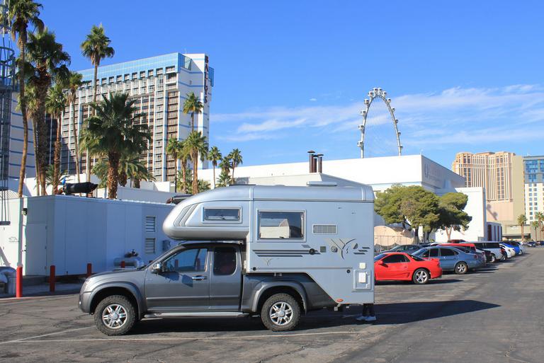 Nuit tranquille. Ce parking est assez calme, nous sommes assez loin des rues à grand passage et les mouvements de véhicules sont relativement rares. Nous ne sommes pas très loin de la High Roller Observation Wheel, la grande roue inaugurée en avril 2014. Haute de 167,60m, c'est la plus haute roue du monde ; à titre de comparaison, celle de Londres mesure 165m, soit 32m de moins que celle-ci !