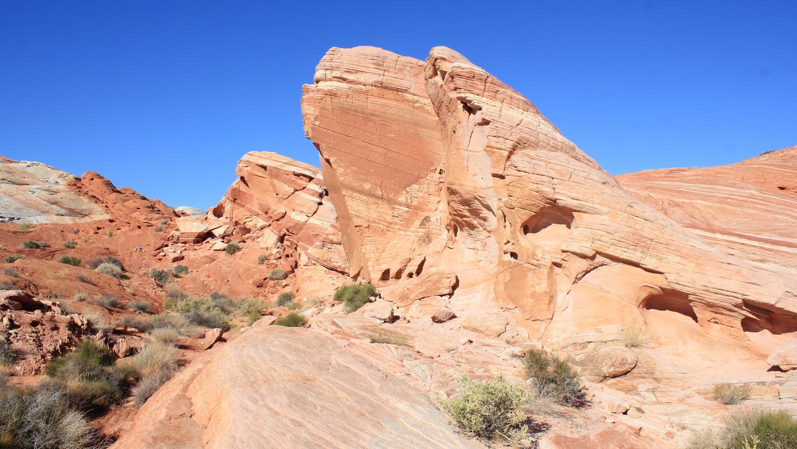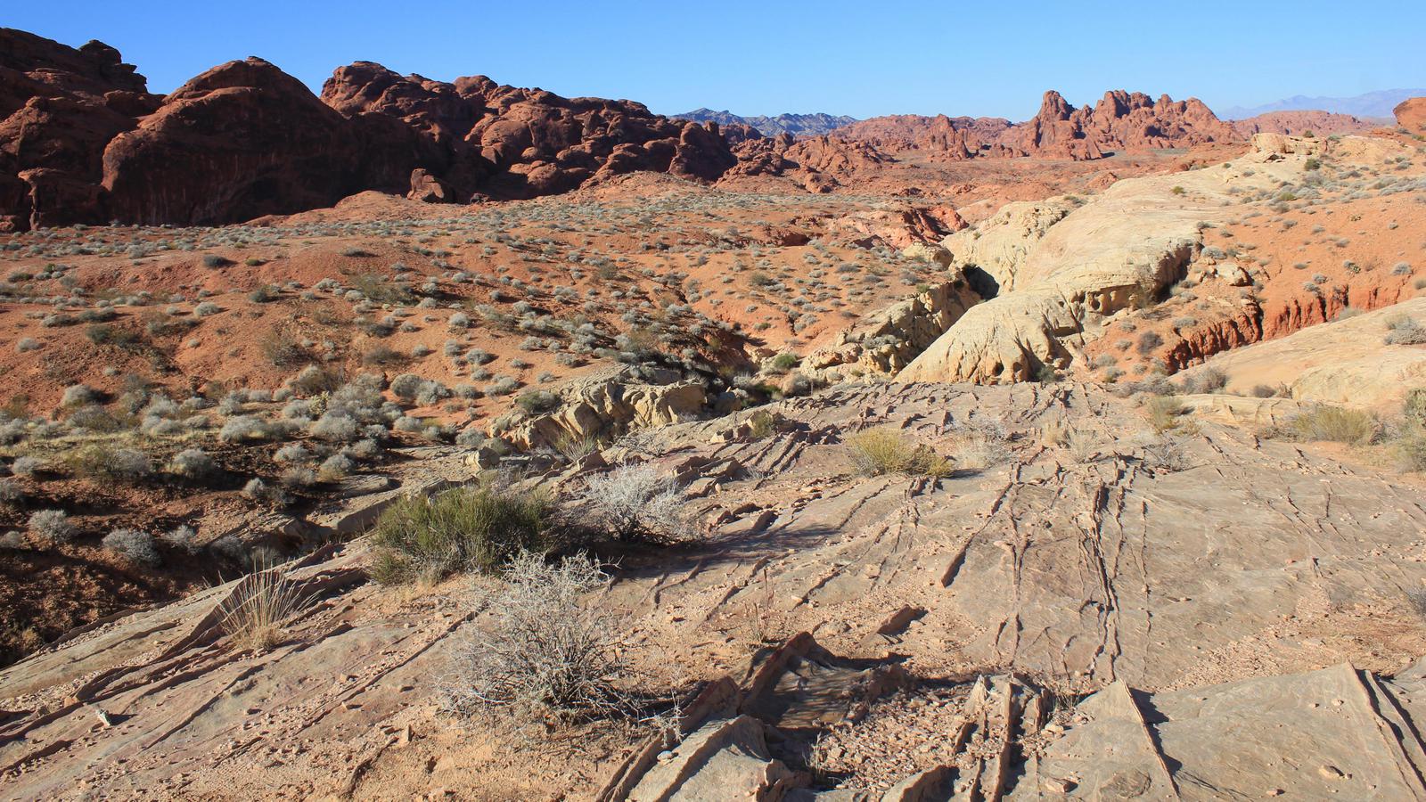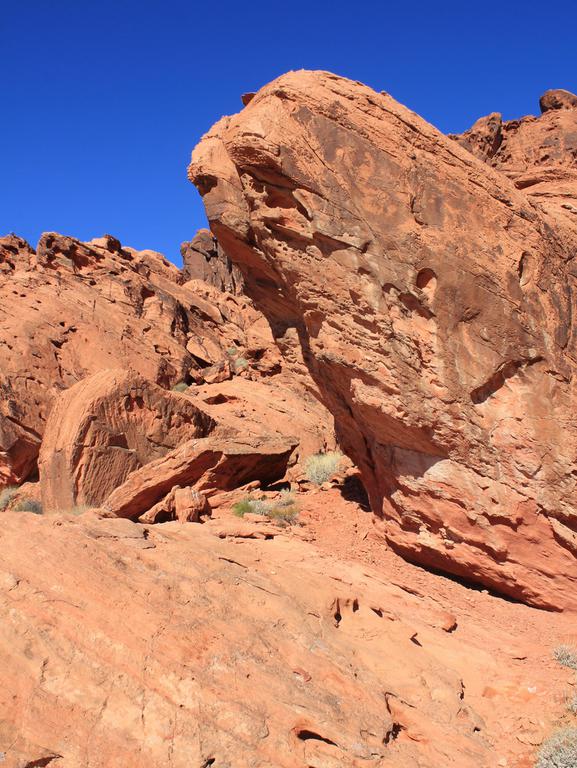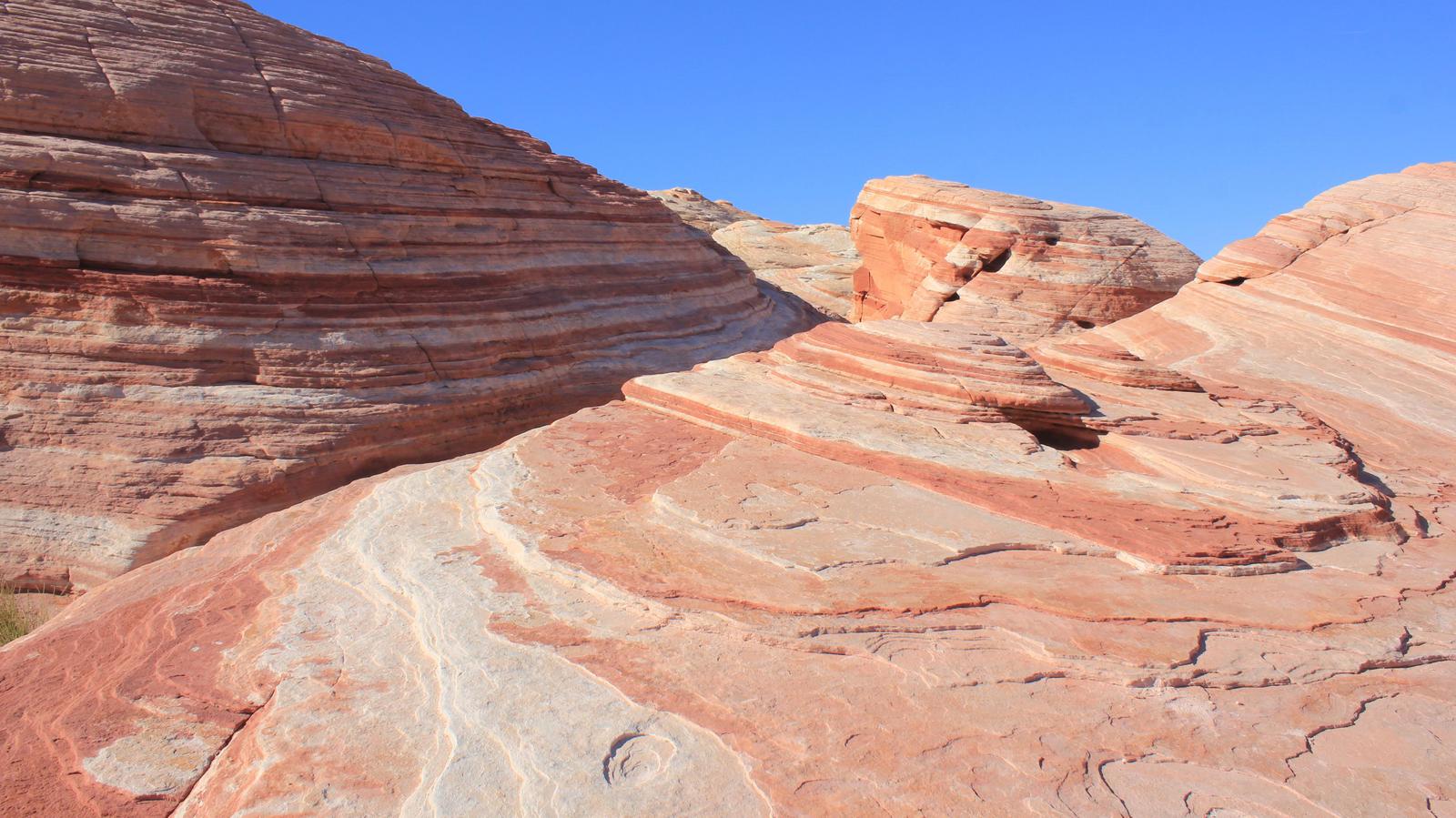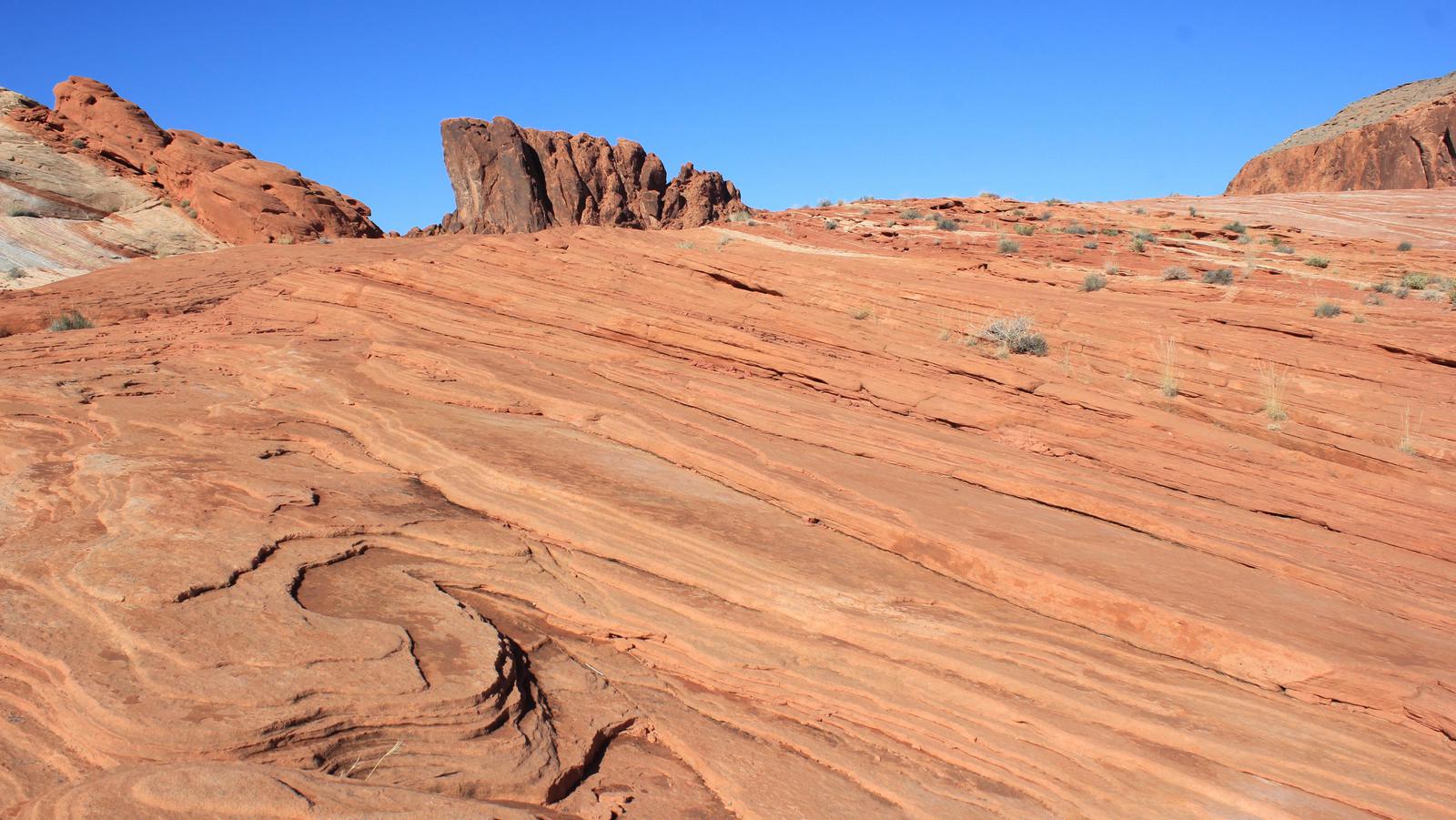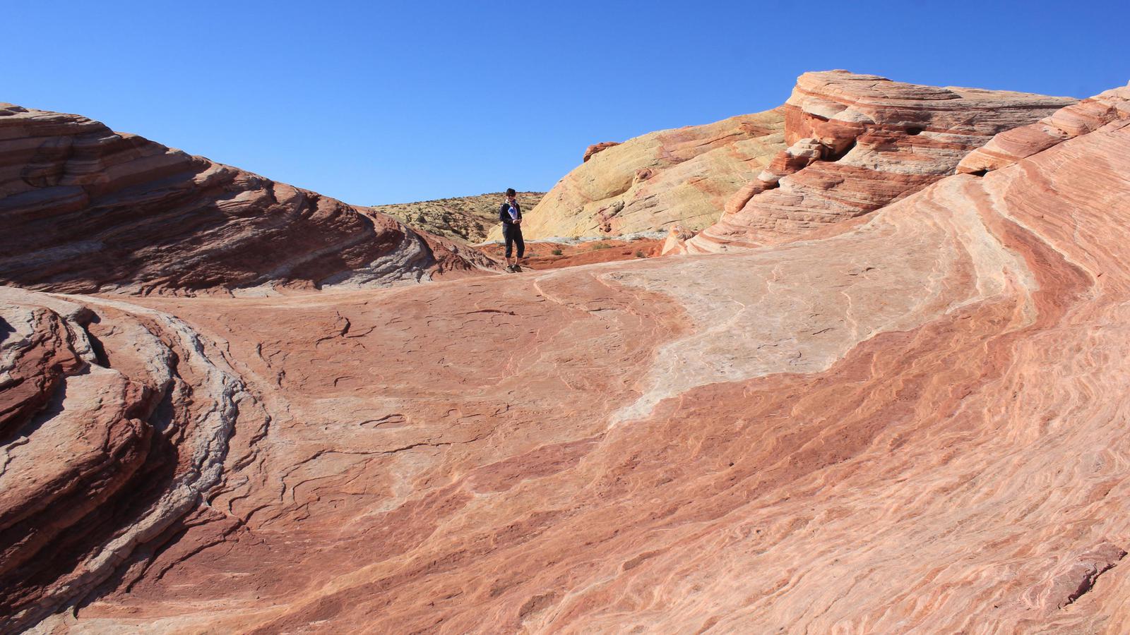 Nous suivons l'indication Fire Wave. Plusieurs panneaux rappellent aux visiteurs que les formations rocheuses sont fragiles et qu'il est impératif de rester sur le sentier. Hélas, rapidement les balises s'espacent jusqu'à disparaître totalement à l'approche de la fameuse vague. En l'absence de sentiers balisés, les touristes "se lâchent", et marchent sur toute la zone, épauffrant les feuilletés de roches si fragiles...