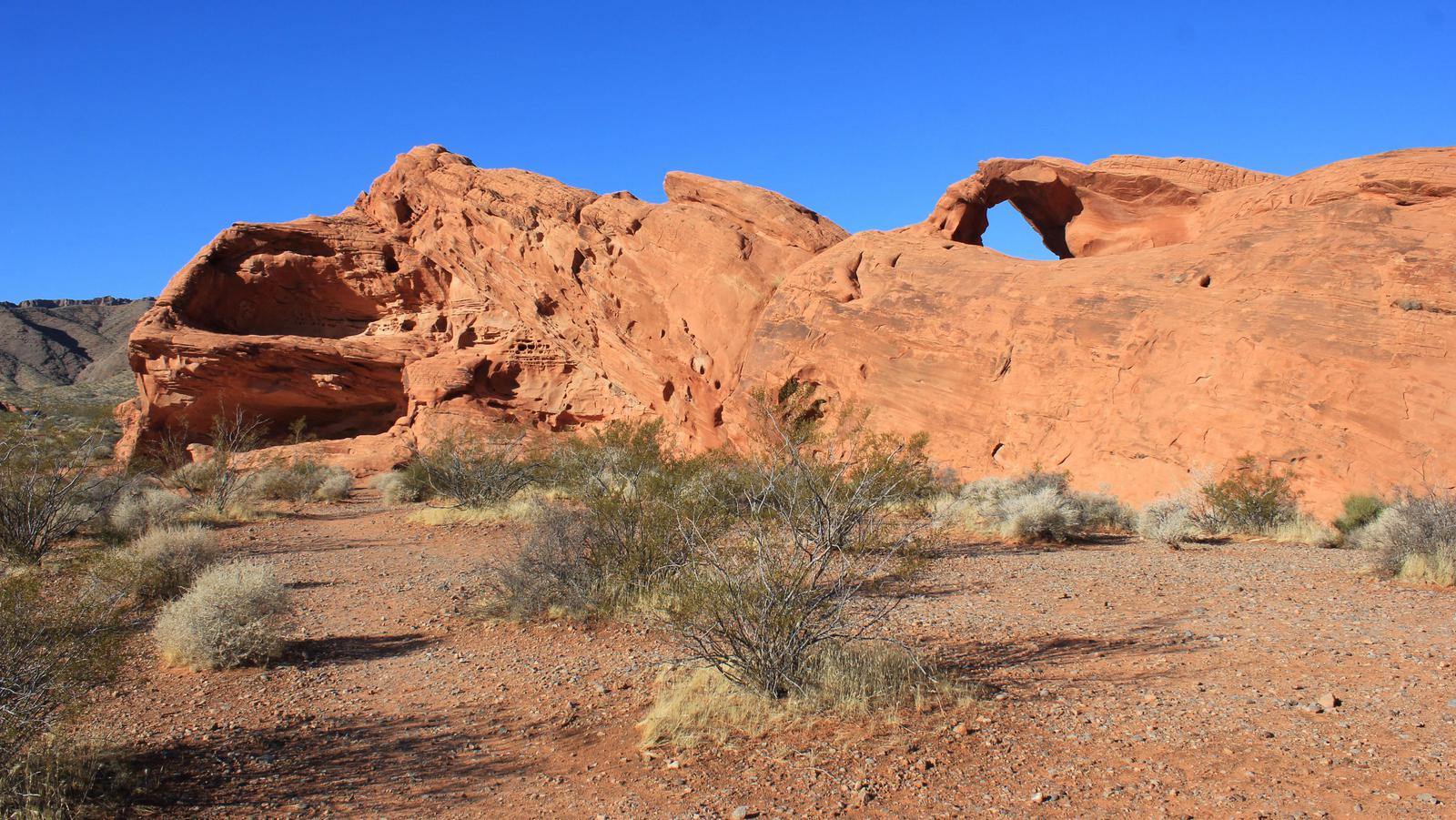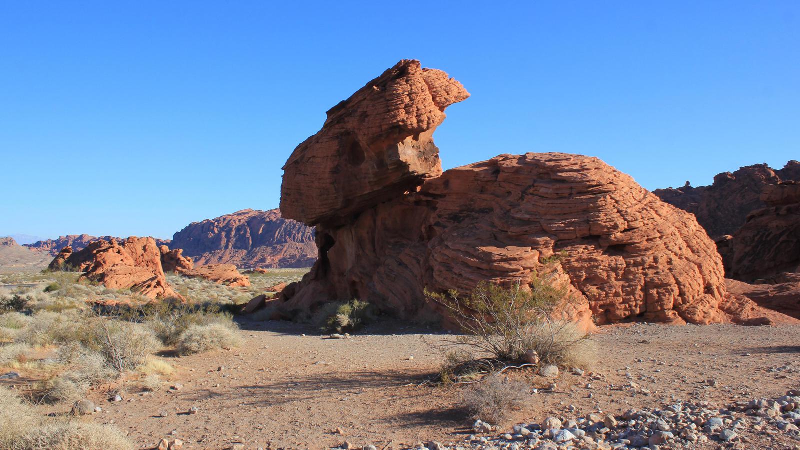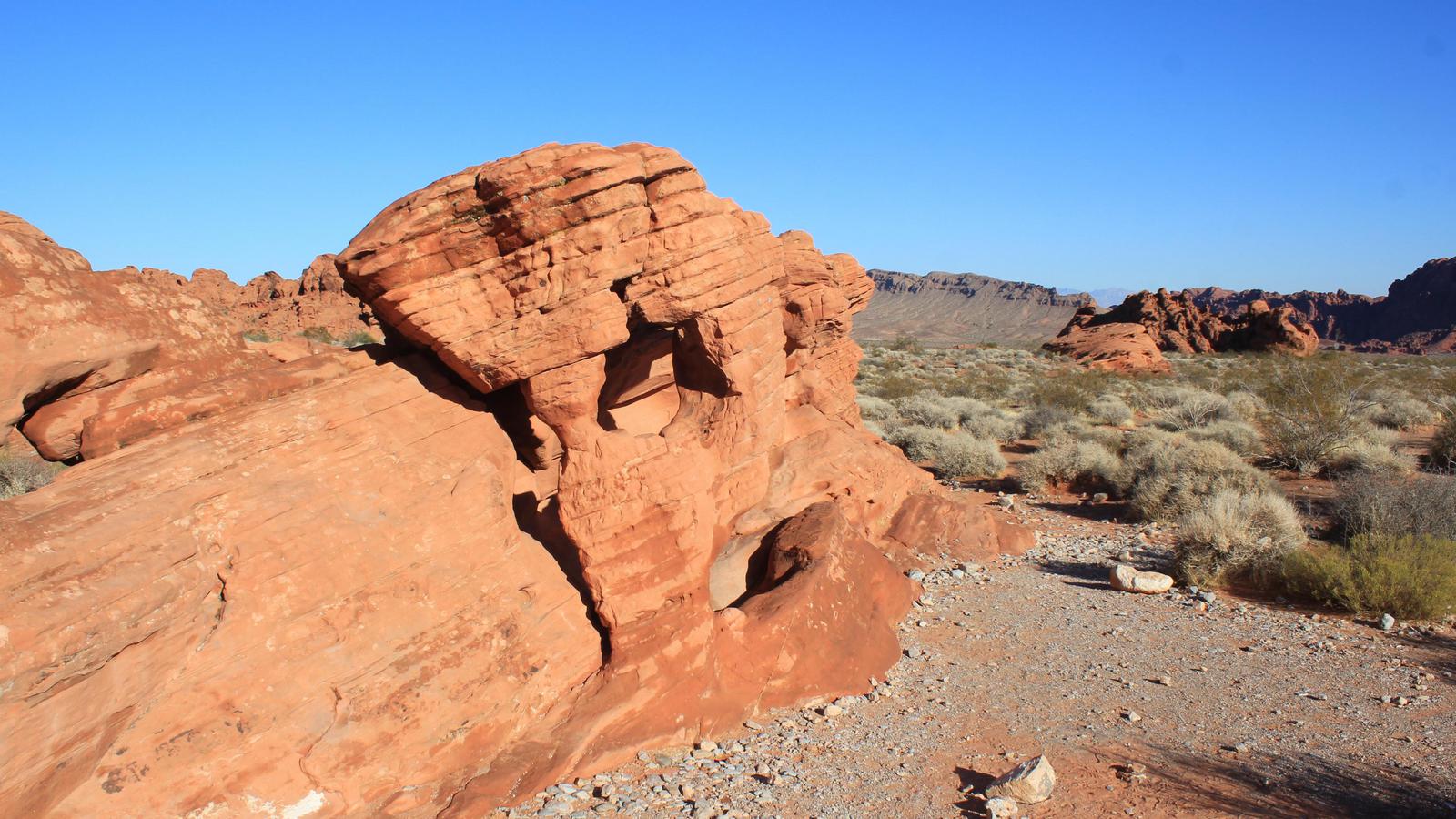 Il est temps de quitter le parc. Nous sortons par l'est en direction du lac Mead. Juste avant de franchir la barrière, nous faisons une dernière halte pour voir Elephant Rock. Celui-ci est également dans l'ombre et une belle tarentule se promène sur le sentier menant au rocher. Il ne nous en faut pas plus pour faire demi-tour...
