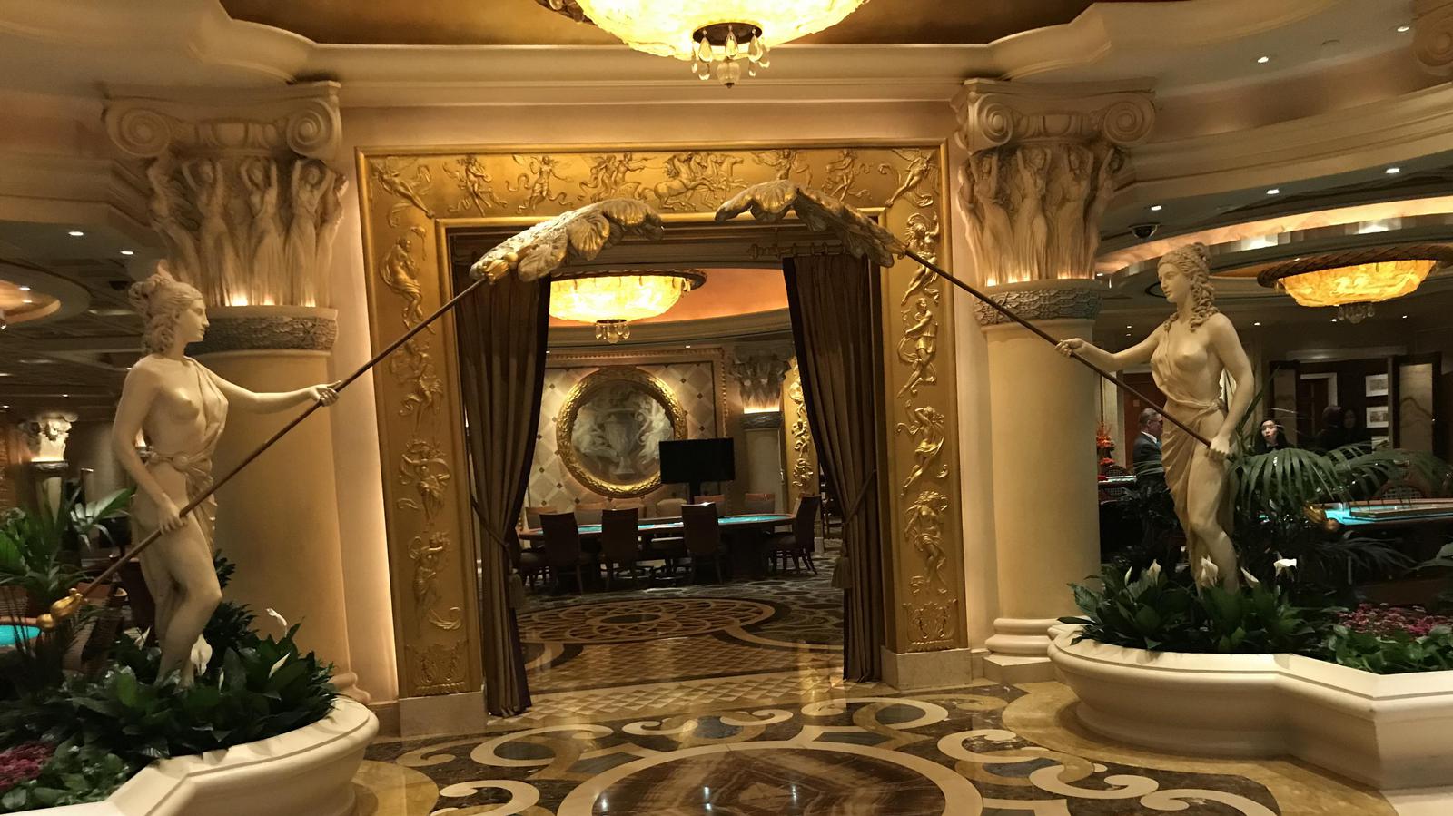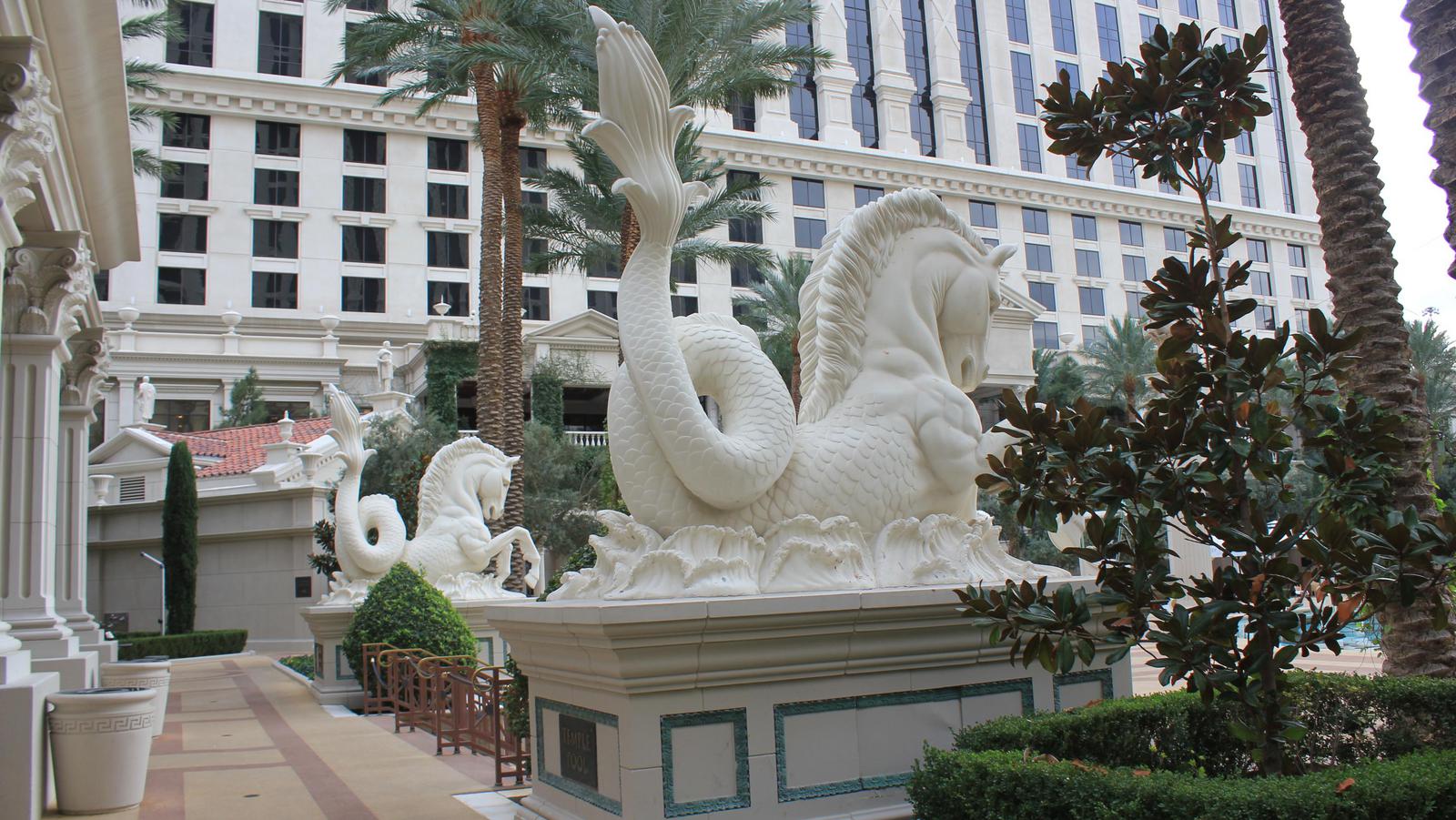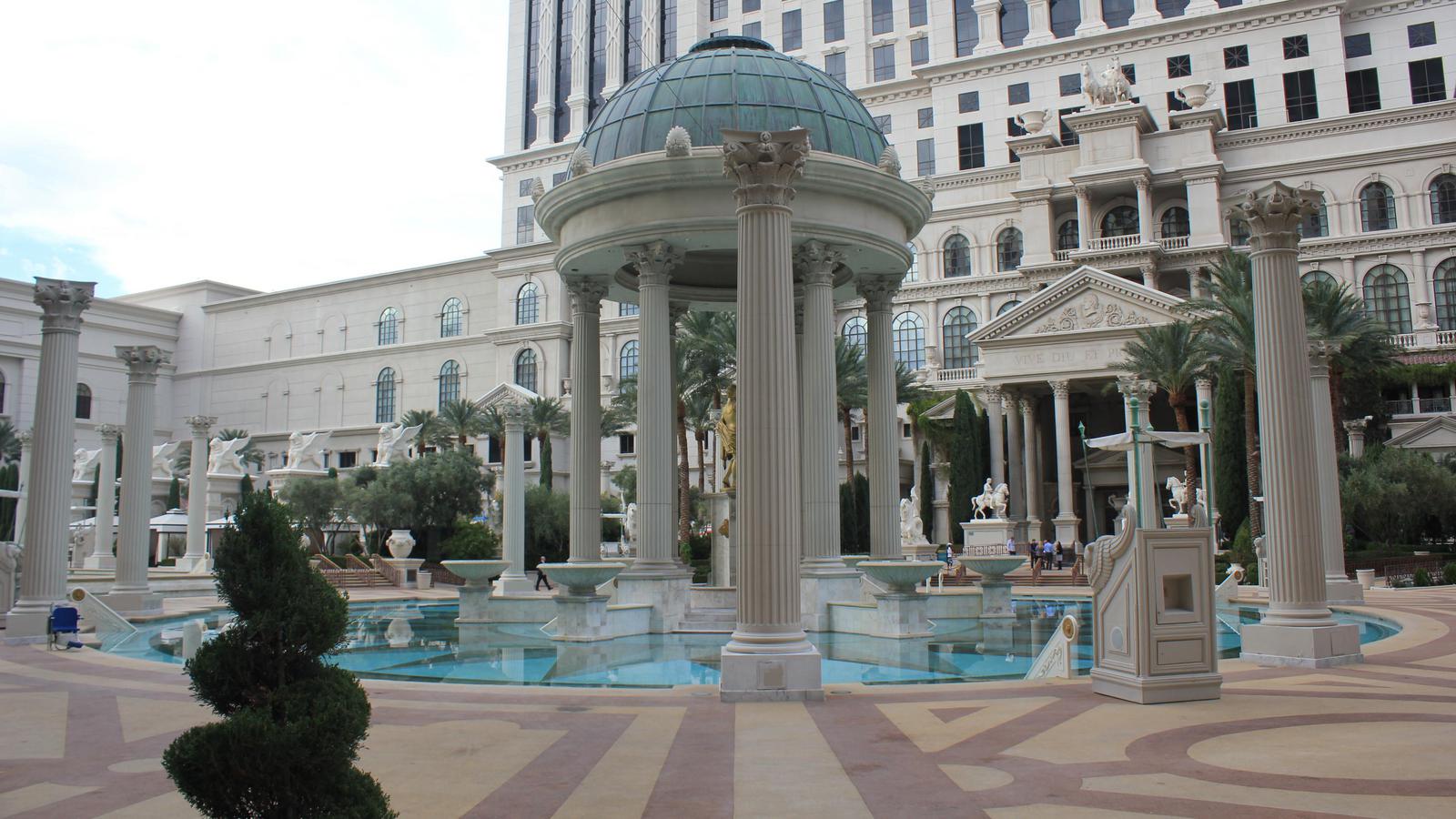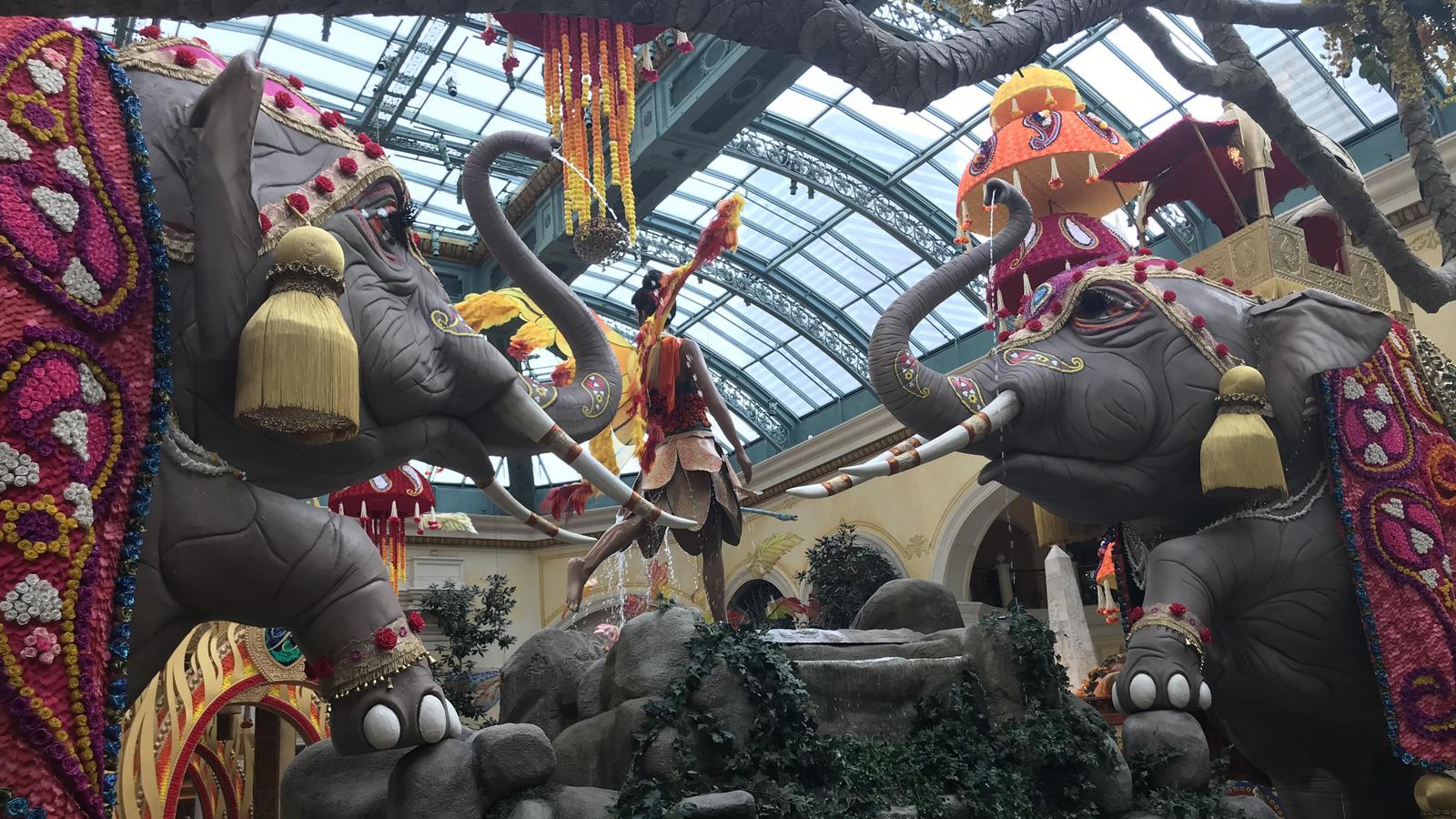 L'entrée du casino se distingue par son plafond couvert de fleurs en verre soufflé, puis laisse place à une impressionnante serre présentant une composition florale dédiée à l'Inde plutôt inattendue... Pour notre part, nous cherchons le Buffet où nous avons décidé de nous restaurer. Nourriture et boissons non alcoolisées à volonté, $32 par personne. Ce n'est pas le moins cher, mais il est présenté comme un des meilleurs de Las Vegas. Les plats sont corrects, sans plus. Nous quittons le Bellagio, contournons le bassin et entrons dans le casino voisin, le Caesar Palace...