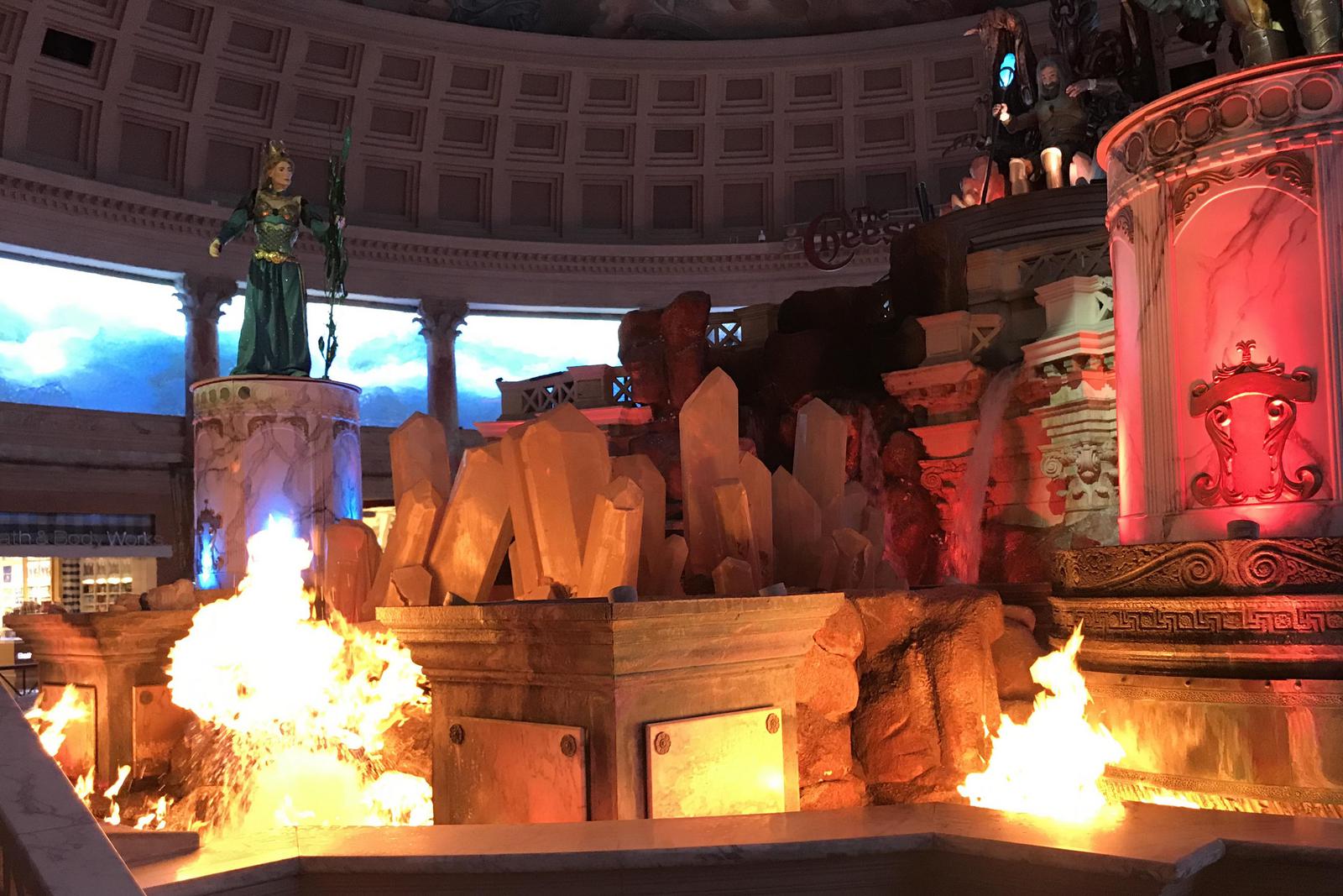 La galerie se termine devant la fontaine Atlantis. Nous avons de la chance, nous arrivons juste au début du spectacle. Pesonnages animés s'élevant sur leur piedestal, jets d'eau et de flammes, l'animation est peu audible mais plutôt originale...