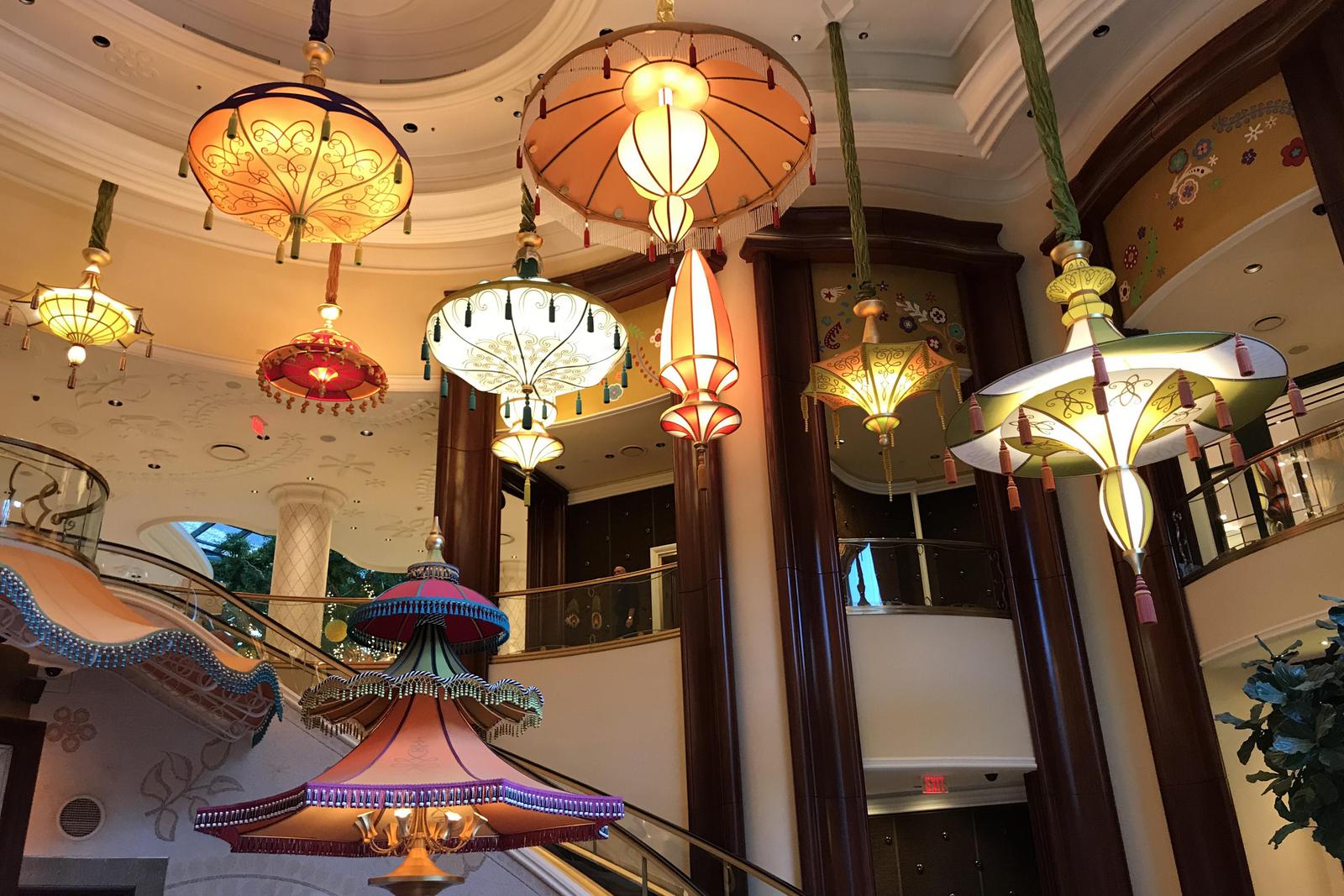 La salle de jeux est juste derrière, en revanche un balcon attire notre attention dans un angle du jardin. A l'aplomb de celui-ci, nous découvrons un minuscule petit salon de thé lové entre deux magnifiques escaliers mécaniques courbes et ornés de splendides lustres en verre. La terrasse se prolonge sur l'extérieur jusqu'à un petit bassin, the Lake of Dreams, où chute un rideau d'eau. A n'en pas douter, ce doit être agréable de siroter un verre ici lorsque les températures sont accablantes...