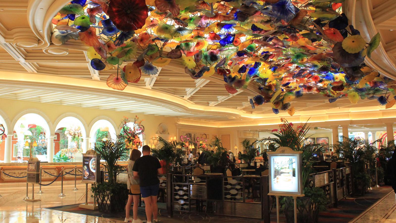 Nous quittons cet univers, traversons le Strip et entrons dans le Bellagio. L'architecture de ce gigantesque casino inauguré en 1998, revendique s'inspirer du village de Bellagio. Pour nous qui y sommes allés il n'y a pas si longtemps, la ressemblance n'est pas évidente, si ce n'est les constructions au bord du bassin qui pourraient rappeller les rivages du lac de Come...
