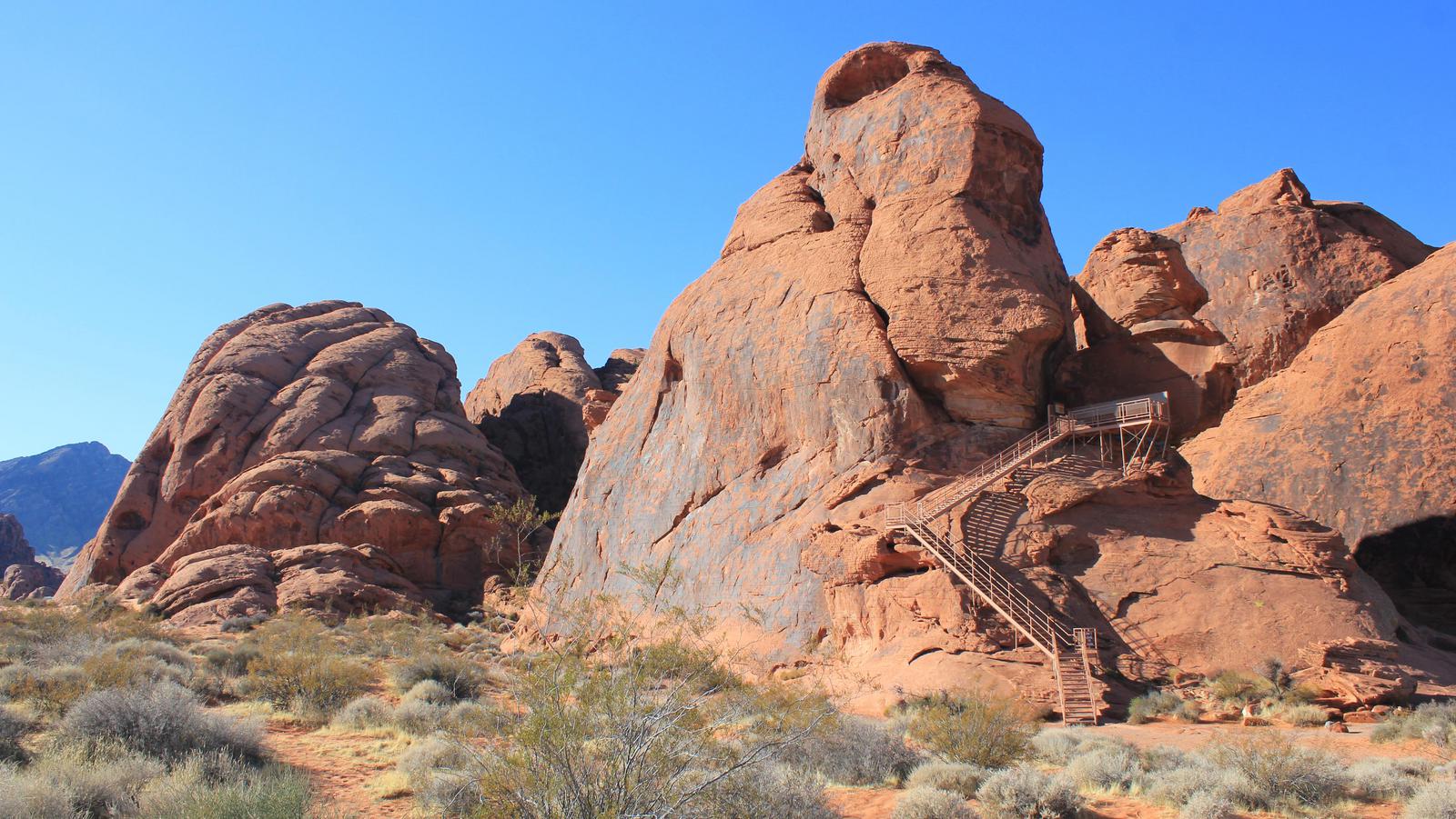 Nous poursuivons et quittons la route principale pour une scenic loop en direction du campground. Après avoir profité de l'aire de servive, nous découvrons Arch Rock, une petite arche posée sur un rocher, et Atlatl Rock un rocher en équilibre vers lequel on accède par un escalier métallique pour observer des pétroglyphes âgés de plus de 3000 ans.
