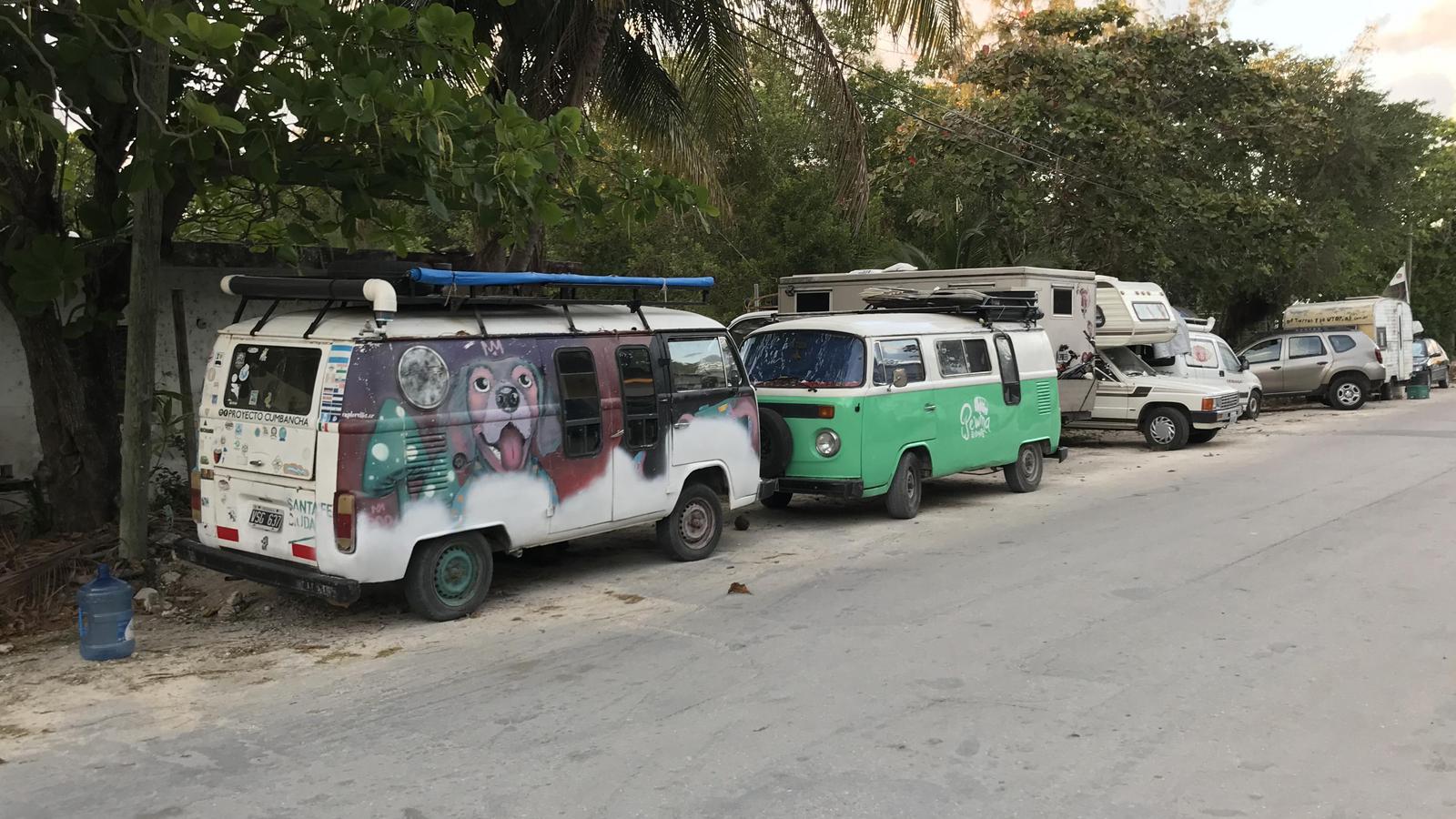- En Basse Californie, nous rencontrons beaucoup de camping-cars américains et canadiens. Au-delà ils se font plus rares, rassemblés par petites communautés installées à l'année comme sur le camping de los Tres Amigos près de Mazatlan.
