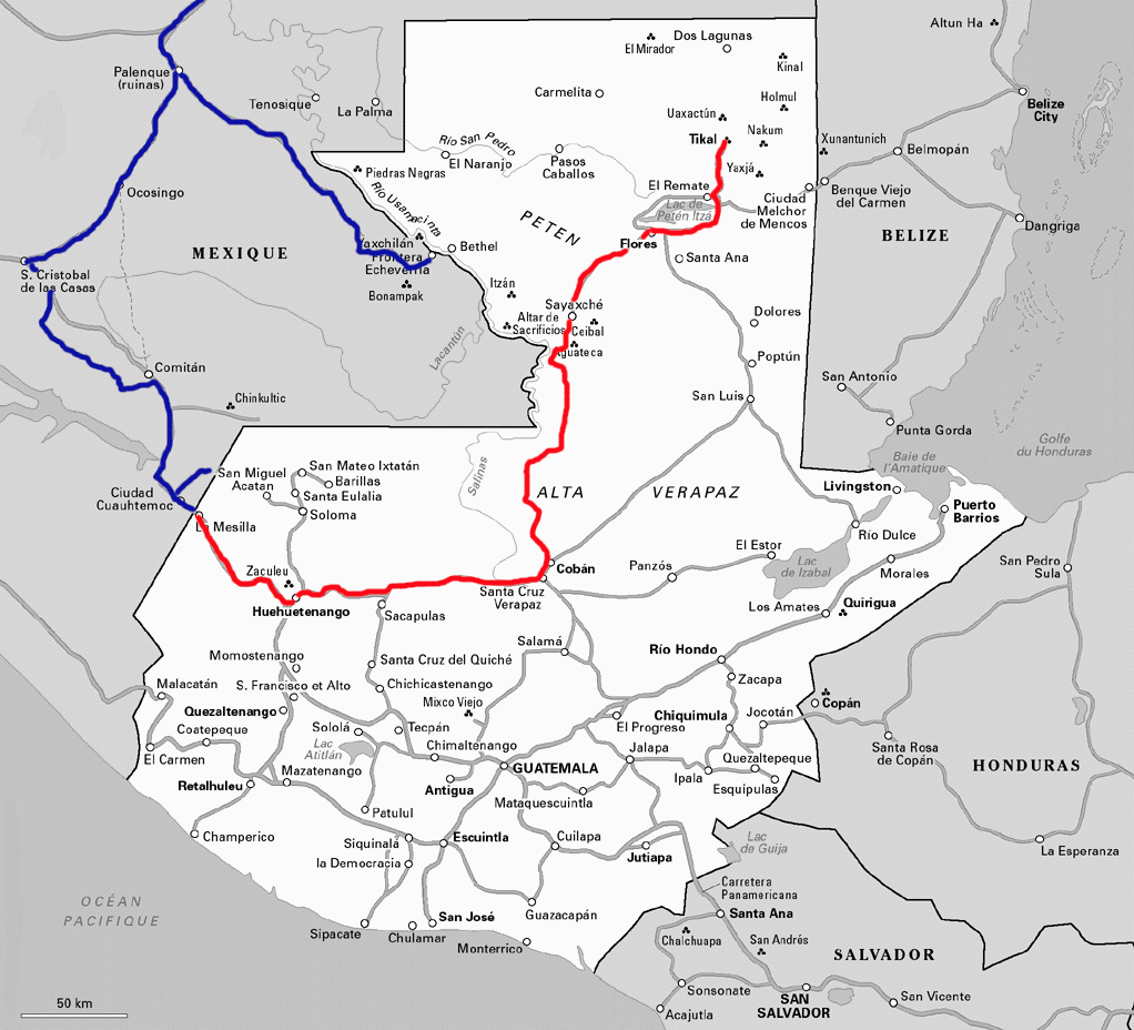 Nous passons Huethuetenango et prenons la direction de Tikal par Coban. Nous suivons la route RN-7W, une route de montagne avec de rudes montées et de sévères descentes. Nous traversons plusieurs grosses agglomérations, notre moyenne est une nouvelle fois très faible. Nous nous arrêtons pour la nuit dans la cours d'une station service à la sortie de Cunen.