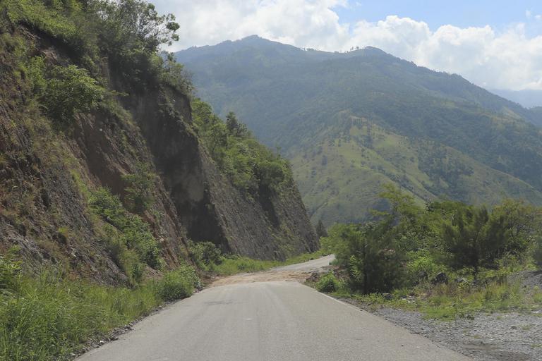 Mauvaise surprise, c'est une piste en terre de l'autre côté du pont. Notre vitesse moyenne baisse encore... Un petit groupe d'enfants nous immobilise une nouvelle fois en pleine montagne, l'un deux simulant même se coucher sous nos roues. Ils sont très, très jeunes, réclament de l'argent, à boire et à manger. Nous ne cédons pas, c'est dur, mais si nous acceptons aujourd'hui leur chantage, que feront-ils lorsqu'ils auront une machette à la main ?