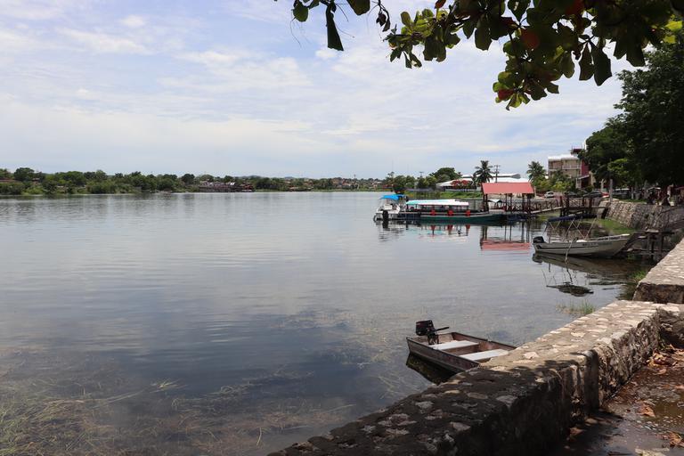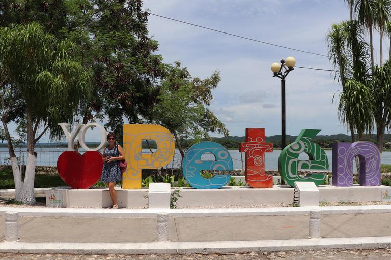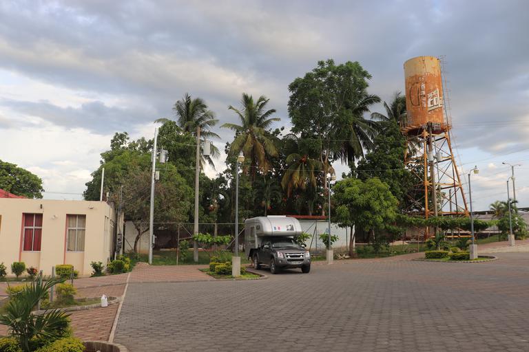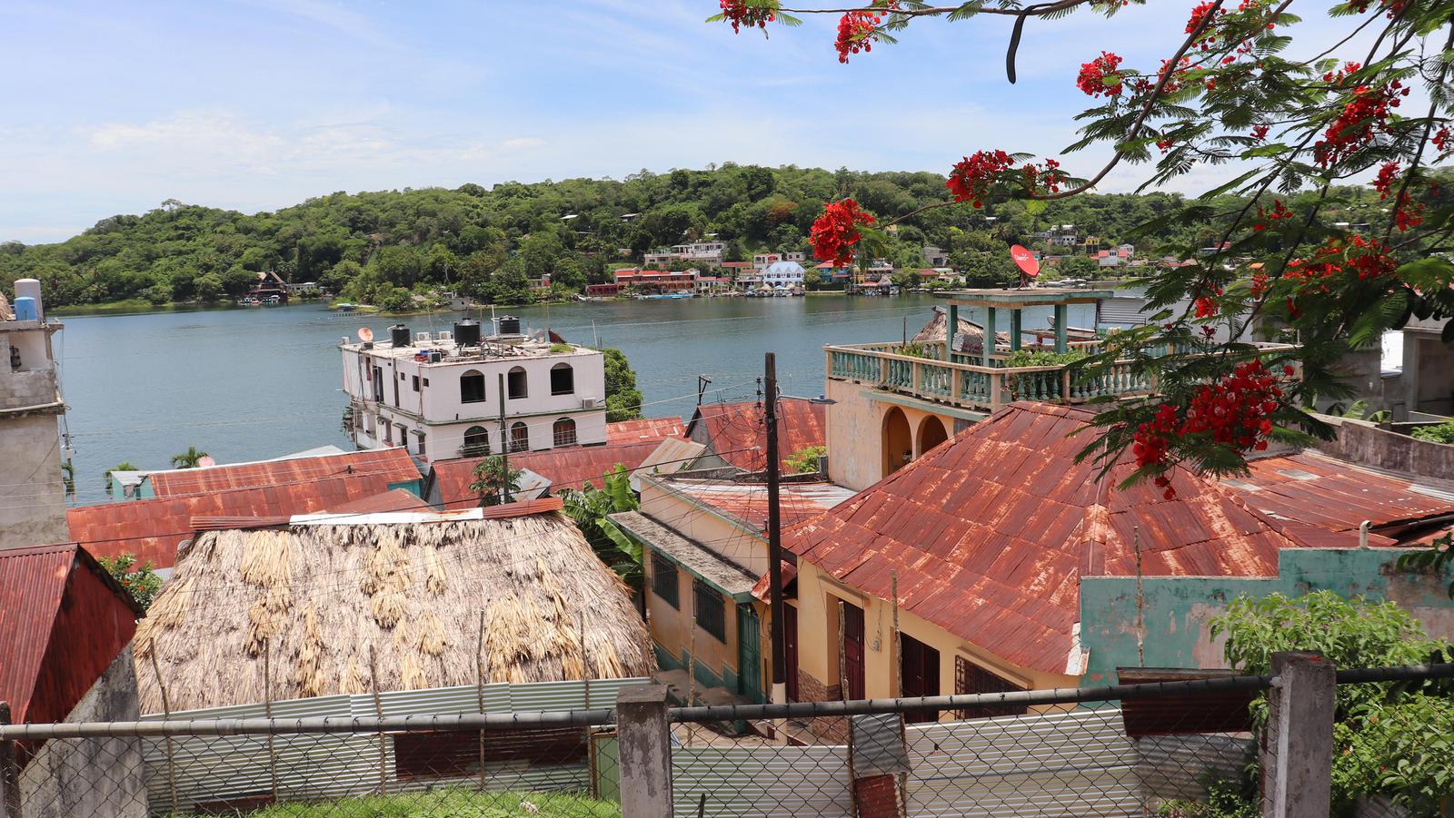 Florès est la capitale du département du Peten. La partie ancienne de la ville se situe sur une île à une extrémité du lac Itza Peten, mais ce n'est qu'une toute petite partie de celui-ci qui s'offre à nous depuis Florès. Deux villes se sont développées de part et d'autre du pont qui relie l'île à la terre ferme, Santa Elena et San Benito. C'est près de la mairie de cette dernière et au pied du château d'eau, que nous venons de passer une nuit tranquille.