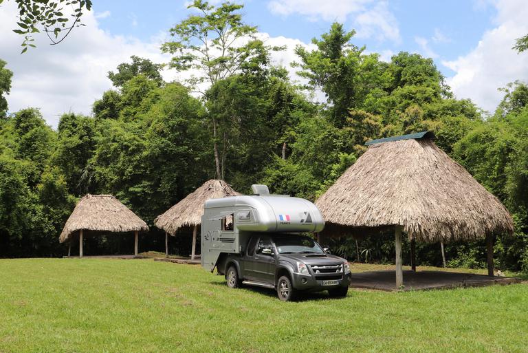 Nous revenons à la voiture et partons pour Tikal. Nous y arrivons au bout d'une heure, et achetons nos billets pour le lendemain matin, 150Qtz par personne. Nous payons également le camping, 50Qzl par personne et allons nous installer sur la grande prairie au milieu de la jungle.