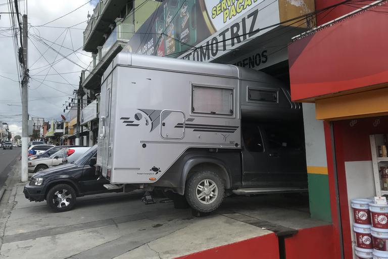 La plupart des boutiques sont encore fermées et la circulation est beaucoup plus fluide que lors de notre dernière tentative. Nous passons la douane mexicaine, les trois douanières en poste nous laissent passer sans faire le moindre geste. Je m'arrête devant les cocottes guatémaltèques, un homme asperge aussitôt notre véhicule tandis que nous retournons payer cette fameuse fumigation. Nous n'avons toujours pas de quetzal, un homme me propose le change. Alors que nous avions eu 30Qtz pour 100 pesos lundi, celui-ci m'en offre 240 pour 600 aujourd'hui! C'est plus que le cours que nous avons sur notre appli, nous acceptons.