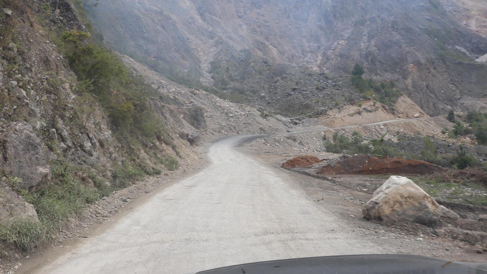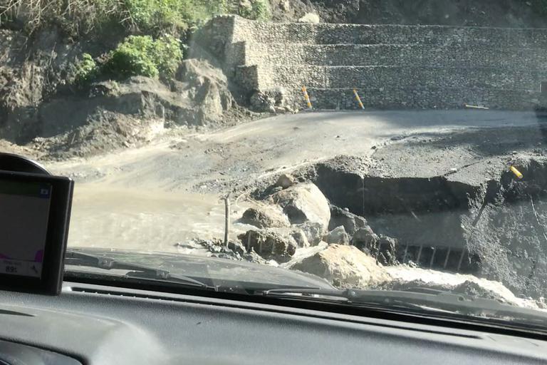 Un gros orage s'est abattu sur nous cette nuit. Plusieurs éboulements se sont poduits et les engins de chantier sont déjà à l'oeuvre pour rétablir la circulation. Quelques kilomètres à la sortie de Cunen, c'est un virage qui a été emporté par le torrent...