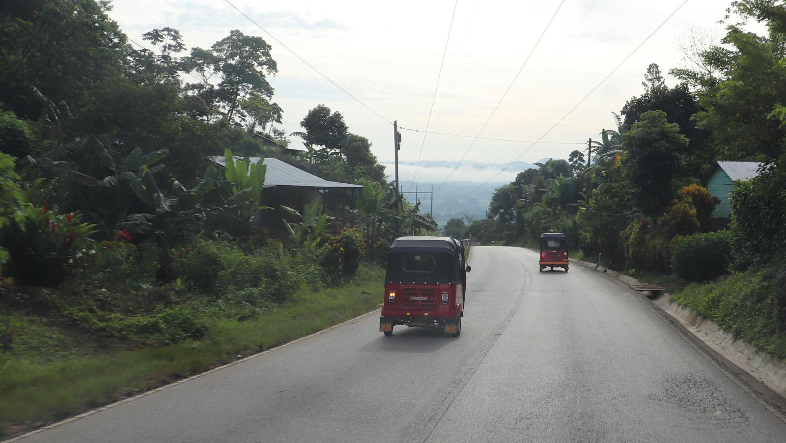 La route AV9 que nous suivons est toujours aussi exigeante, de part les reliefs traversés et son importante circulation. Nous sommes samedi et beaucoup de villageois se rendent dans les marchés des villes les plus proches, notament à Chisec, l'autre grande ville du département de l'Alta Verapaz. Ils se déplacent en tuk-tuk ou dans la benne des pick-ups, lesquels roulent à tombeau ouvert et me doublent dans la moindre descente. Ici, l'habitat traditionnel a été épargé par l'ouragan et nous voyons encore de nombreuses maisons en bois couvertes de tôles.