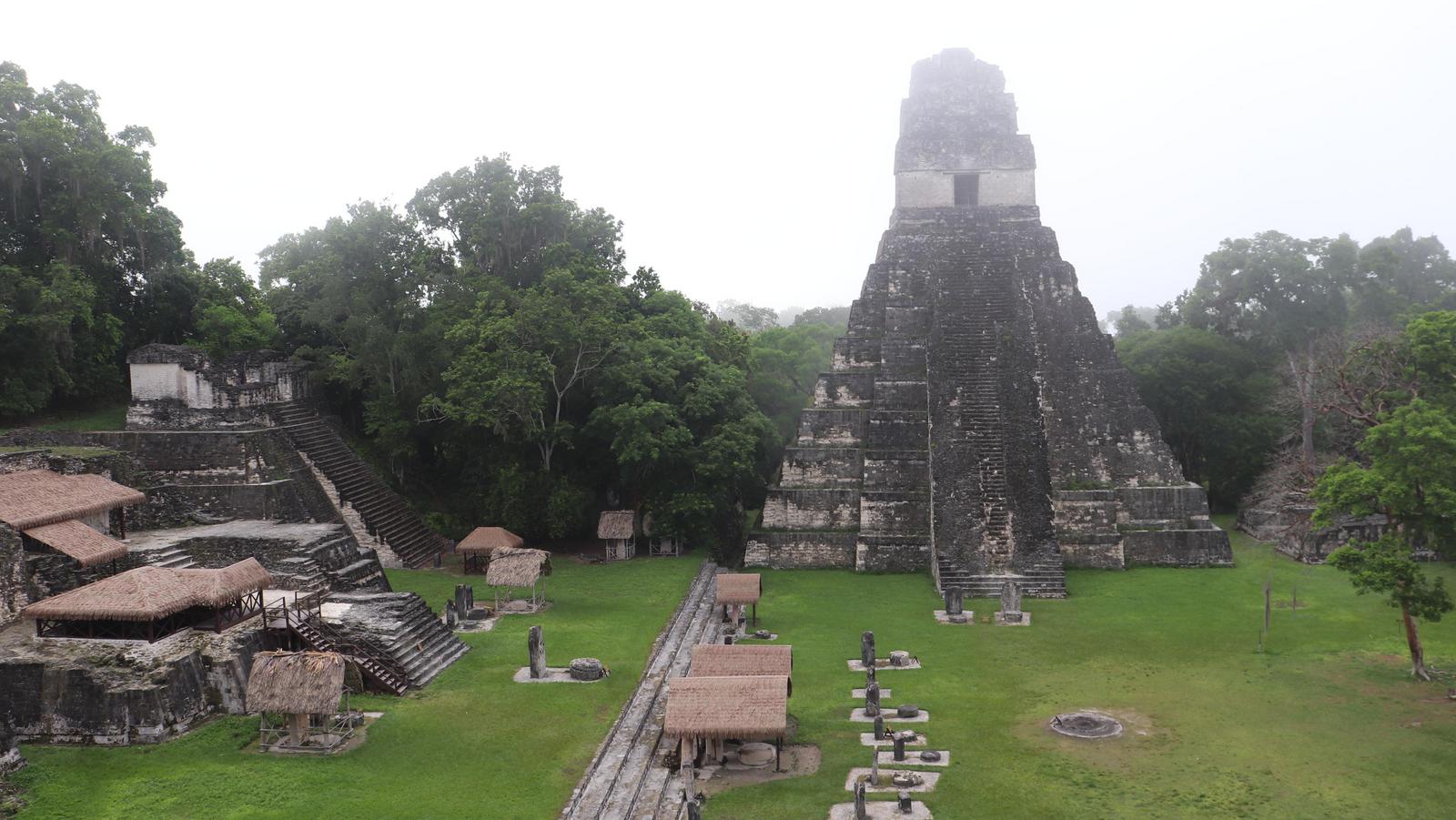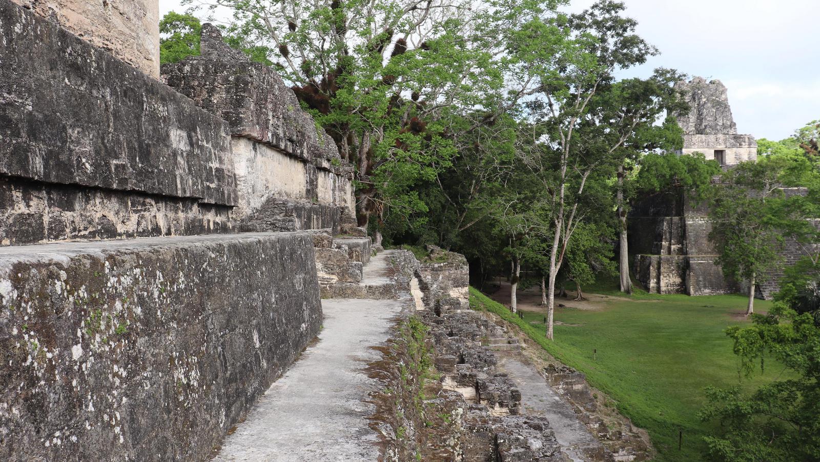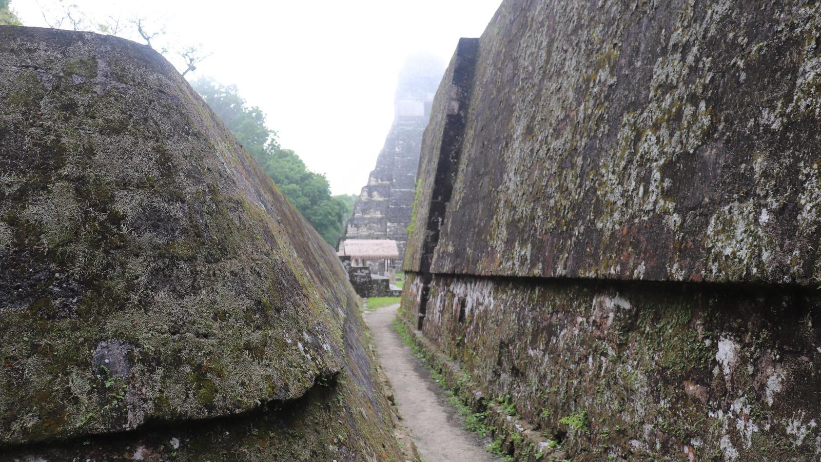 Nous arrivons dans la première zone de temples et découvrons Gran Plaza. C'est l'ensemble le plus impressionnant de Tikal. Il est constitué de deux pyramides se faisant face, le temple du Grand Jaguar (I) et le temple des Masques (II). De part et d'autre de ceux-ci, l'Acropole nord et l'Acropole centrale, des ensembles édifiés les uns sur les autres, un empilement de palais, modifiés au fil du temps. Une structure extérieure permet de grimper sur le temple des Masques. Nous y montons et attendons que la brume se lève... Deux perroquets s'agitent au-dessus de nous, puis disparaissent.