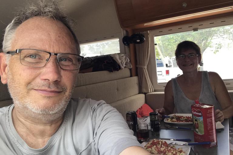 Nous revenons vers midi, effectuons un premier dépoussiérage et prenons notre premier repas à l'intérieur du camping-car. Paul nous rapporte la batterie. La voiture démarre, nous allons placer la cellule sur un emplacement de camping et la raccordons à l'électricité.