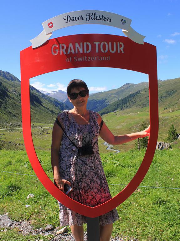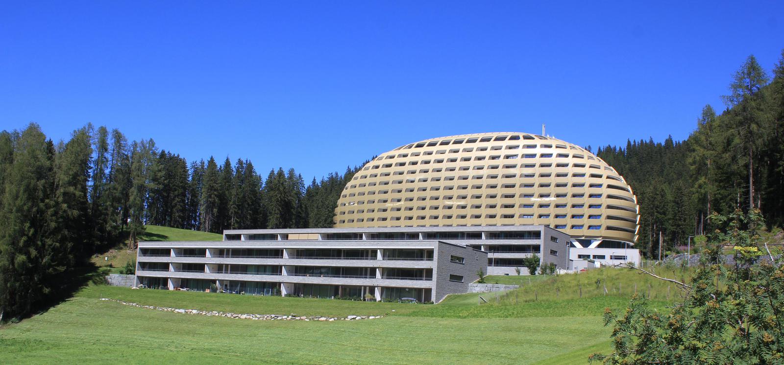 Passé le très beau Walensee, nous prenons la direction des Grisons, Klosters puis Davos. A l'entrée de cette dernière, nous bifurquons vers le col de la Flüela. Une construction attire notre attention, l'Hôtel Intercontinental de Davos avec ses formes courbes et sa couleur dorée. L'architecte münichois y voit une pomme de pin couchée, il est surnommé l'oeuf d'or...