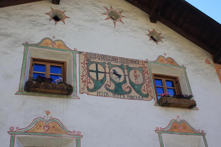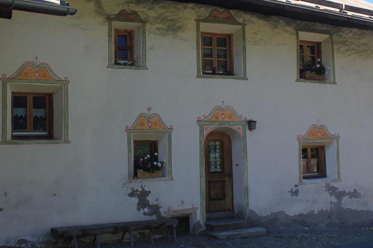 Nous nous arrêtons à Santa Maria, un village avant Müstair. Nous retrouvons l'architecture typique de la Basse Engadine que nous avions découverte à Scuol en 2010, melant jambages et linteaux biais et peintures ornementales.