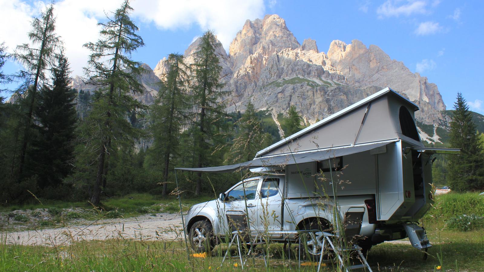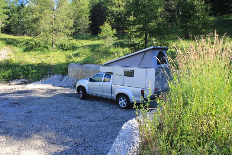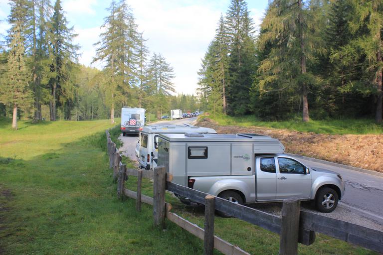 Nous faisons le plein de gasoil et revenons vers le col. Nous nous installons au-dessus du départ des pistes de Rio Gere, sur l'une des plateformes le long d'une piste assez raide, plutôt réservées aux petits fourgons et aux vans, tandis que les gros CC restent sur le grand parking du bas.