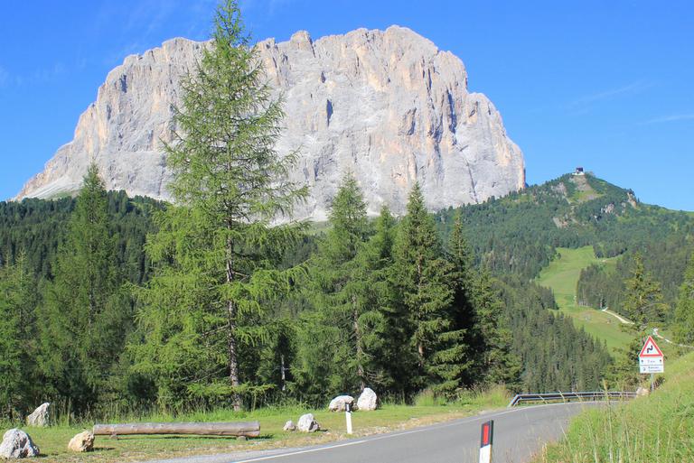 Nous reprenons la route et franchissons le col Sella del Culac à 2 018m, puis le passo di Gardena à 2 121m. Je m'arrête pour une pause photo sur le parking de ce dernier, une dame arrive immédiatement pour me faire payer le stationnement. Elle me laisse tout de même prendre ma photo et nous repartons.