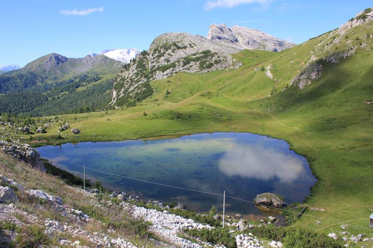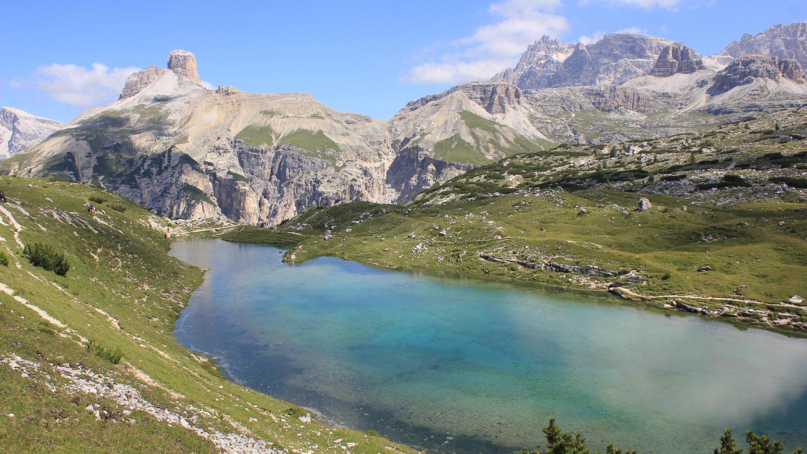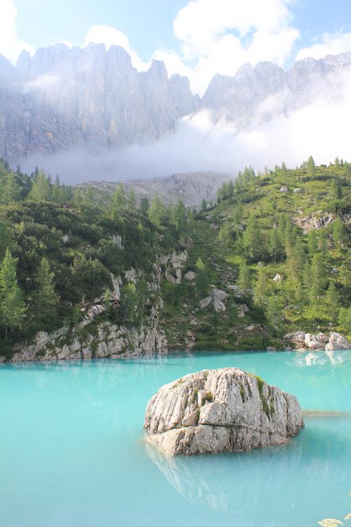 Deux heures exactement après notre départ, nous découvrons le lac di Sorapis. Il faut suivre le chemin et c'est seulement au tout dernier moment, au dernier pas, qu'apparaissent ses eaux turquoises et laiteuses. L'environnement est sauvage et parcourir le tour de celui-ci se mérite. Isa l'entreprend par le versant de la montagne Sorapis, le grand pic à 3 205m qui surplombe le lac, tandis que je pars sur le sentier de l'autre rive, à priori plus facile.