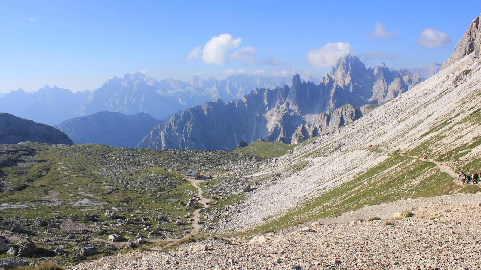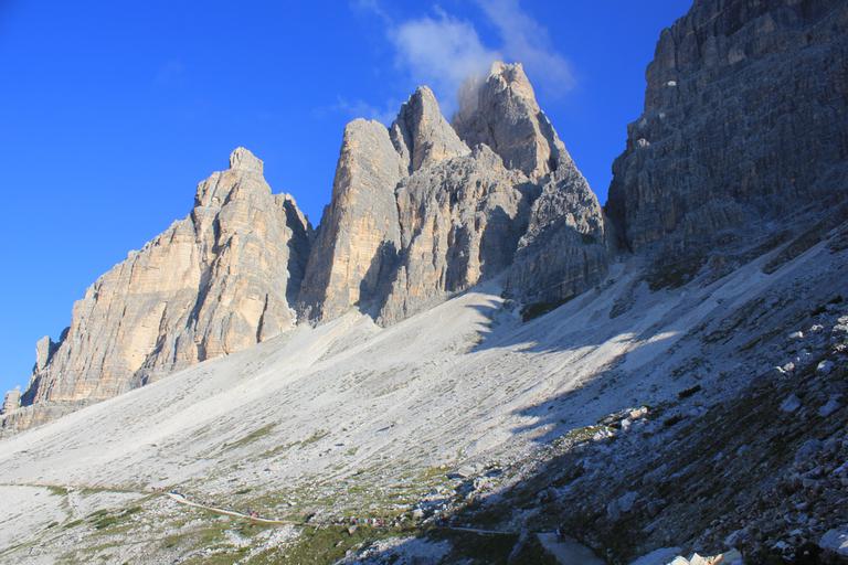 Nous commençons à marcher à 7h30. Nous passons devant le refuge Auronzo puis suivons un large chemin tracé dans les éboulis de la face sud des Tre Cime.