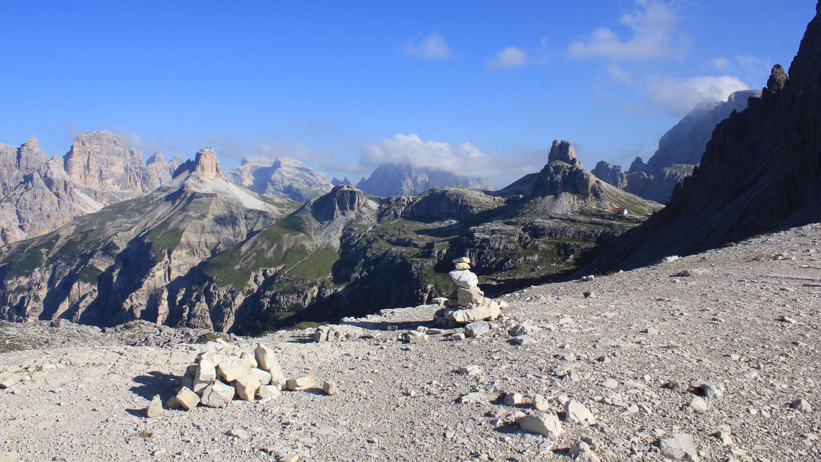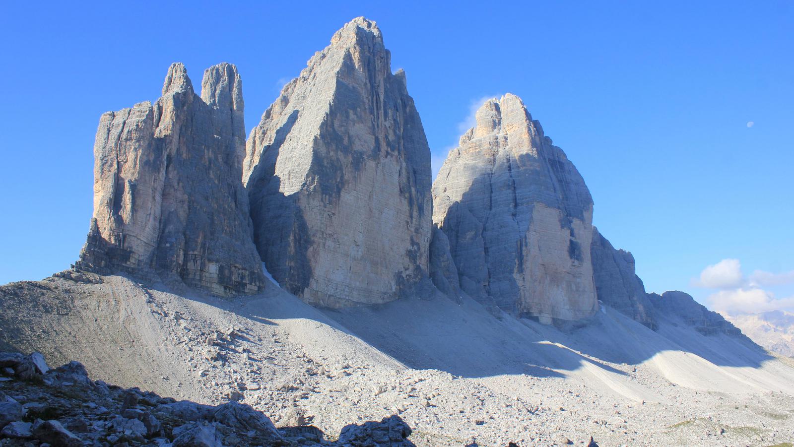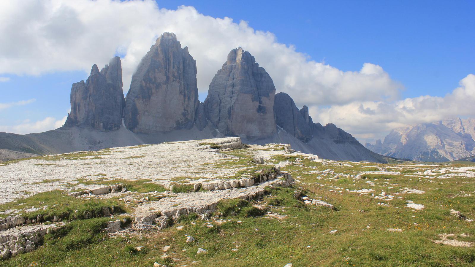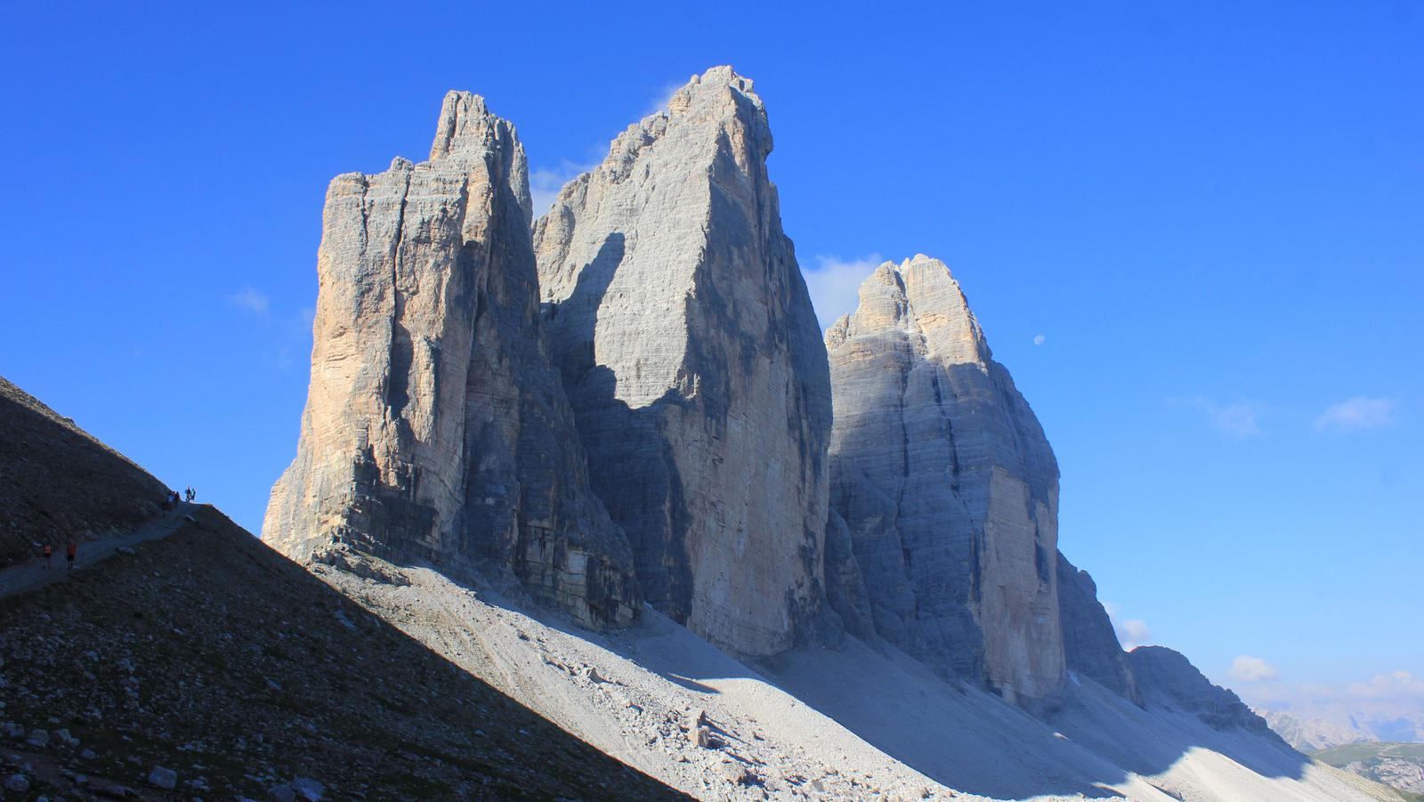 Le petit col se situe à l'extrémité est des Tre Cime. Elles sont maintenant face à nous, dans l'ordre, Piccola (2 857m), Grande (2 999m) et Ovest (2 973m).