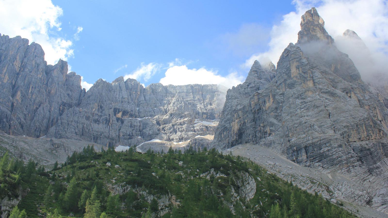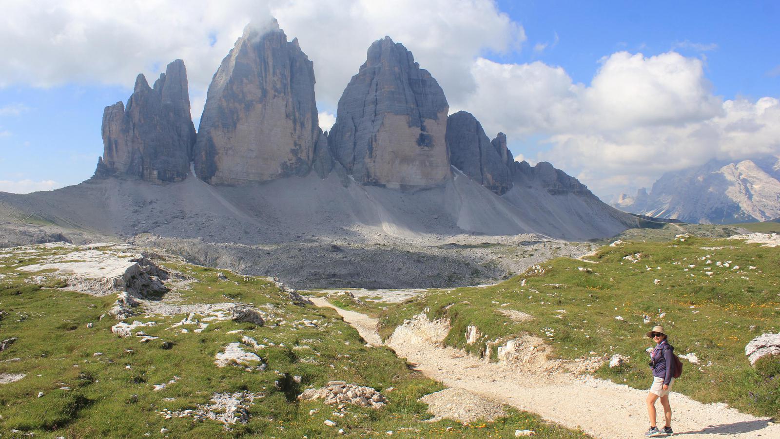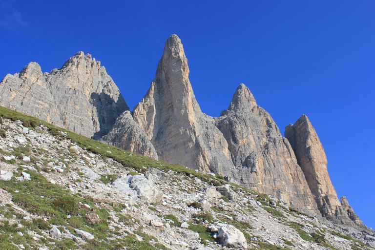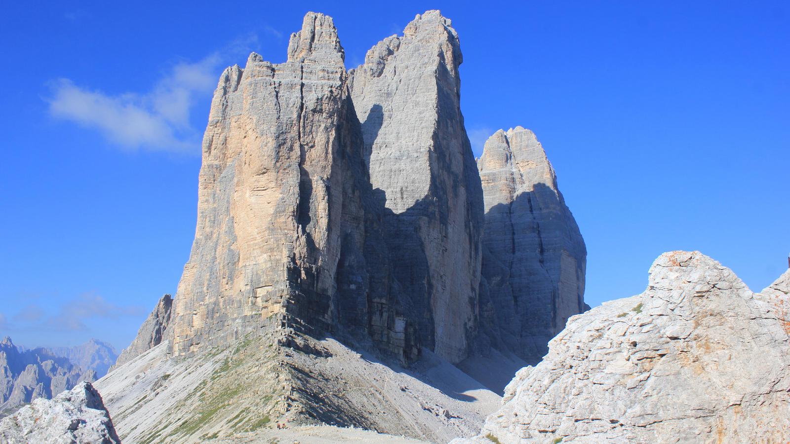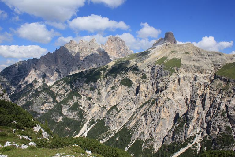 Le petit col se situe à l'extrémité est des Tre Cime. Elles sont maintenant face à nous, dans l'ordre, Piccola (2 857m), Grande (2 999m) et Ovest (2 973m).